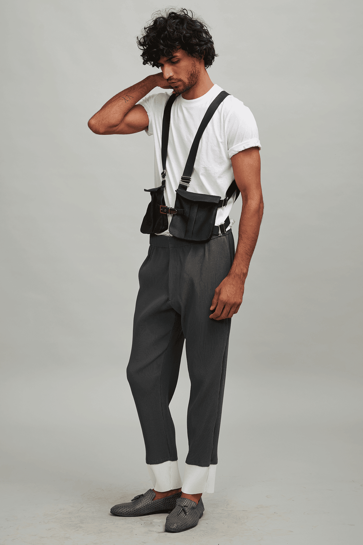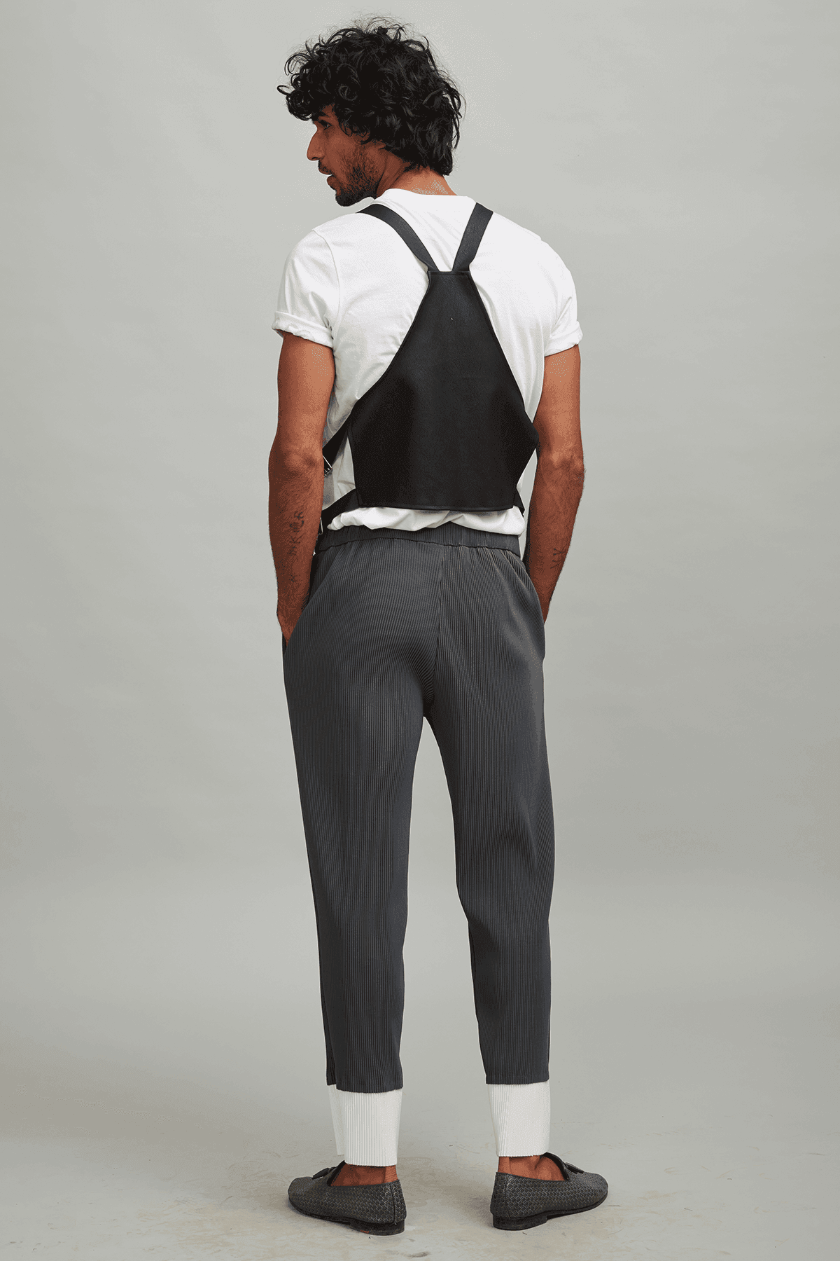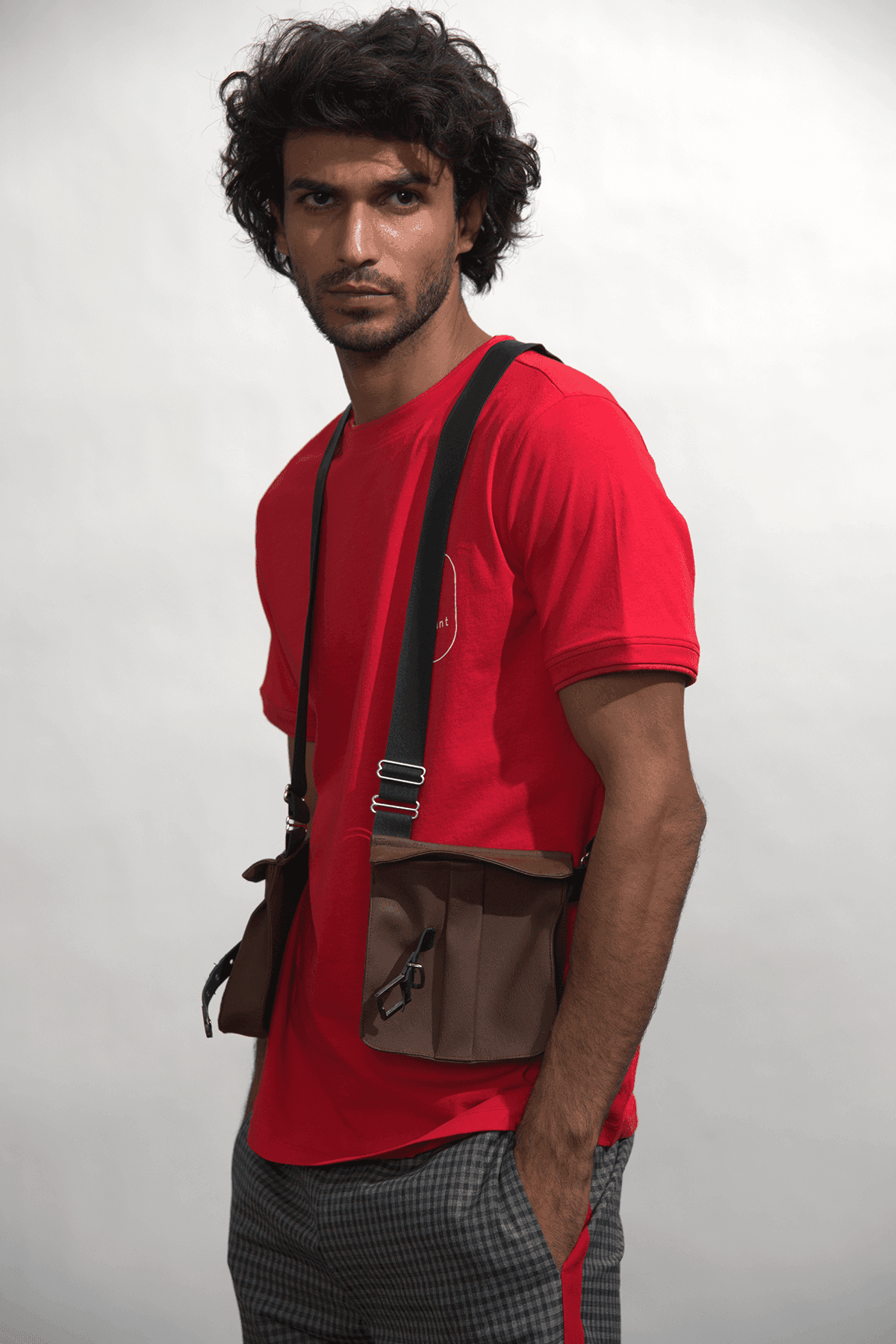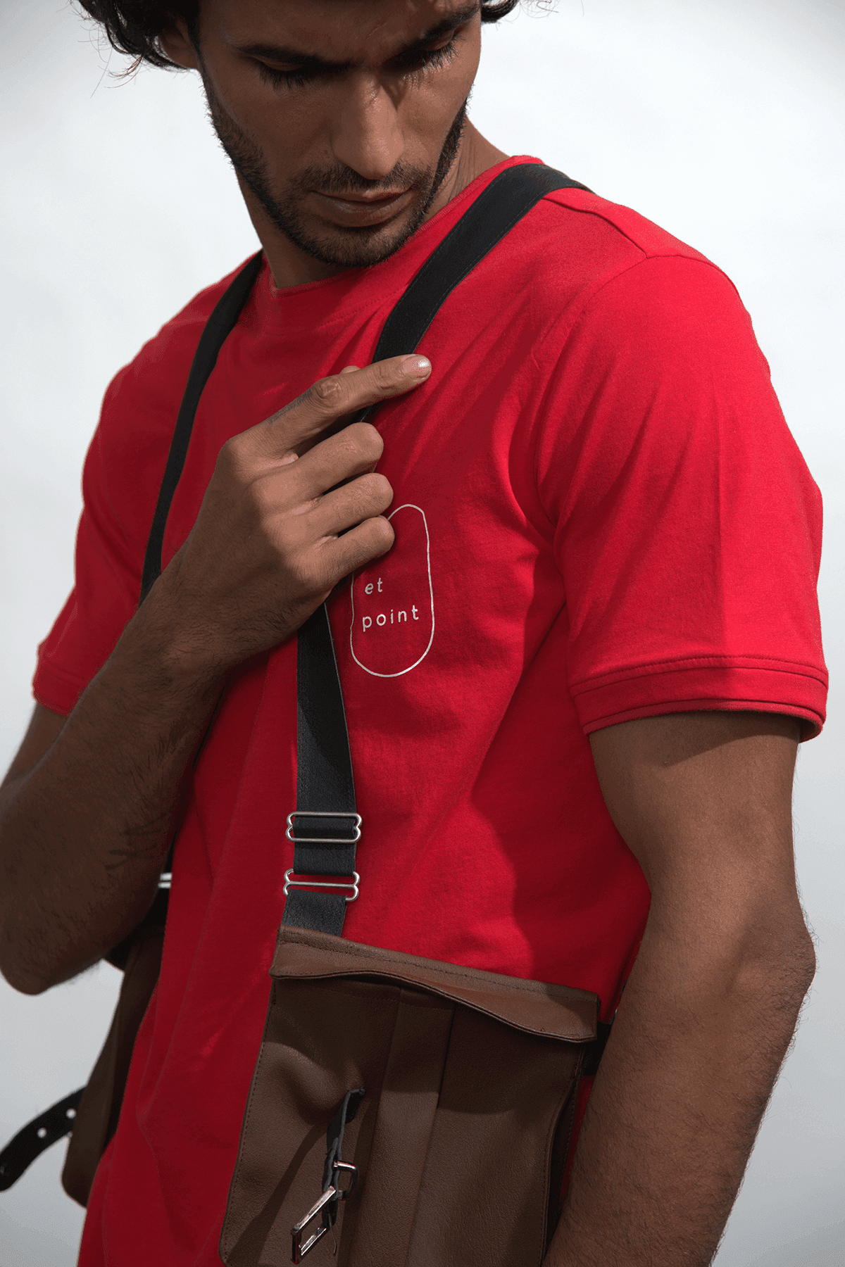 Utility harness made of vegan leather. Ideal for travel, toolkits, or everyday work. 2 large sized pockets in the front, adjustable straps on the shoulder and waist. Buckle front.