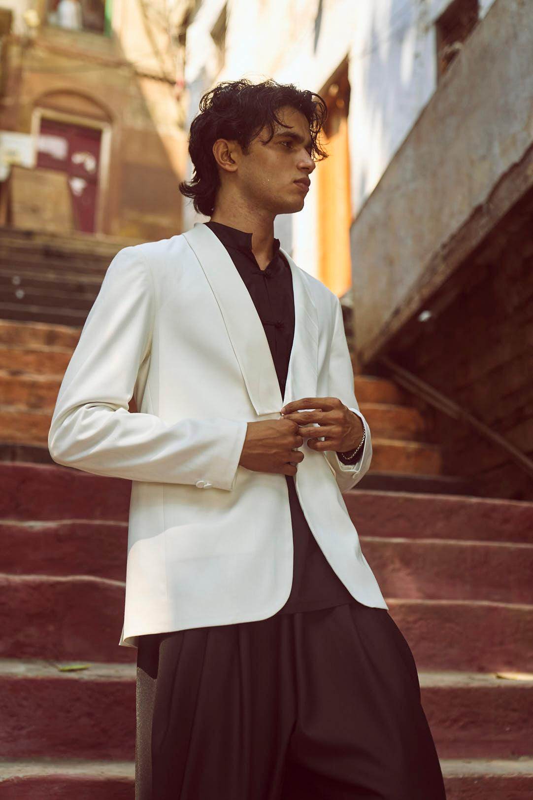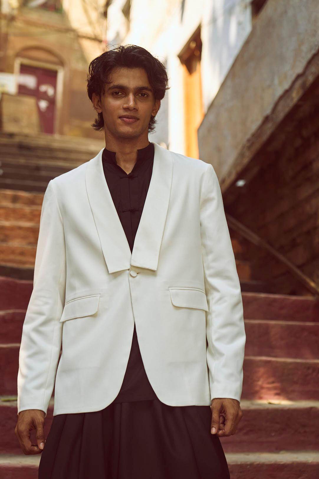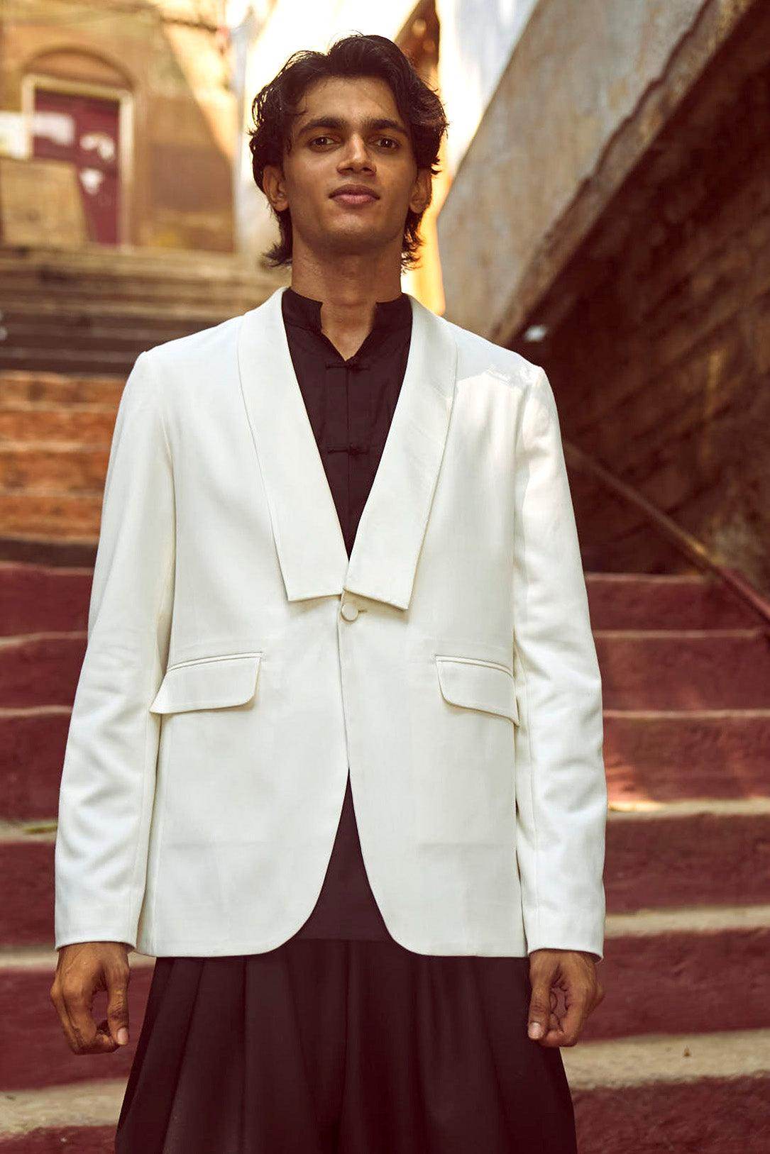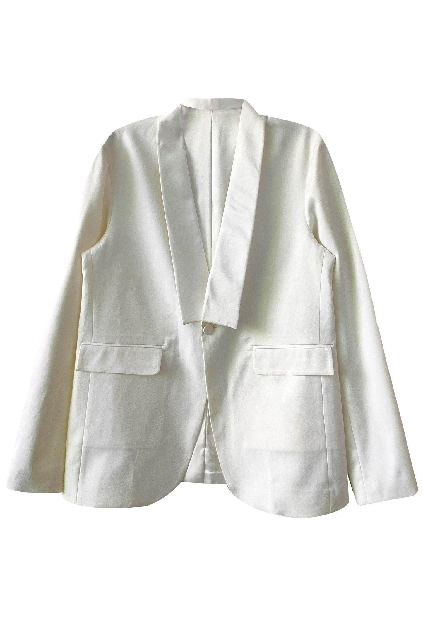 White Tuxedo with a detached shawl collar in satin. Single self-fabric button closure and flap pockets at the front. Long sleeves. Vents at the back. Satin fabric show buttons at the cuffs. The garment is semi-fused and fully lined.
