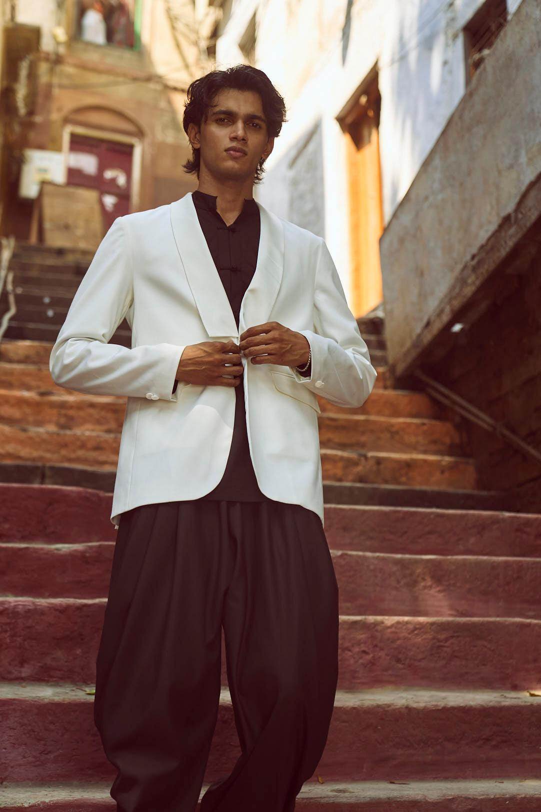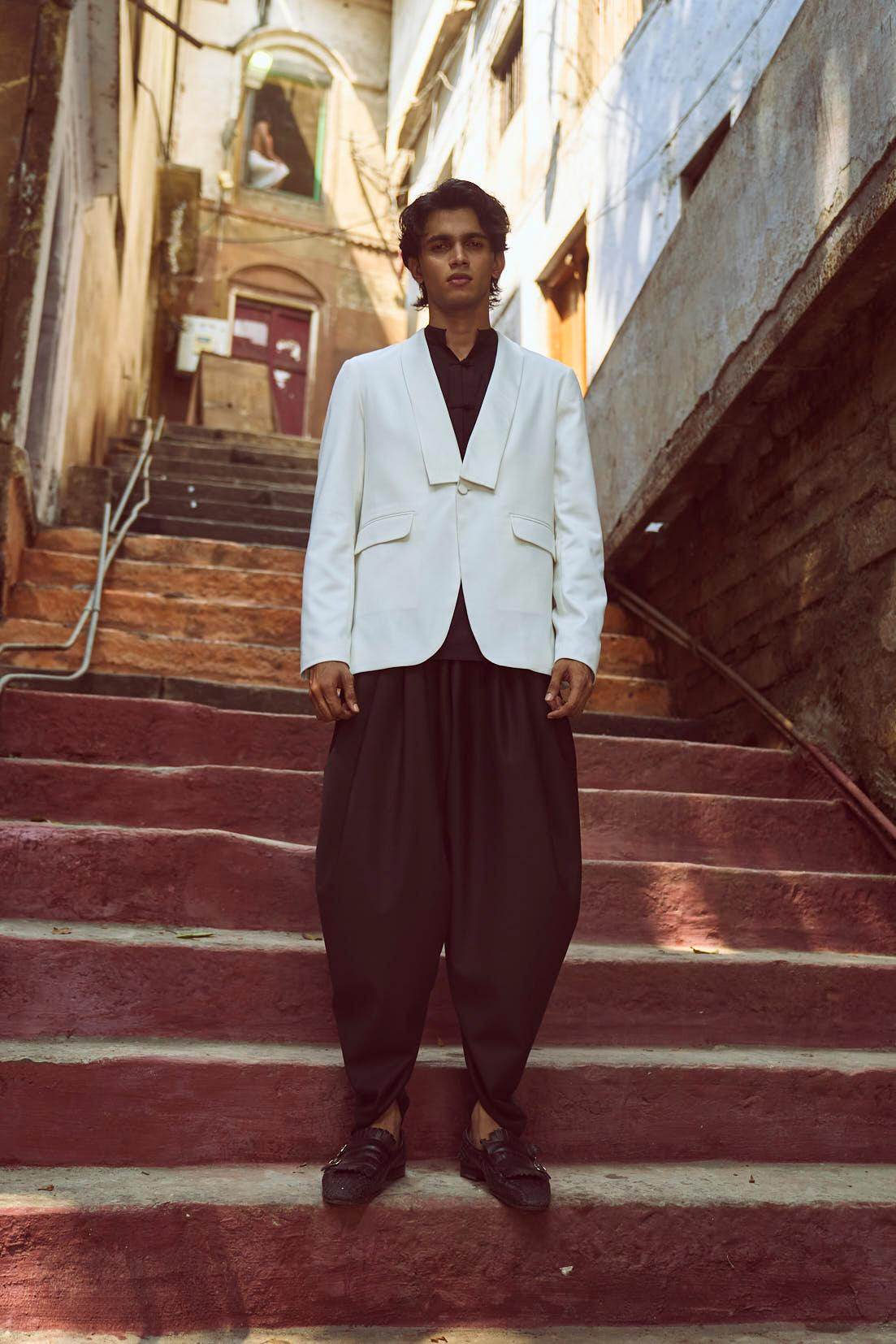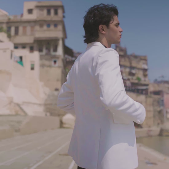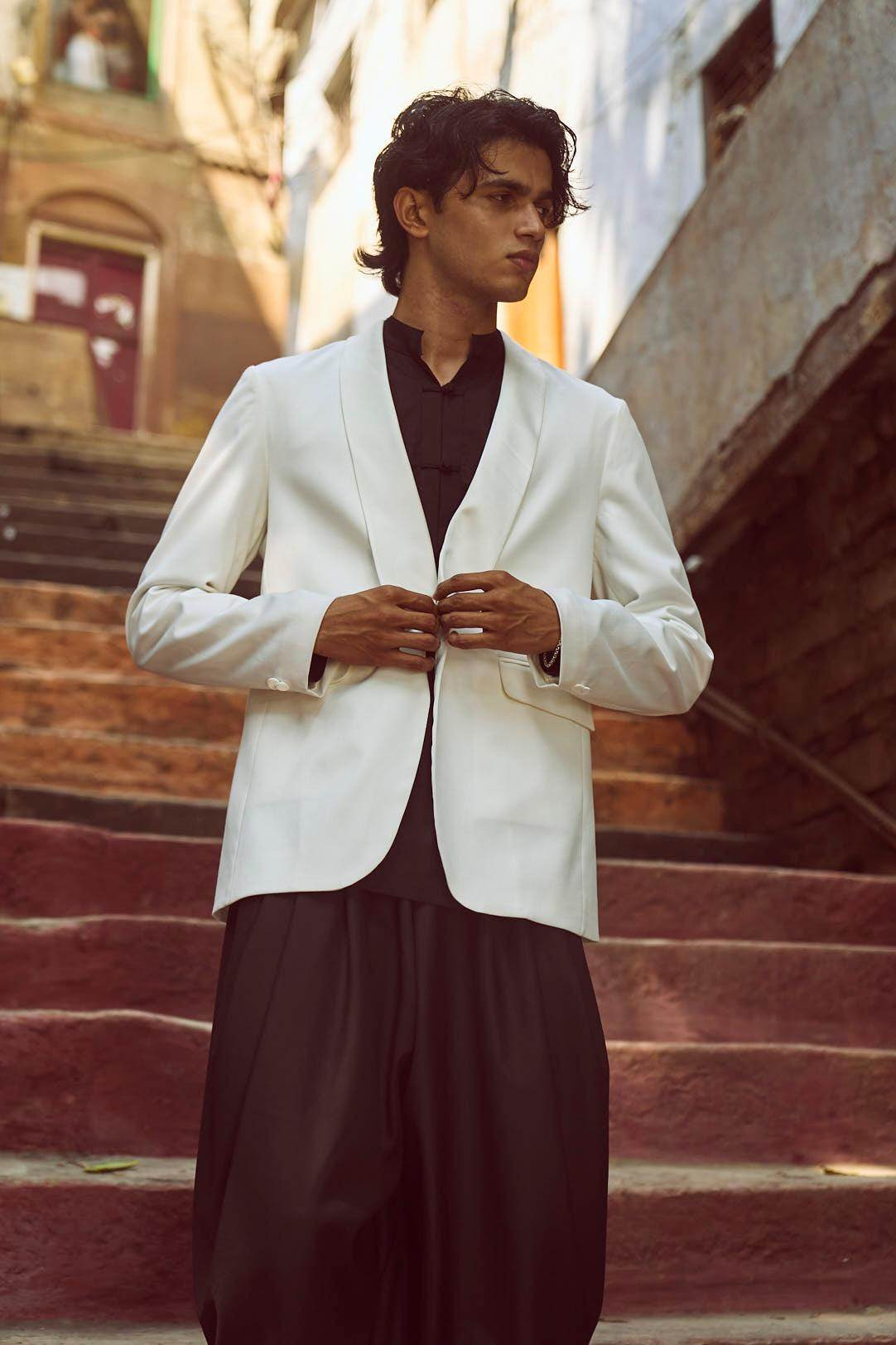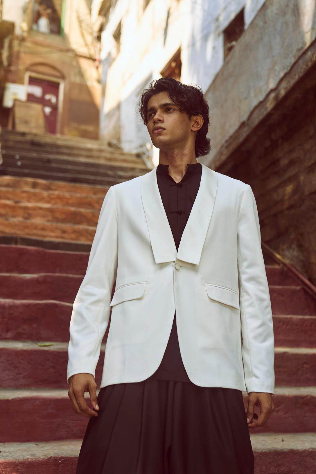 White Tuxedo with a detached shawl collar in satin. Single self-fabric button closure and flap pockets at the front. Long sleeves. Vents at the back. Satin fabric show buttons at the cuffs. The garment is semi-fused and fully lined.