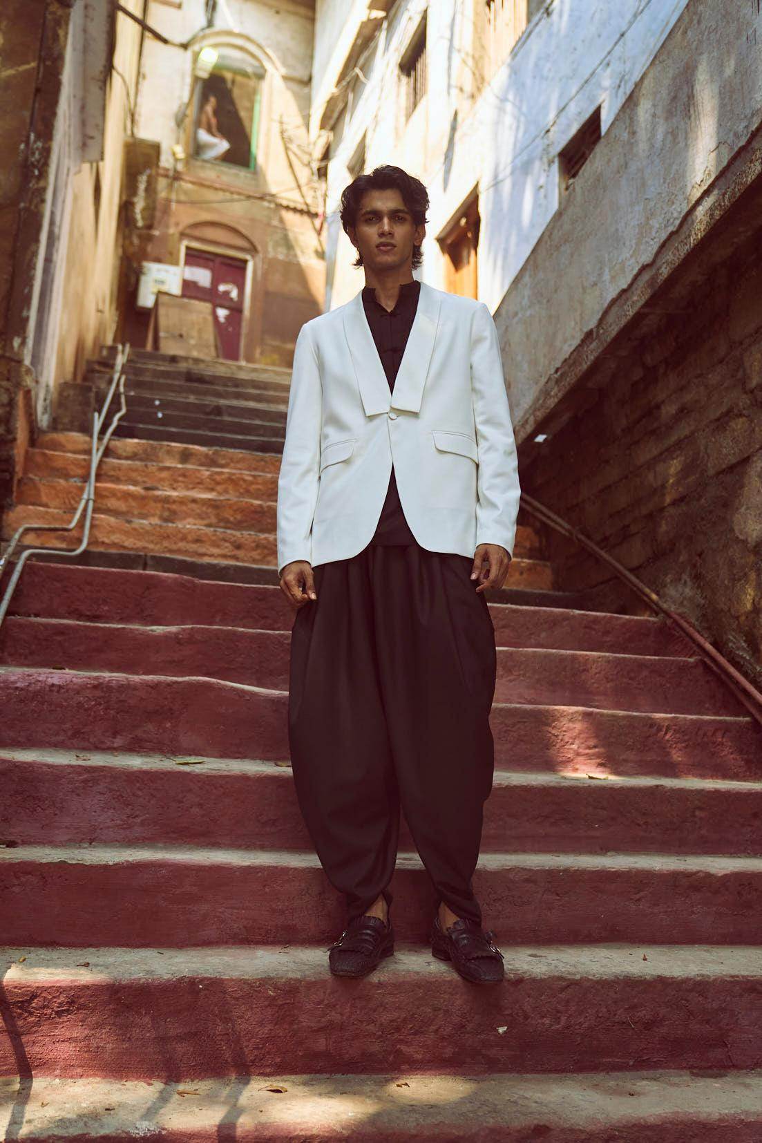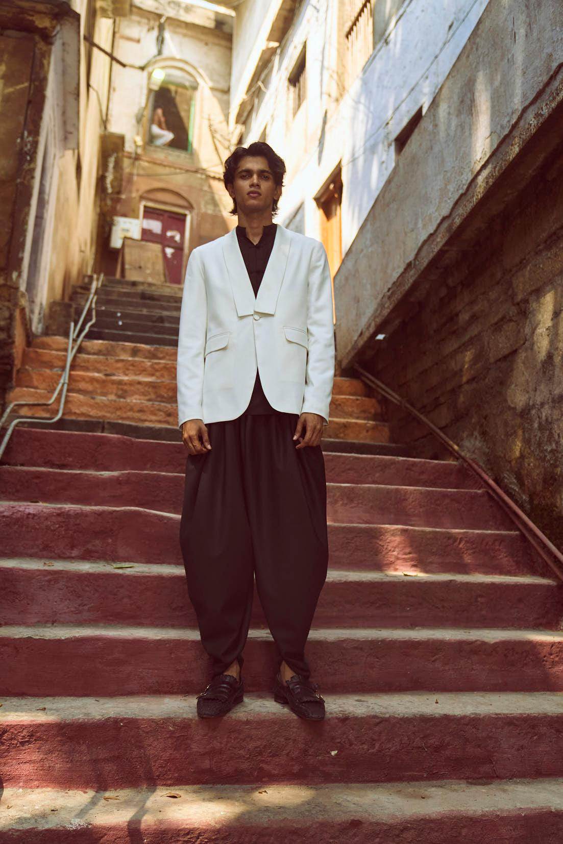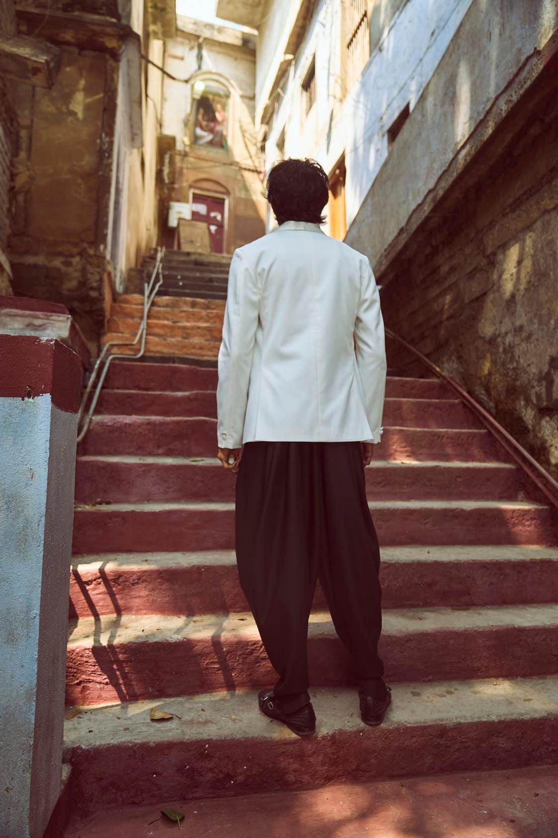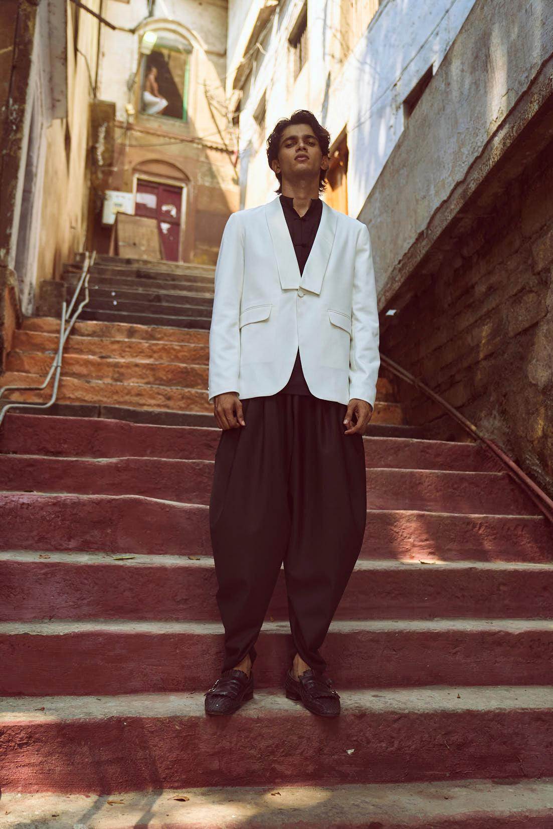 White Tuxedo with a detached shawl collar in satin. Single self-fabric button closure and flap pockets at the front. Long sleeves. Vents at the back. Satin fabric show buttons at the cuffs. The garment is semi-fused and fully lined.