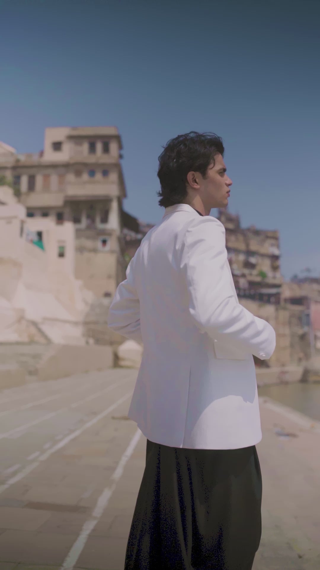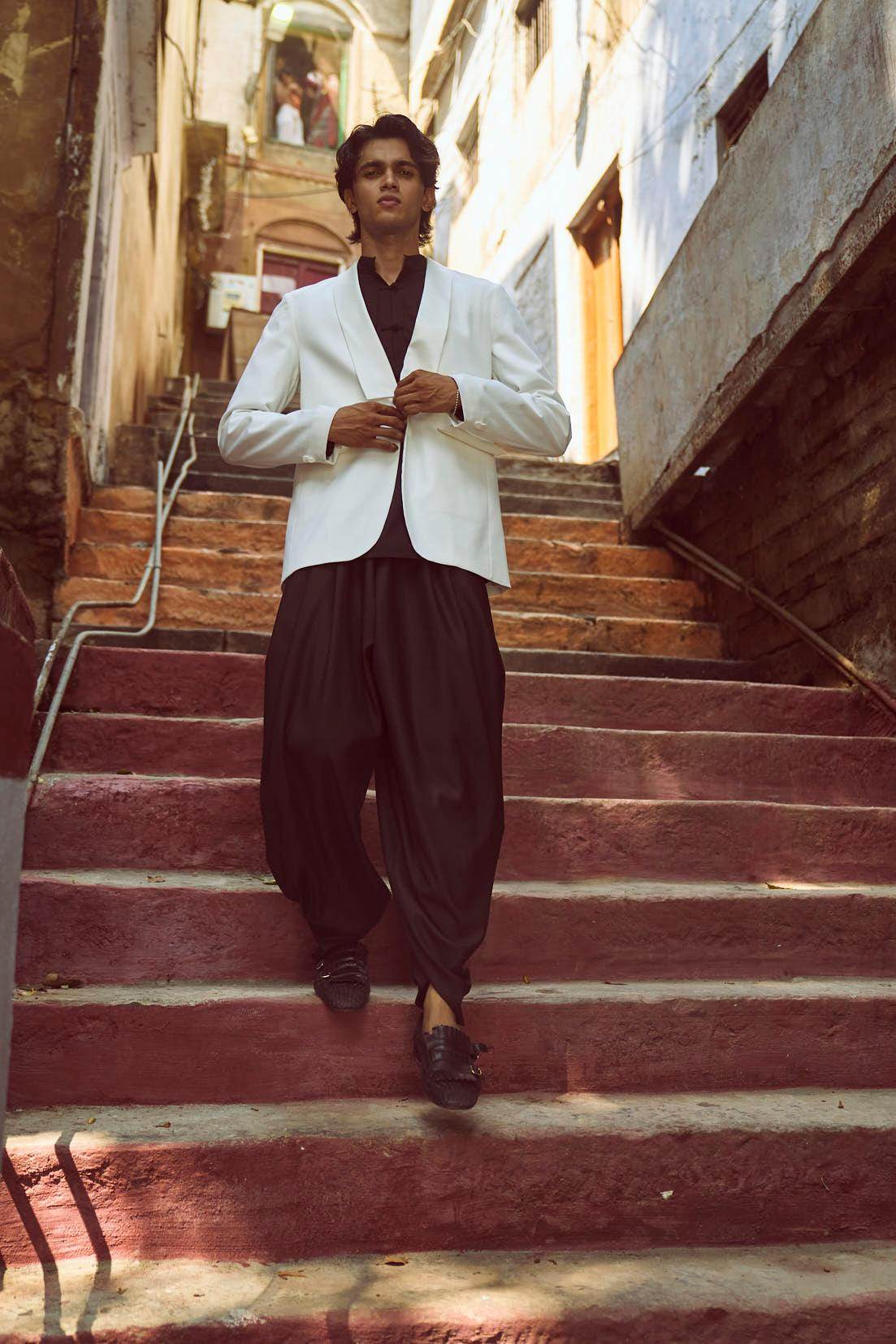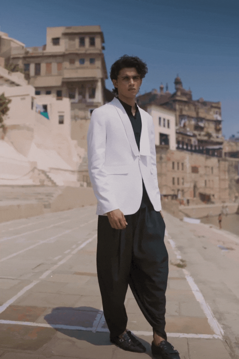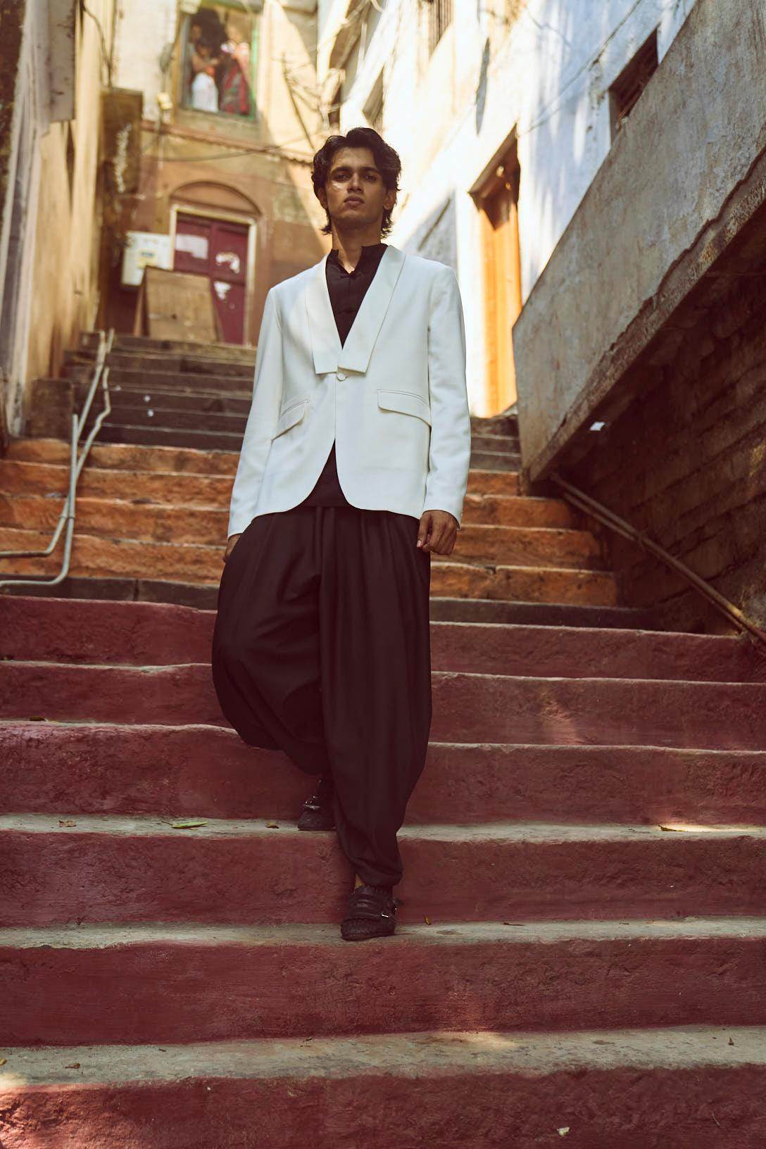 White Tuxedo with a detached shawl collar in satin. Single self-fabric button closure and flap pockets at the front. Long sleeves. Vents at the back. Satin fabric show buttons at the cuffs. The garment is semi-fused and fully lined.