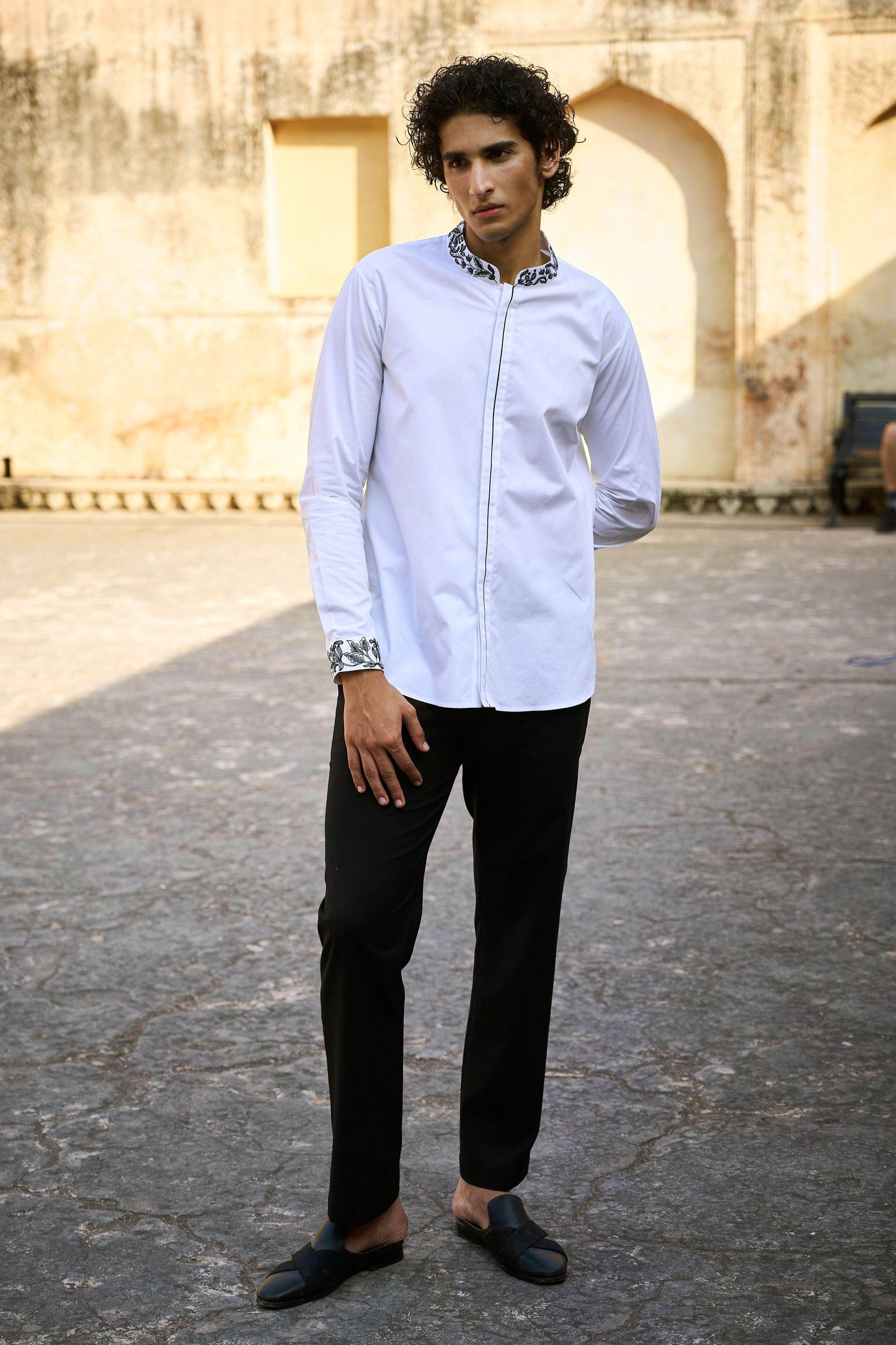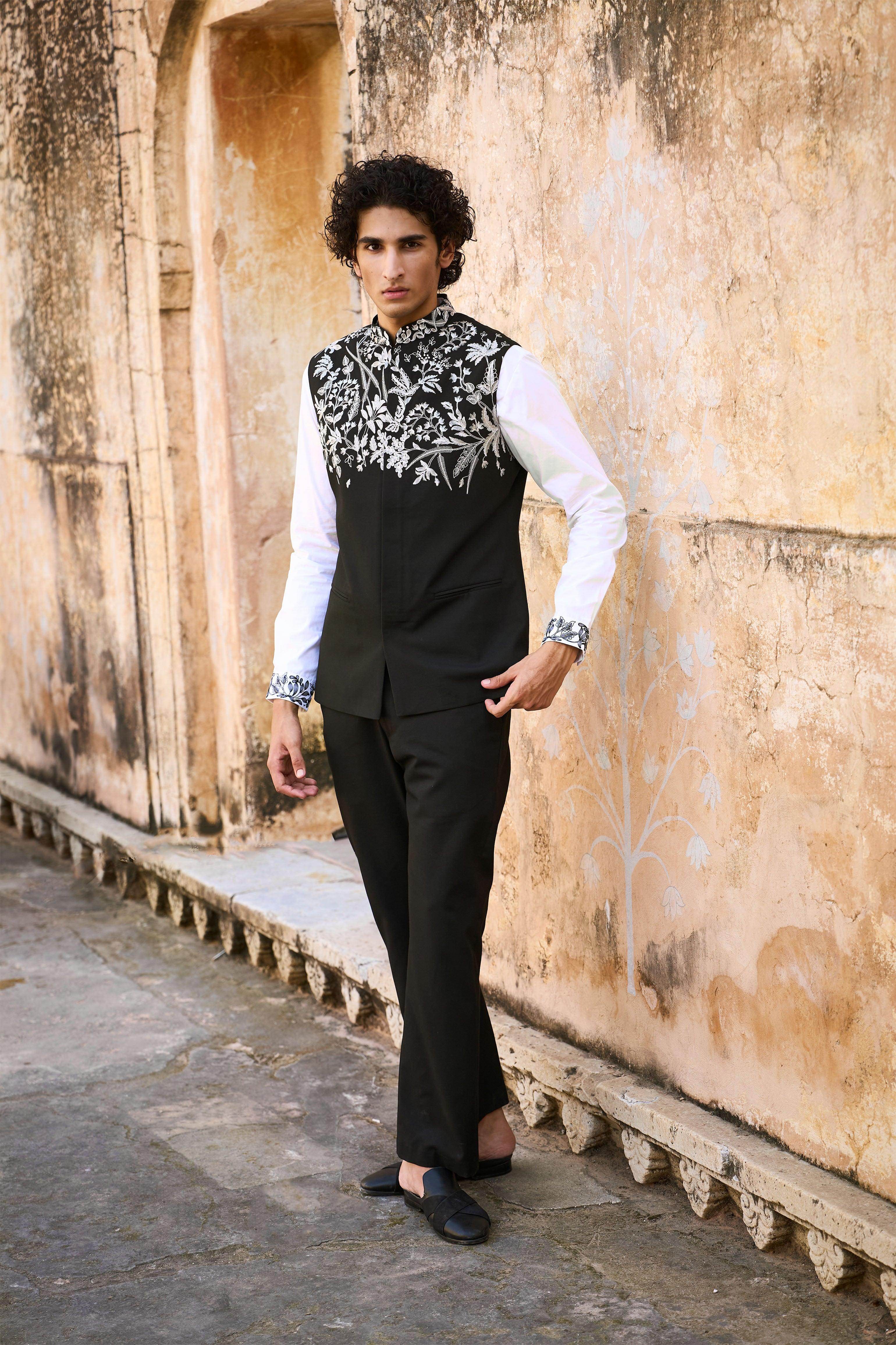Black straight cut pants in all weather suiting material. Pockets in the sides and back. Belt loops at the waist, snap button and zip closure in the front.