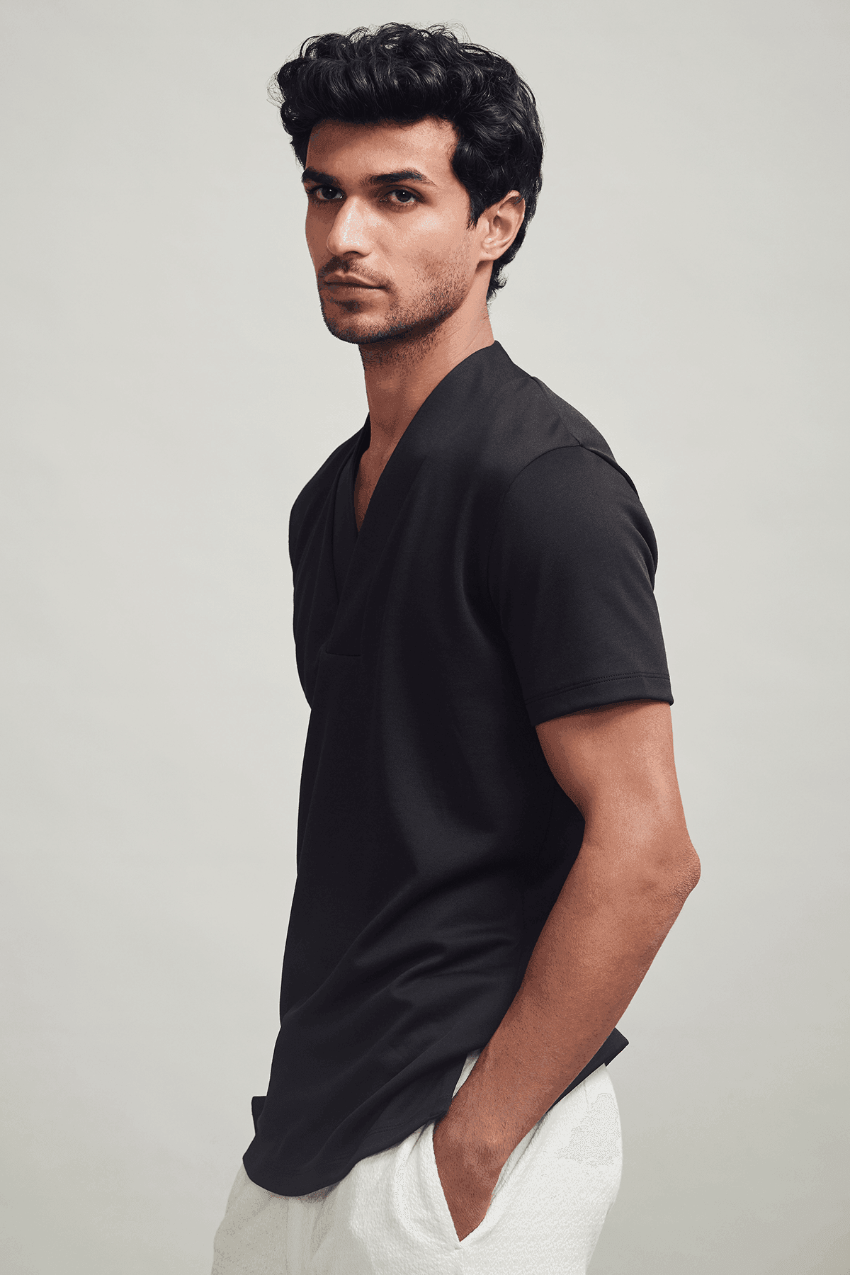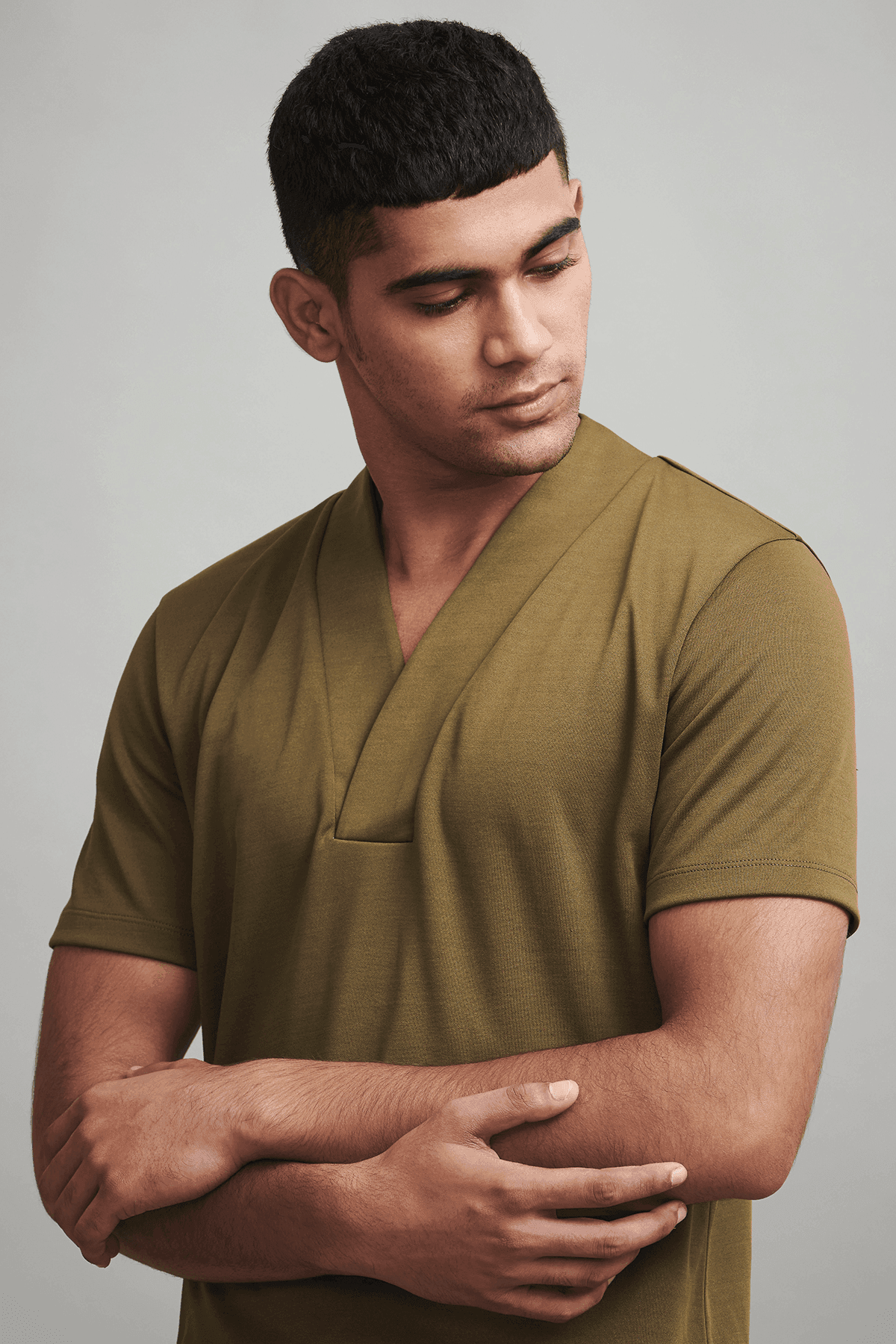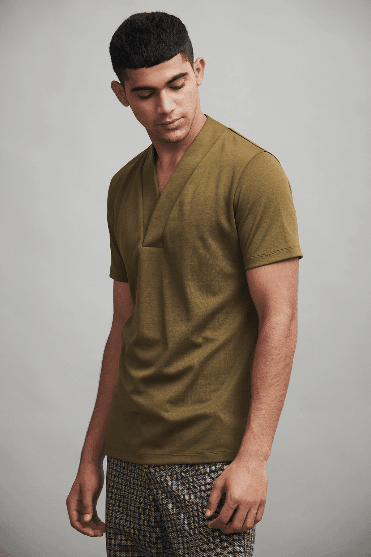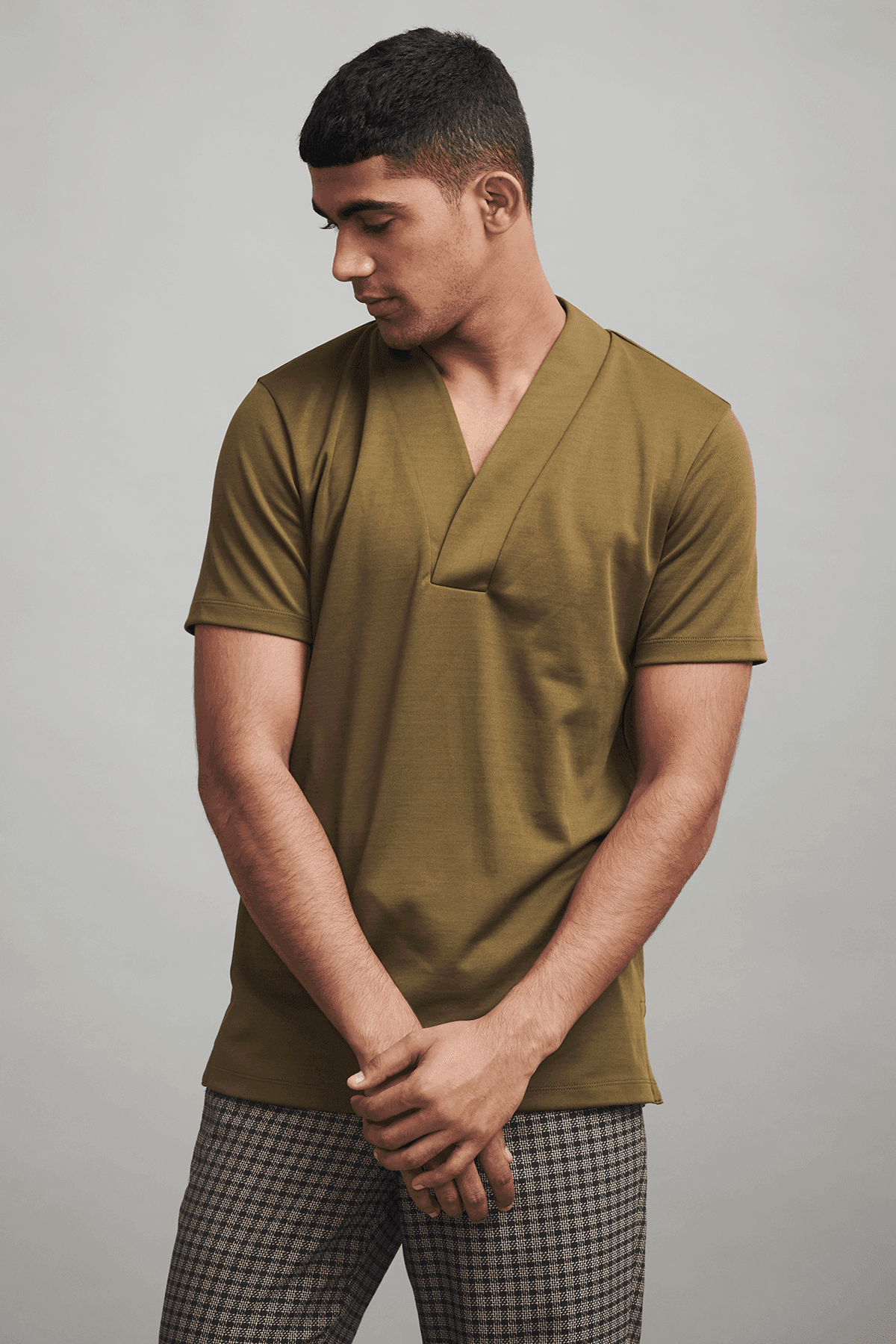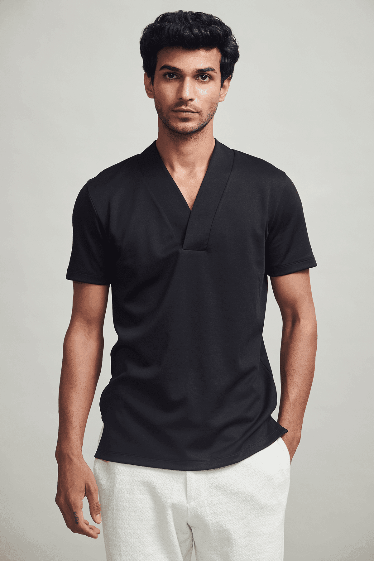 Overlap V neck polo in sustainably sourced, recycled polyester, and Pima cotton blend.