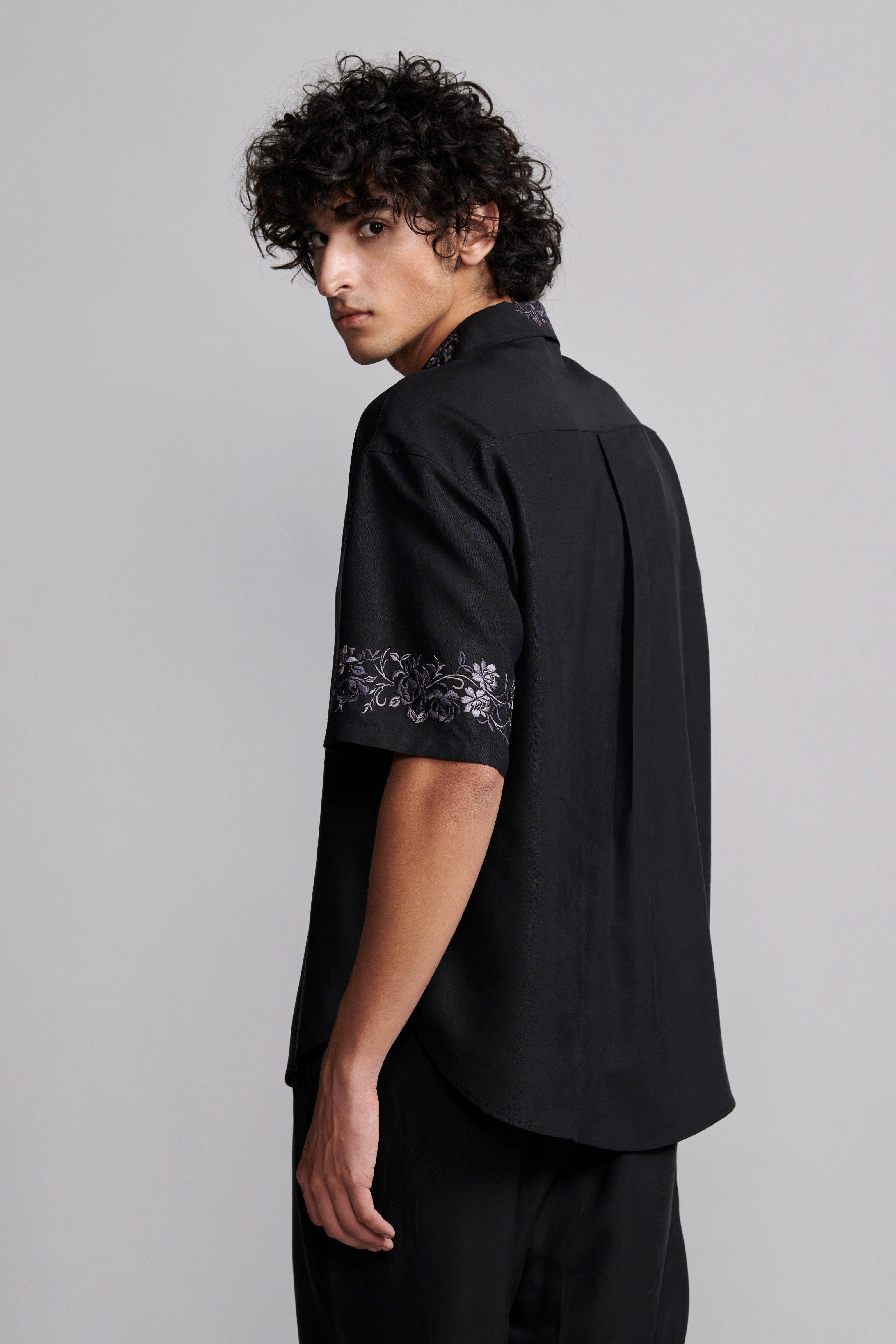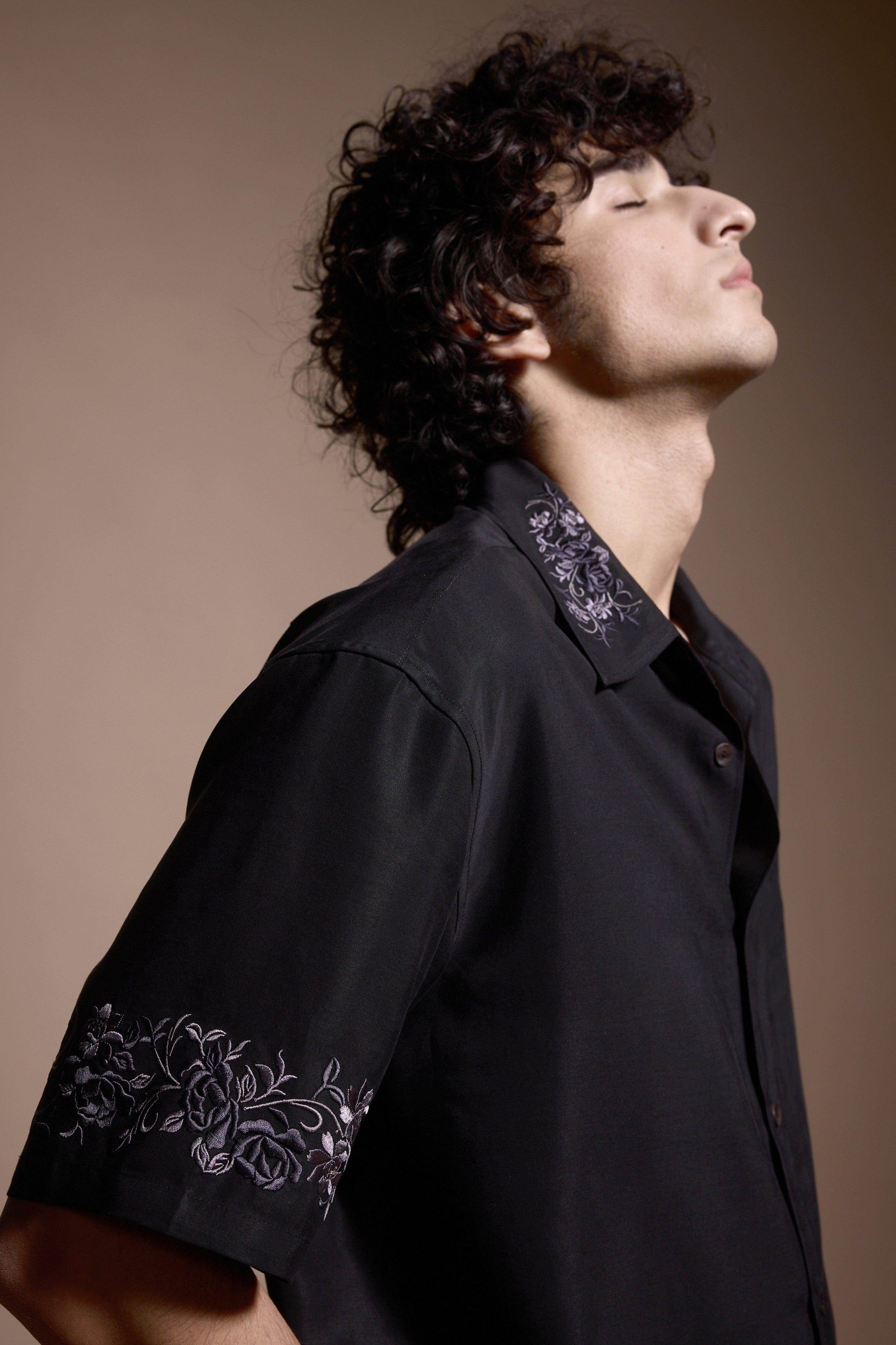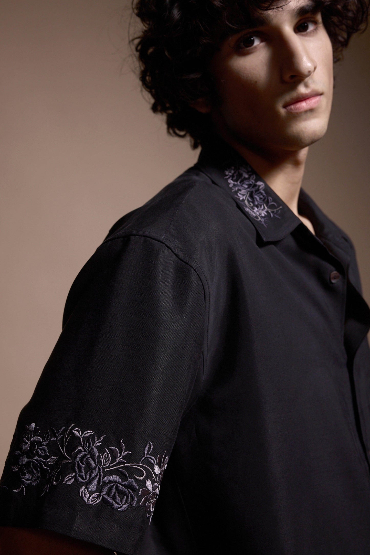 Black half sleeve shirt in sustainable, breathable Tencel. Features tonal metallic floral embroidery on the sleeve cuffs and collar. Button-down front with a box pleat in the back. Relaxed fit.