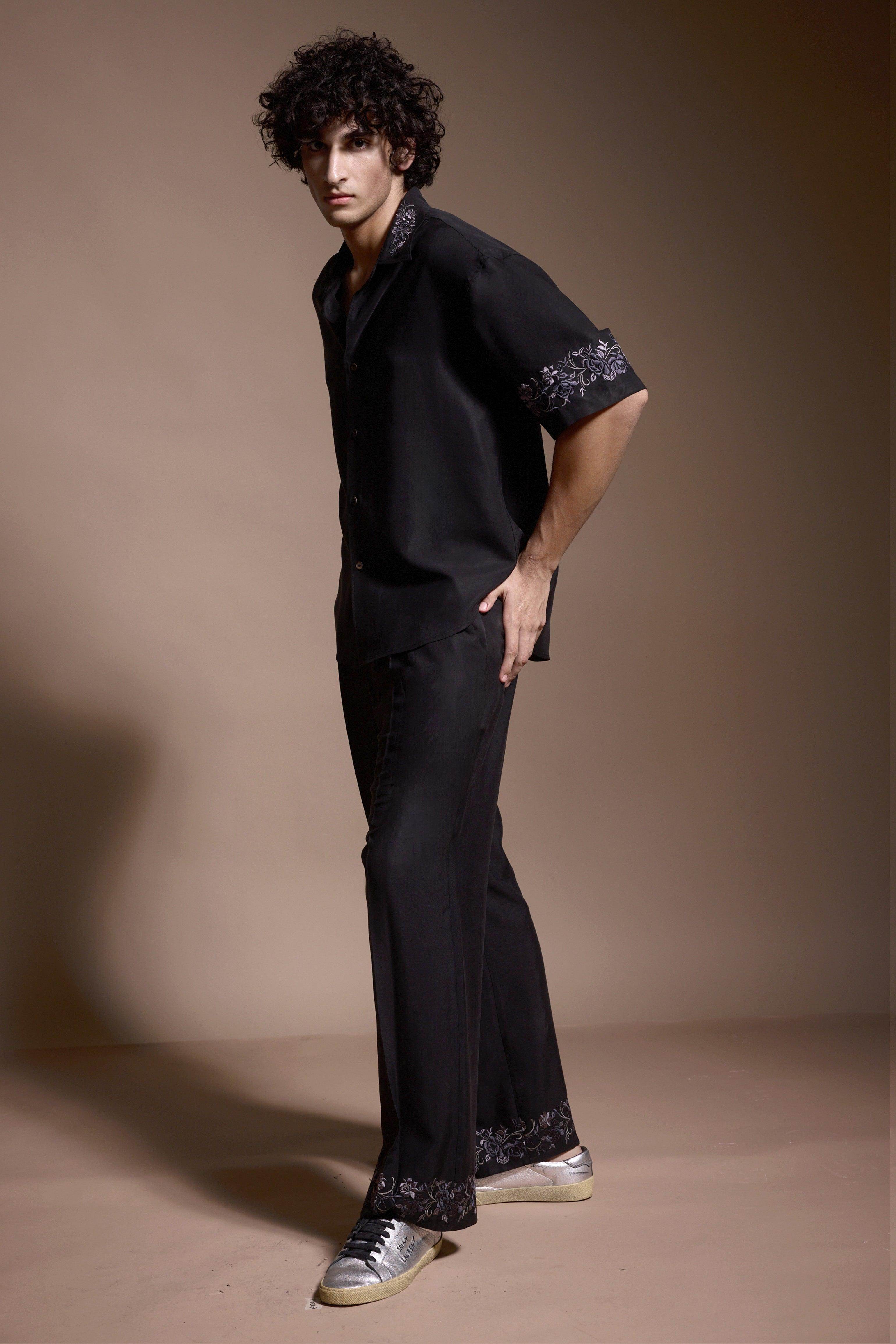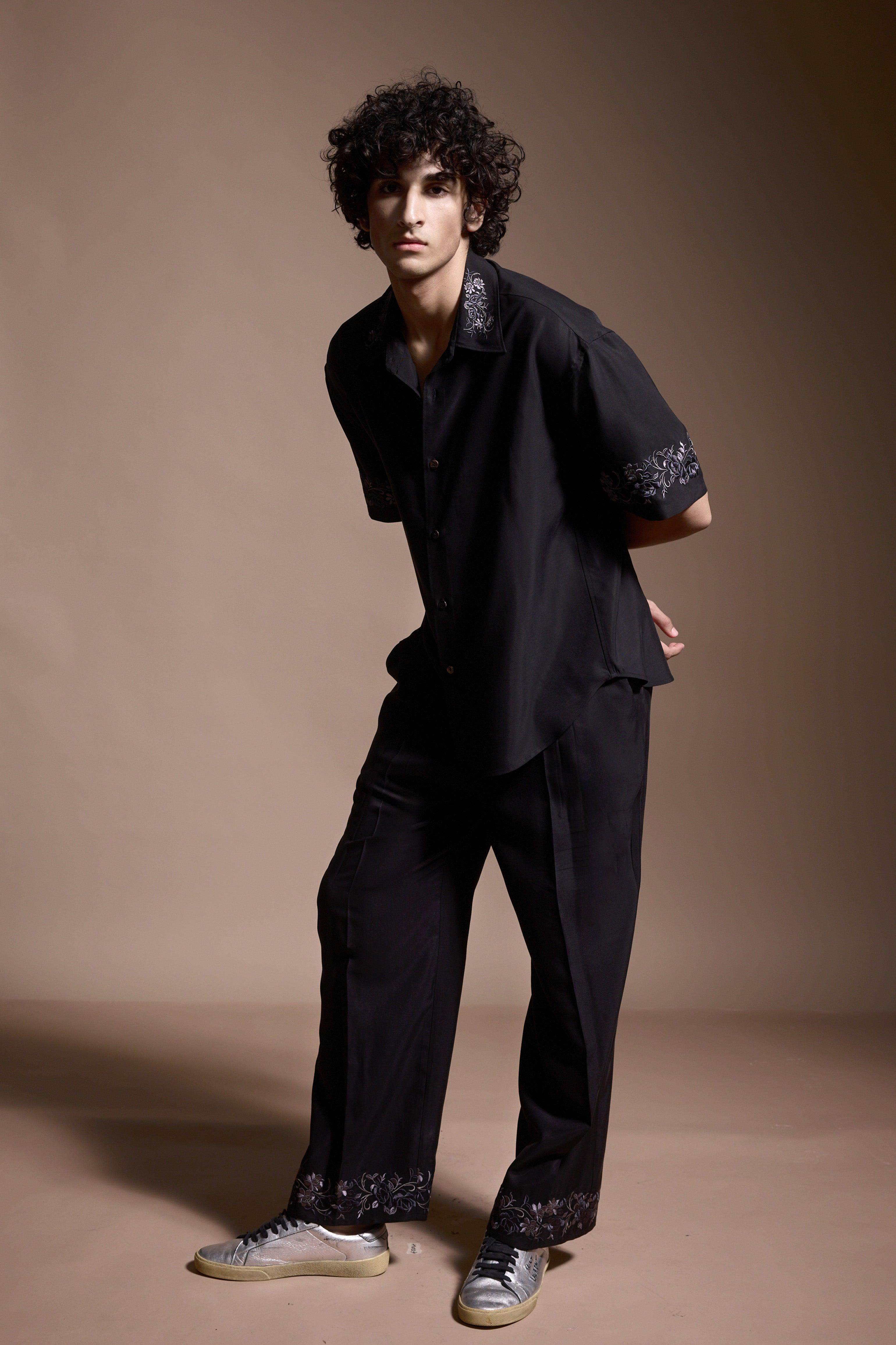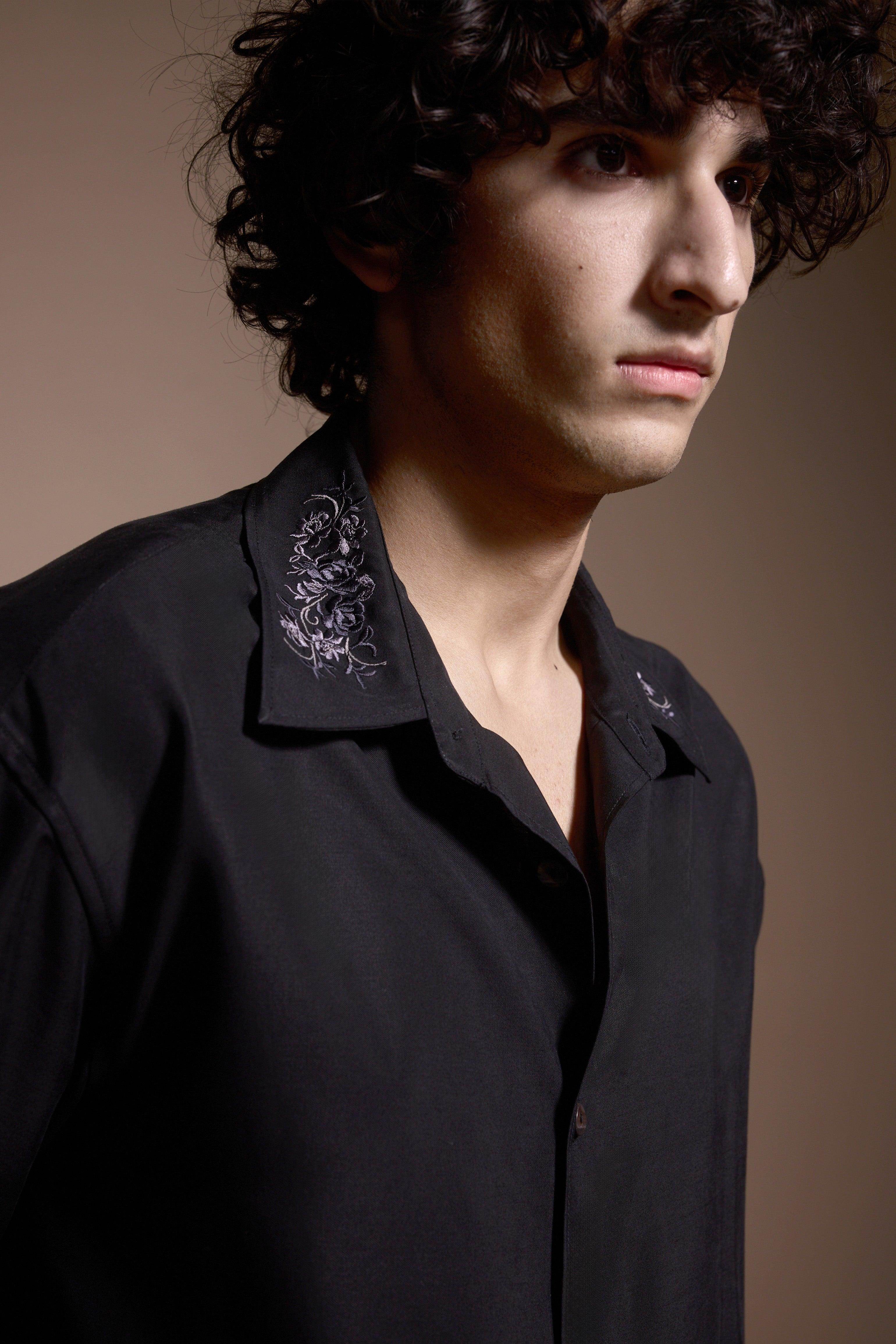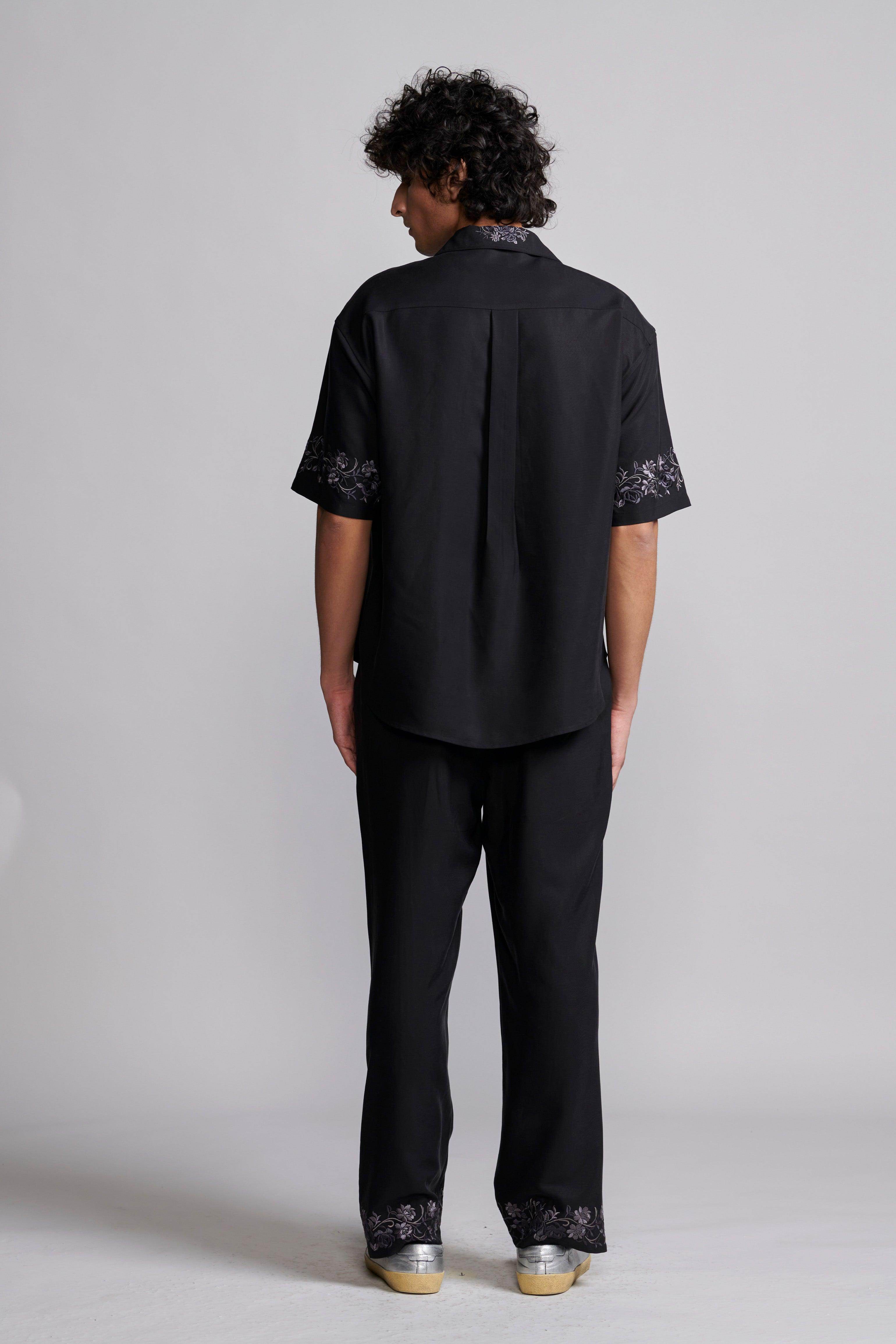 Black half sleeve shirt in sustainable, breathable Tencel. Features tonal metallic floral embroidery on the sleeve cuffs and collar. Button-down front with a box pleat in the back. Relaxed fit.