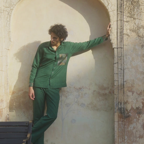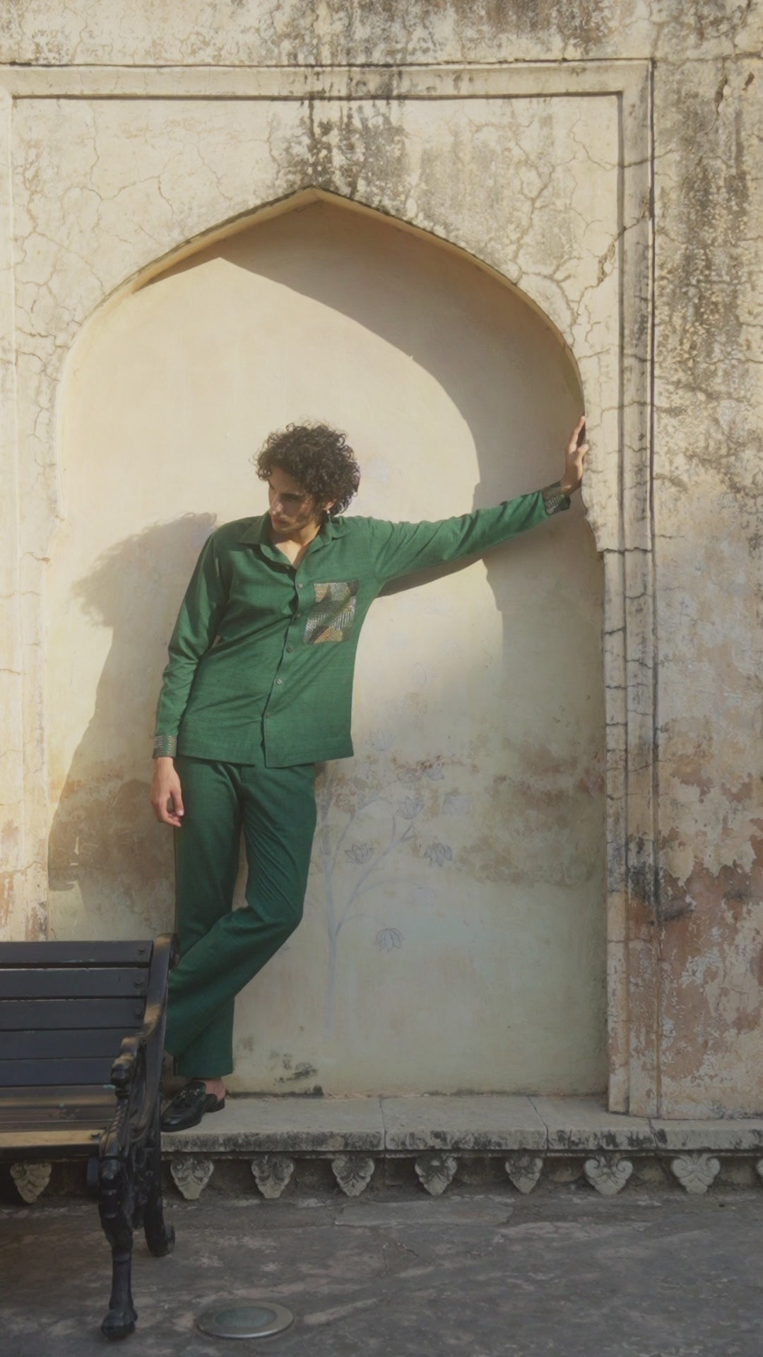 Textured slub shirt in emerald green with contrast earth toned kantha stitch detailing on the pocket and sleeve cuff. Full sleeves, relaxed fit. Full front button down.