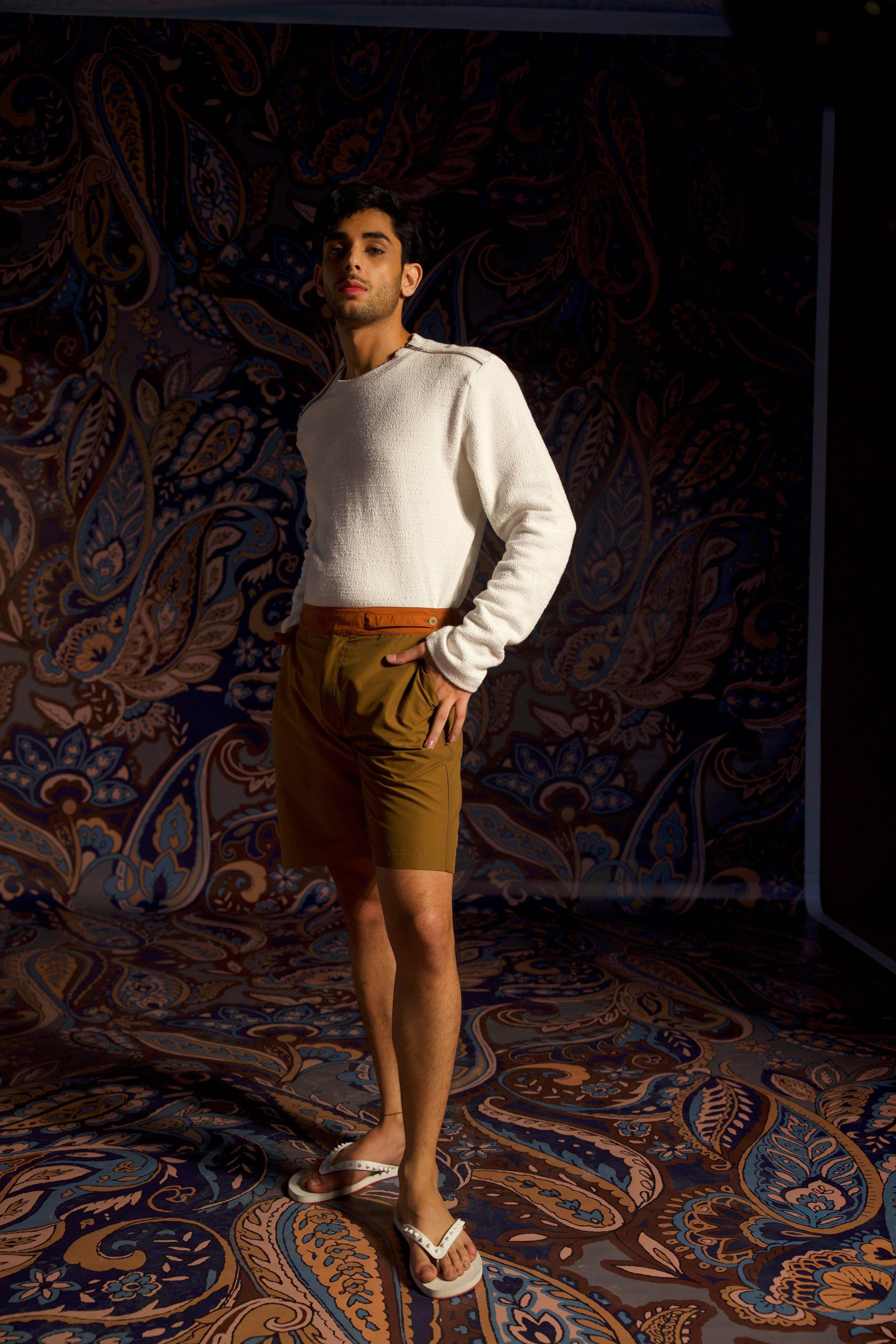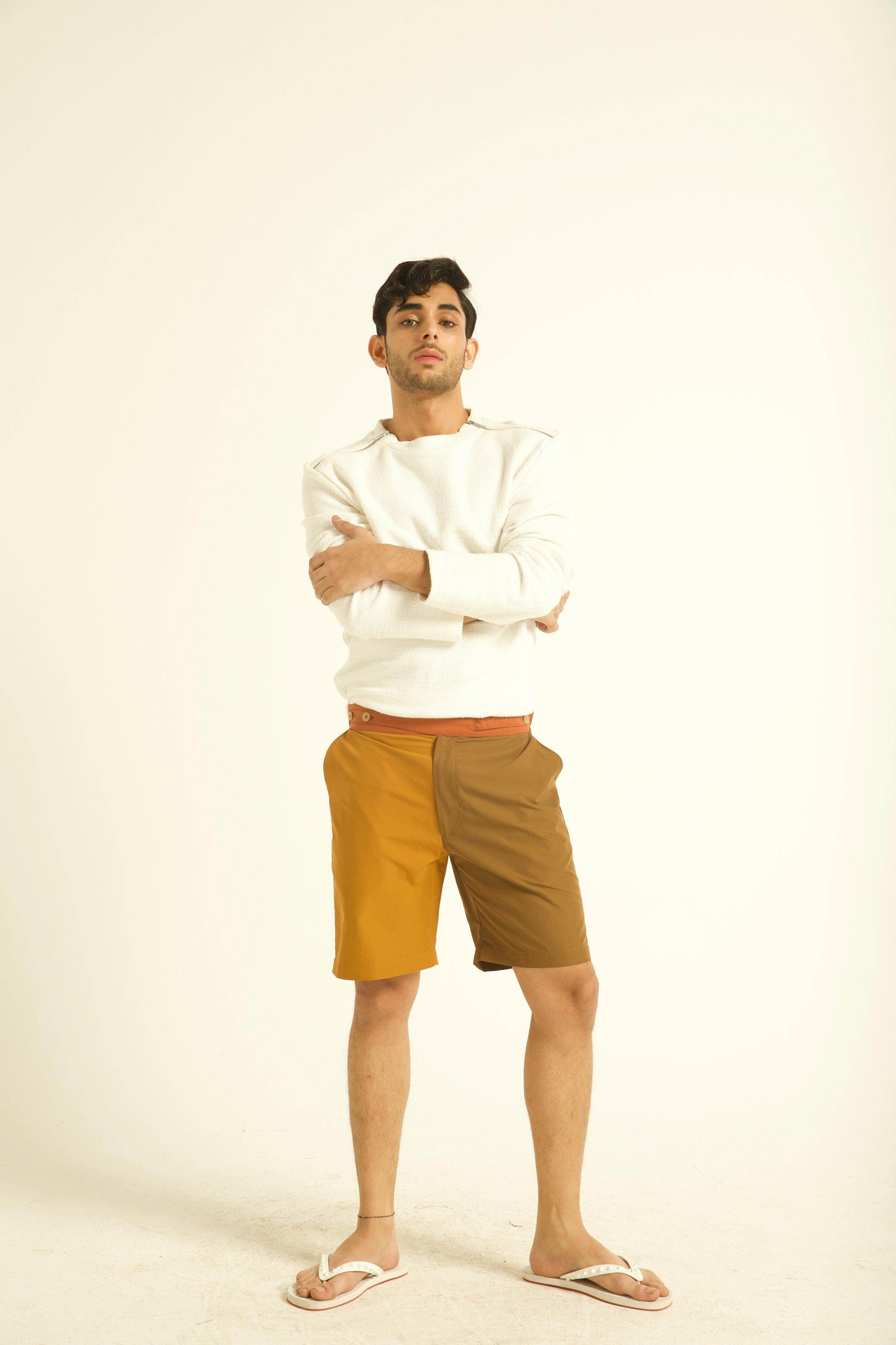 Color-blocked khaki/ mustard/ rust swim shorts. Semi elasticated with pockets on the side and back. Overlapping button detailing at the waist. Zipper closure.
