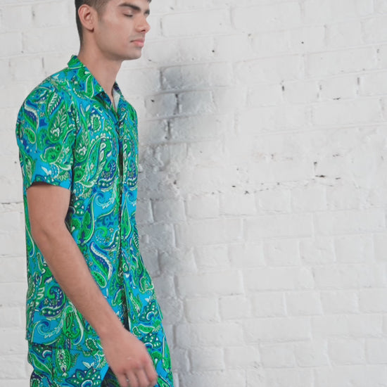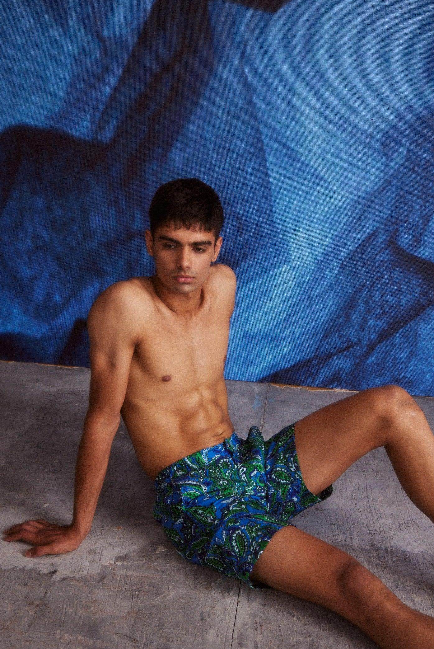 Allover paisley printed swim shorts in tones of blue and green. Snap metal button closure at the front, zip fly. Elasticated at the waist. Pockets on the sides and back.