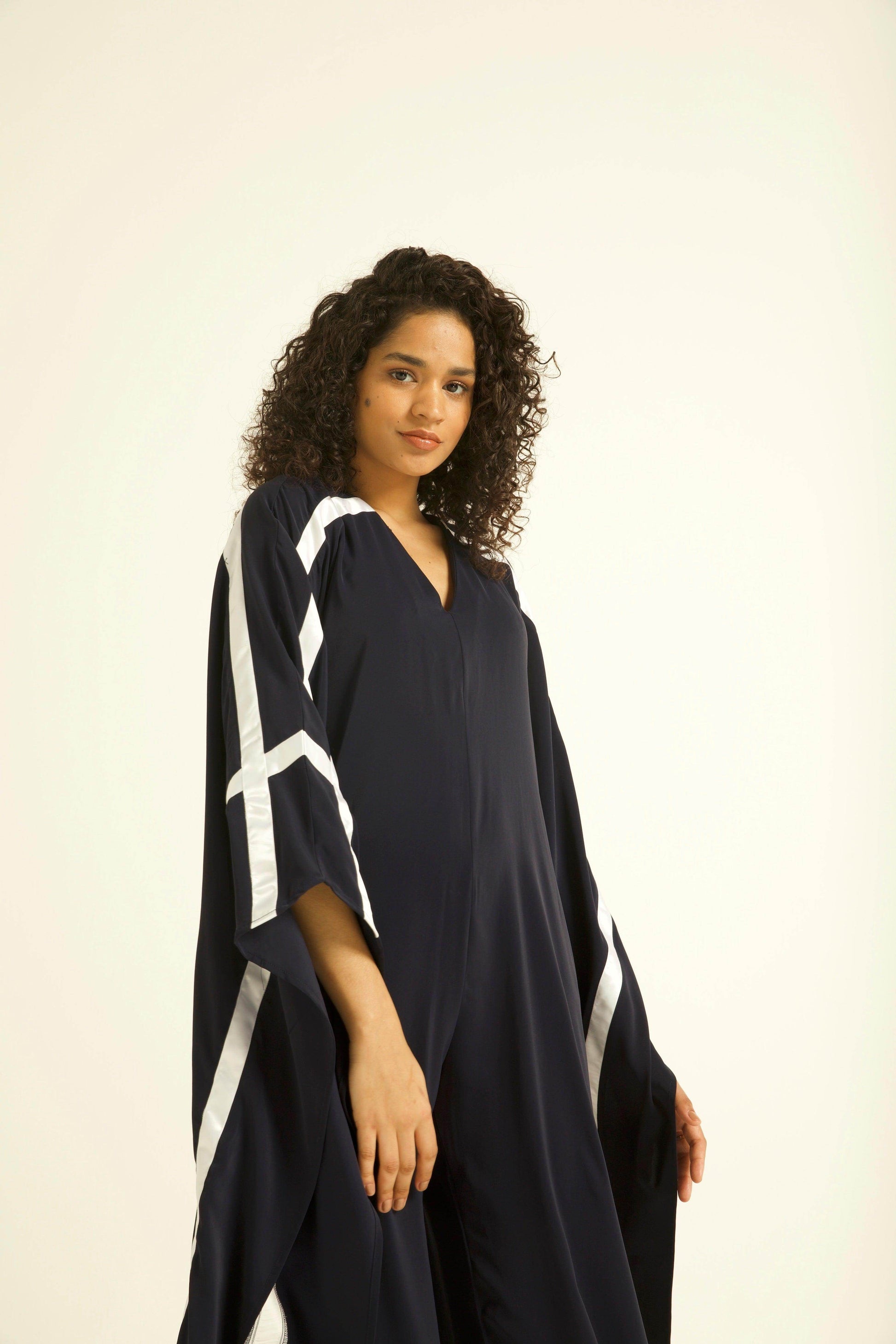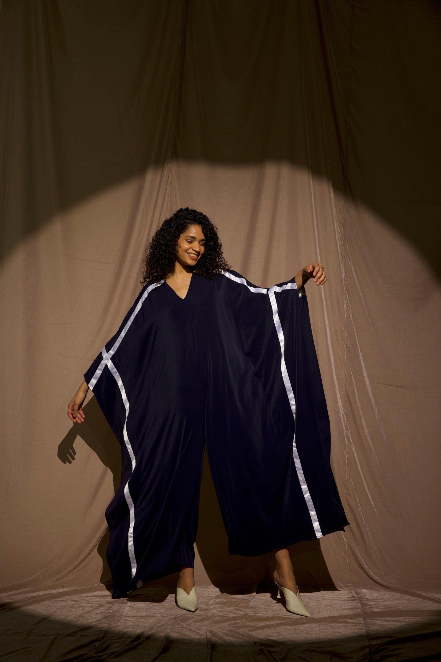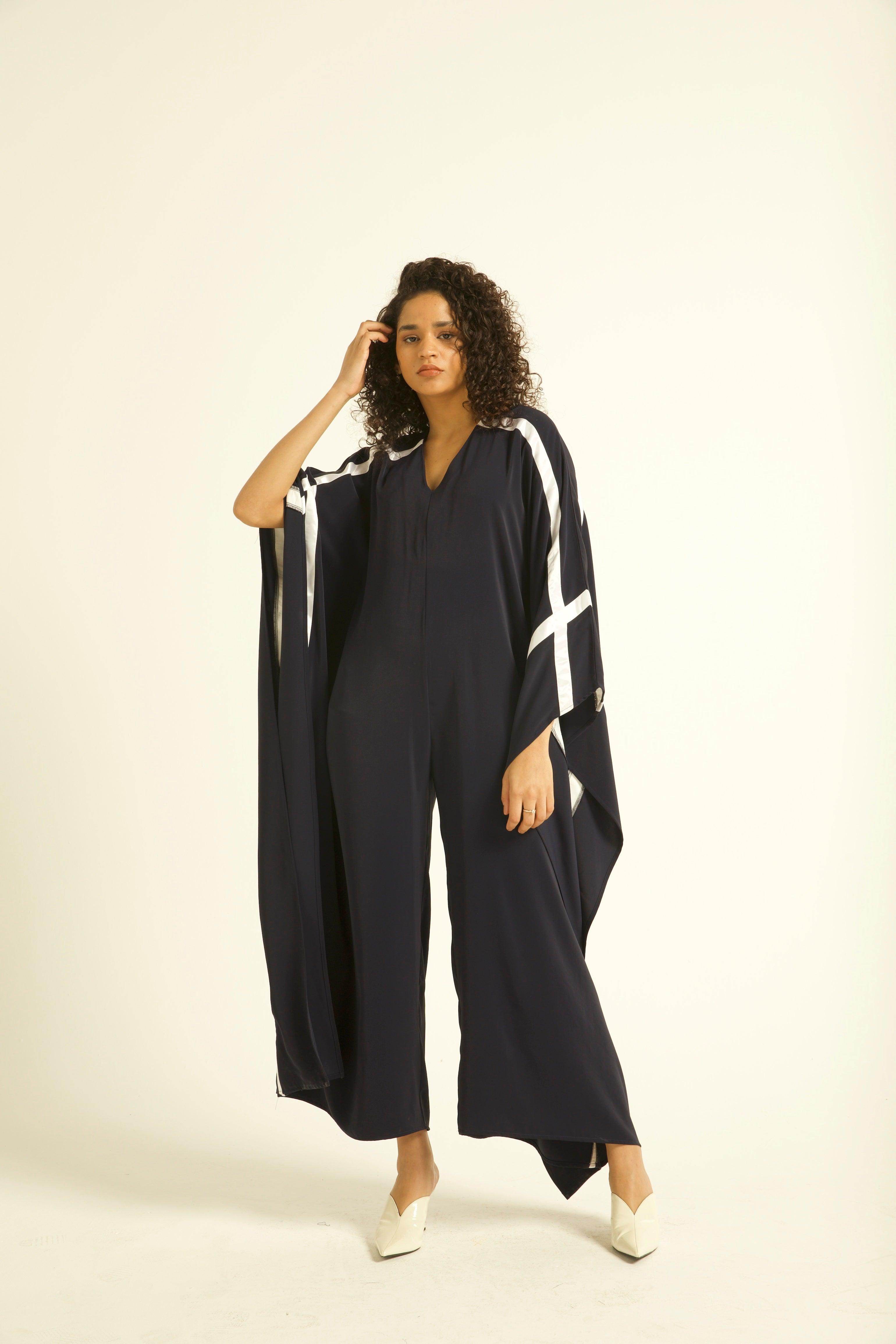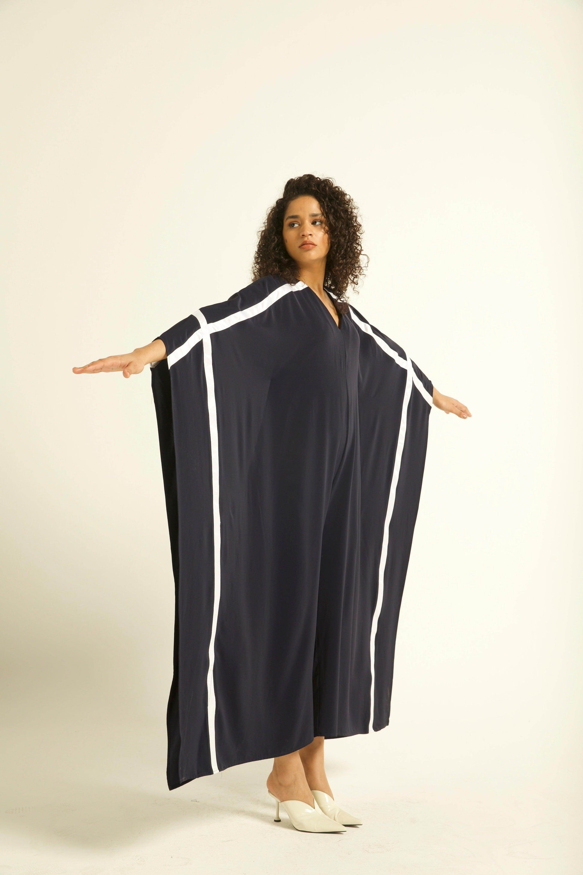 Kaftan inspired V-neck navy jumpsuit with contrast white tape detailing down the shoulders, sleeves and sides. Concealed center back zip closure. Flowy fabric, boxy fit.