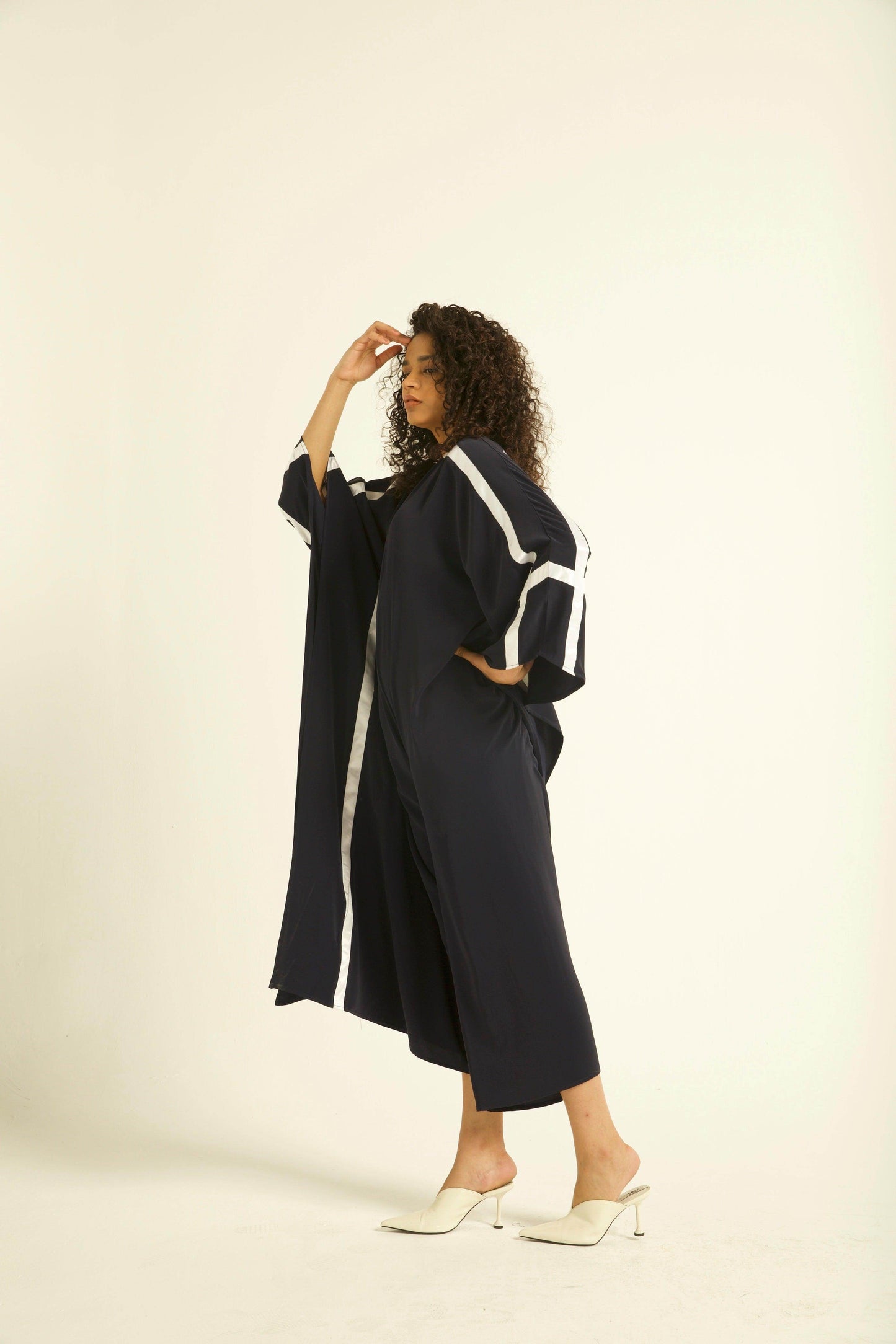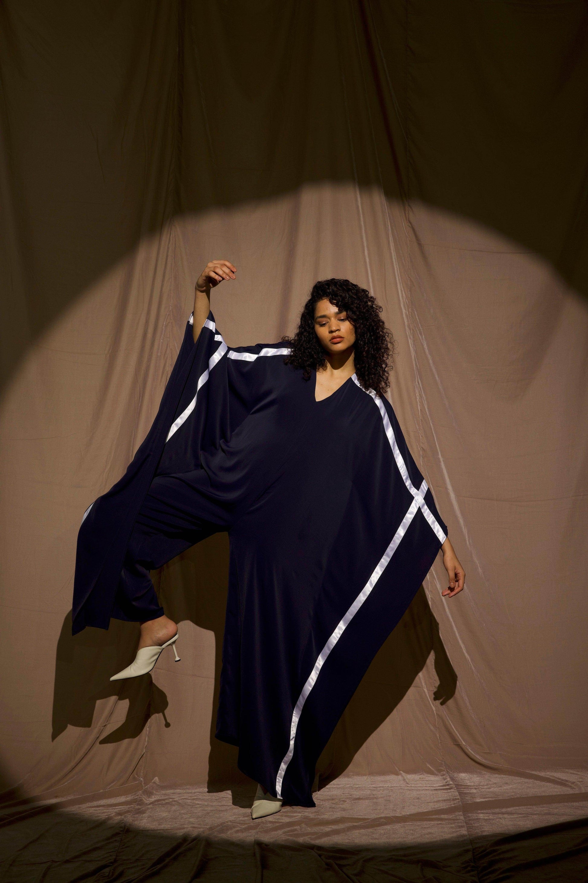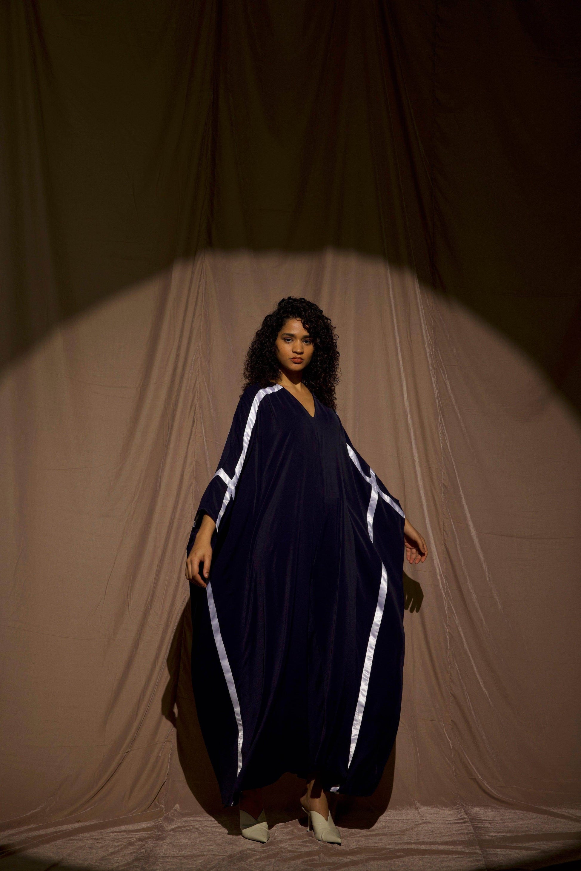 Kaftan inspired V-neck navy jumpsuit with contrast white tape detailing down the shoulders, sleeves and sides. Concealed center back zip closure. Flowy fabric, boxy fit.