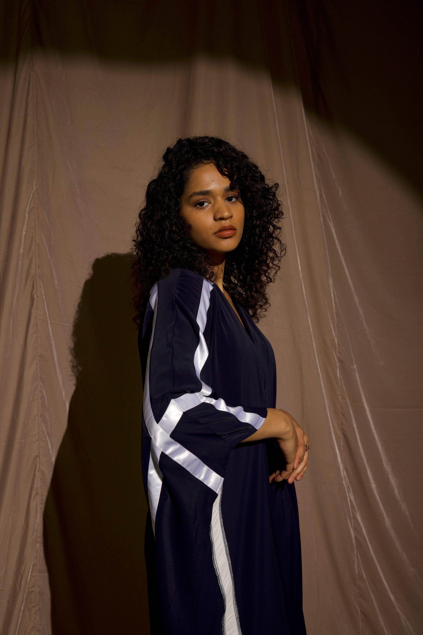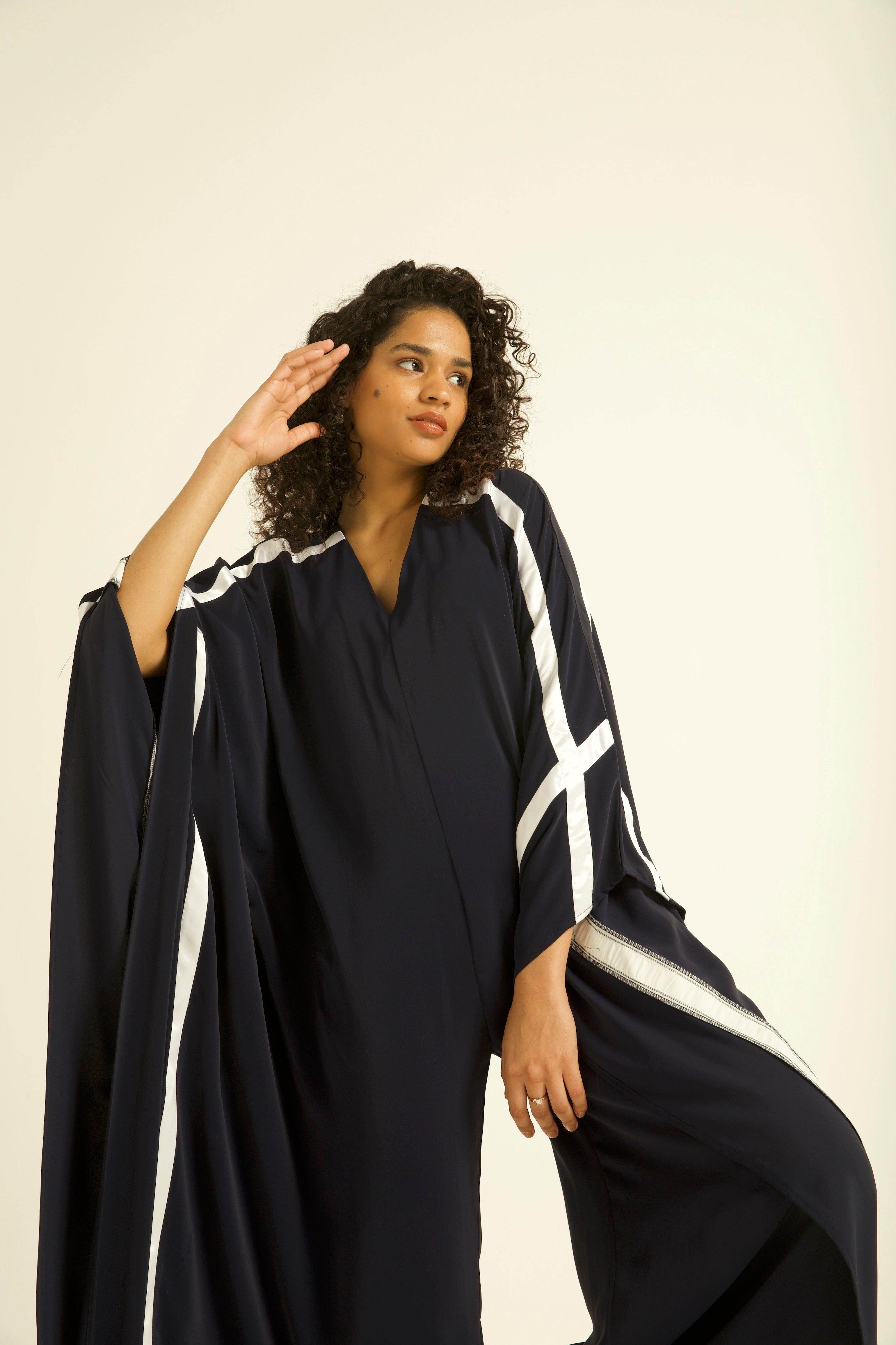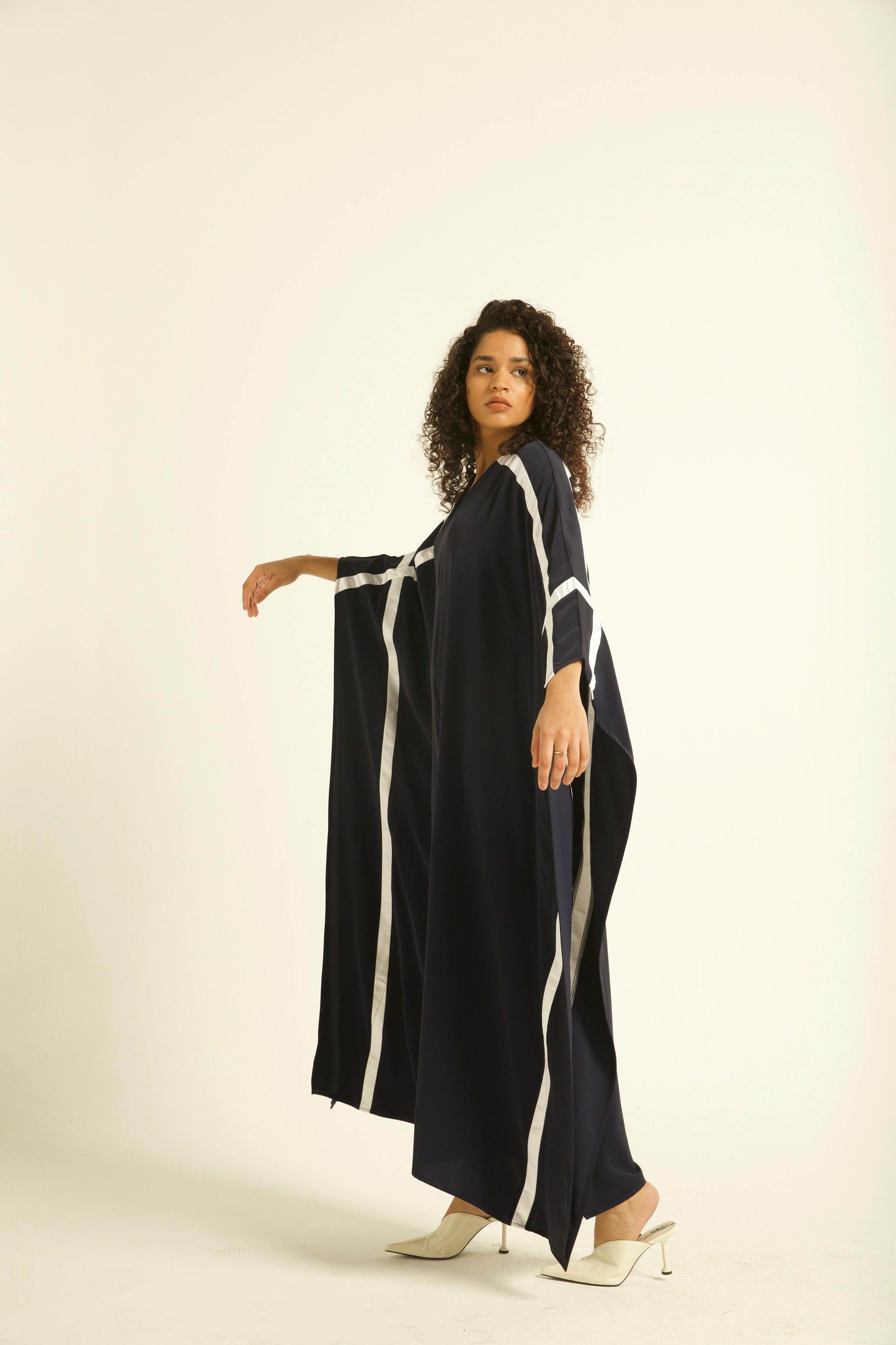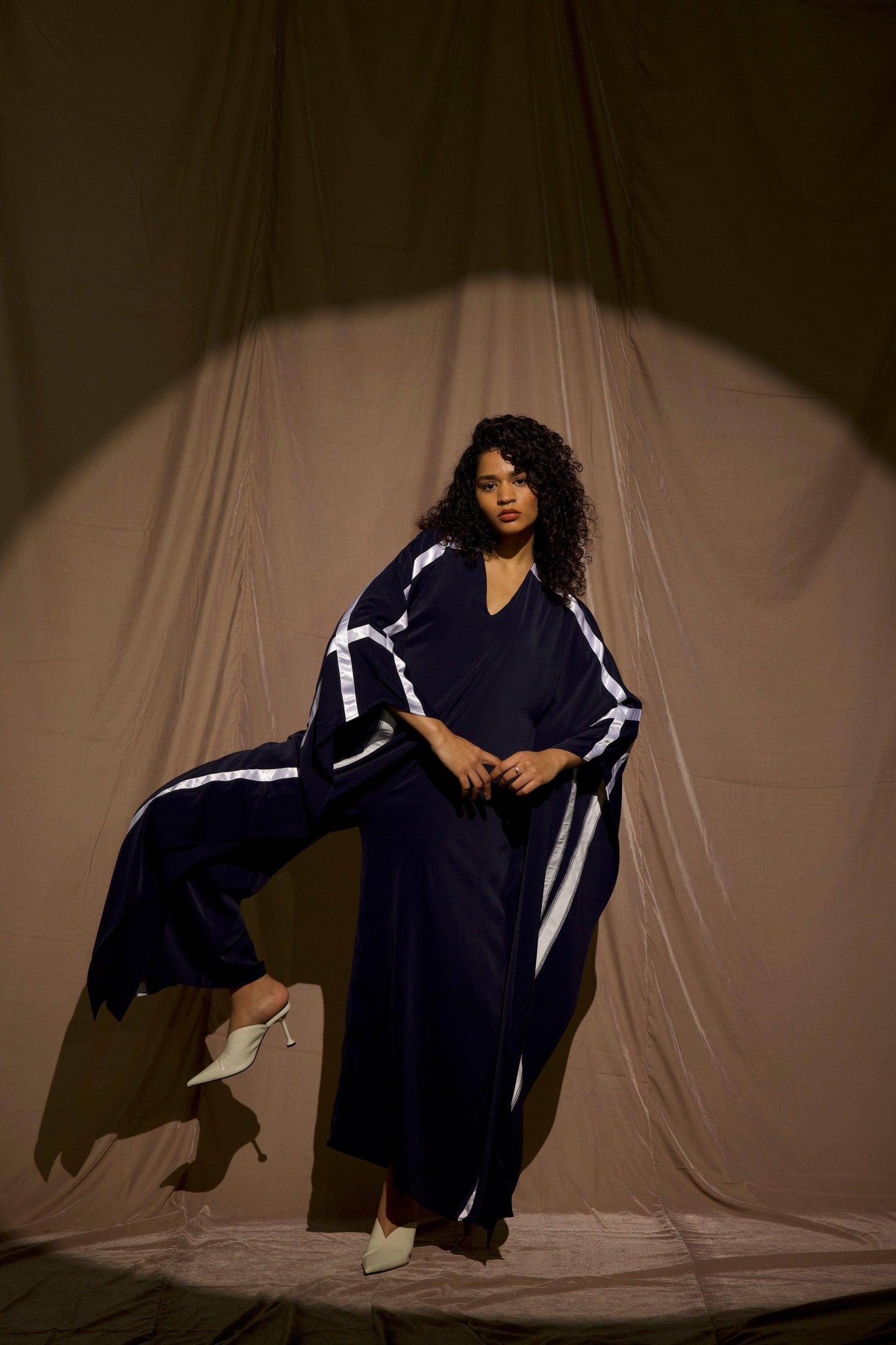 Kaftan inspired V-neck navy jumpsuit with contrast white tape detailing down the shoulders, sleeves and sides. Concealed center back zip closure. Flowy fabric, boxy fit.