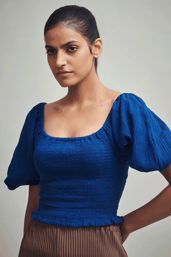 Short, smocked blouse with short exaggerated sleeves. Can be worn wide neck or off-shoulder.