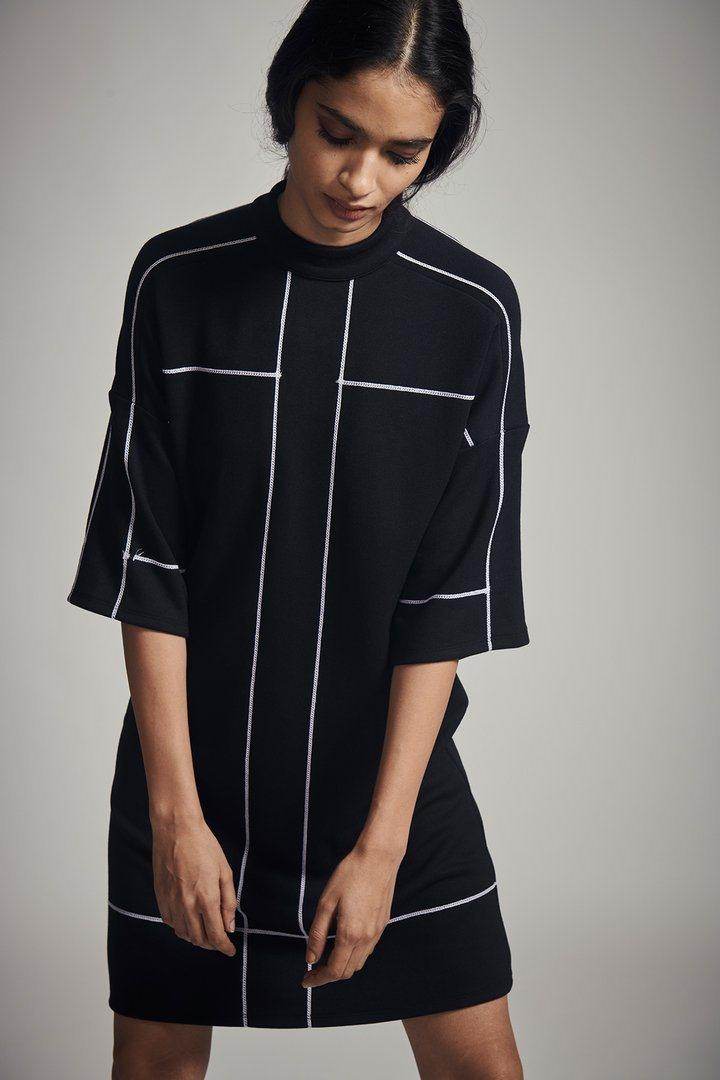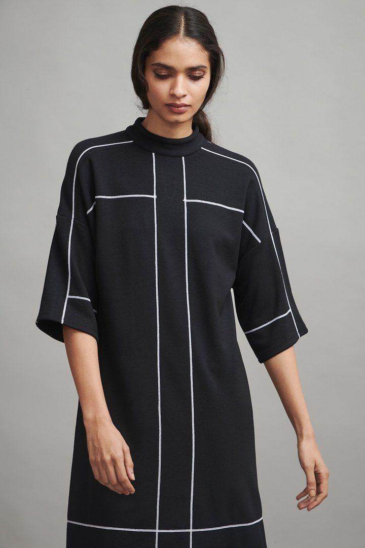 High-neck shift dress with drop shoulder. Features contrast-stitch geometric lines. Comfort fit.