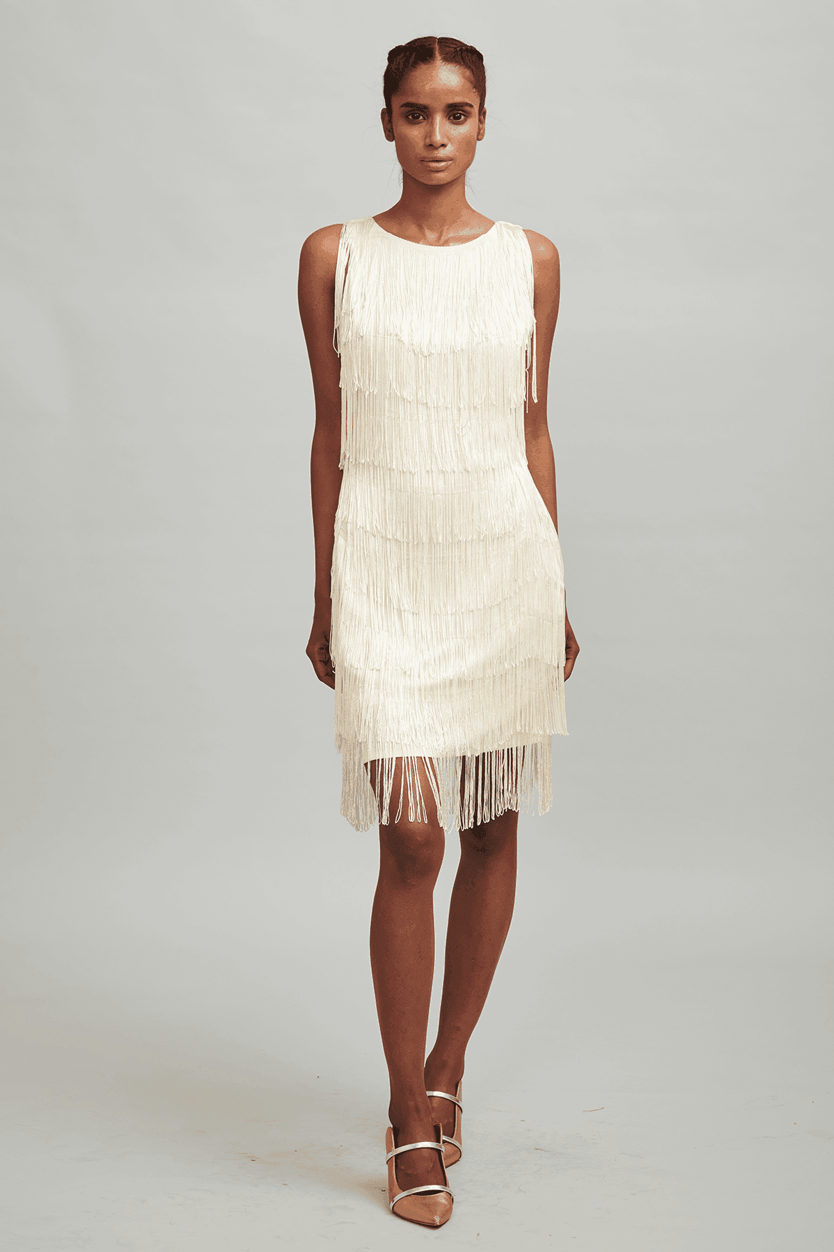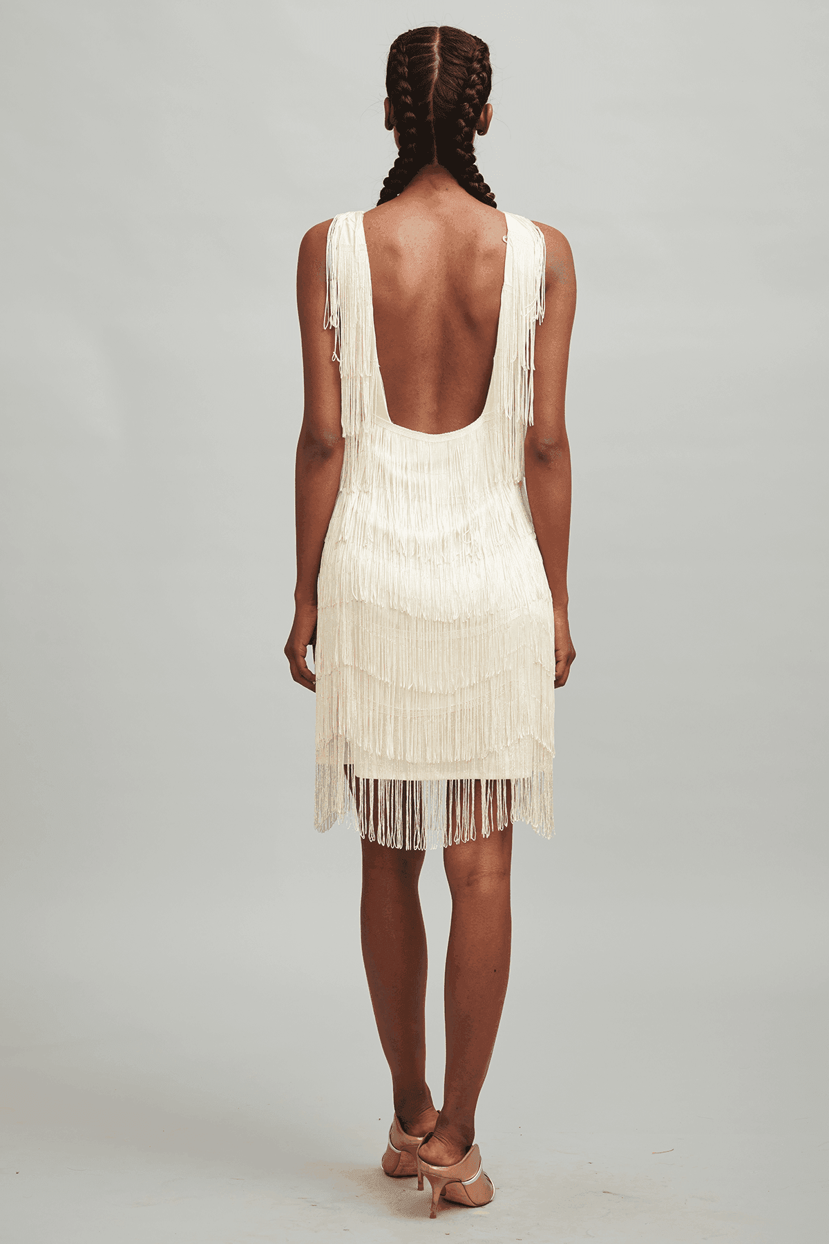 Layered fringe dress in ivory. Low scooped-out back. Zipper in the side.