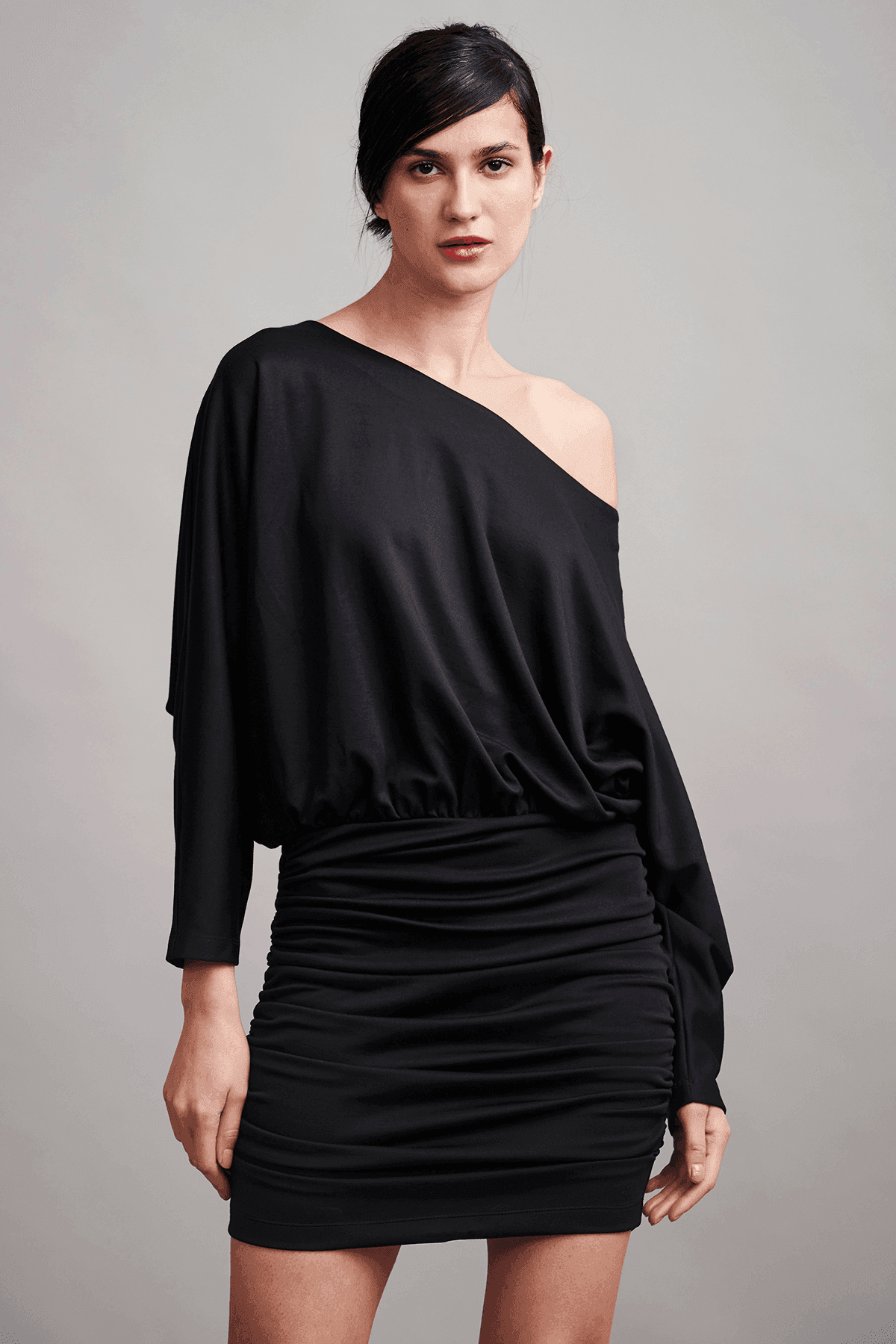 Off-the-shoulder black mini dress with long sleeves. Relaxed bodice, ruched bottom. Wear it as a one-shoulder or a boat neck. Sustainably sourced recycled polyester and high-grade Pima cotton.