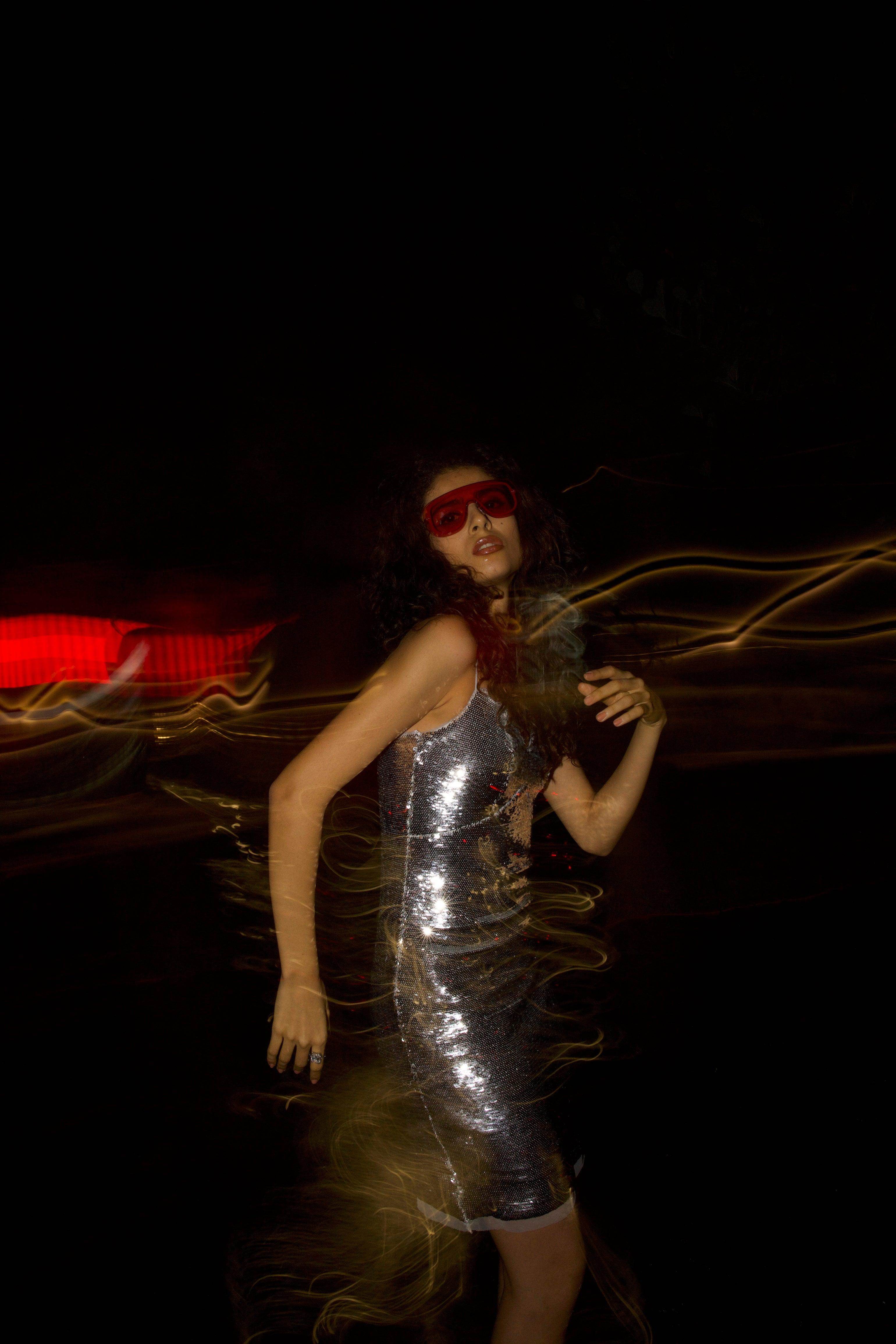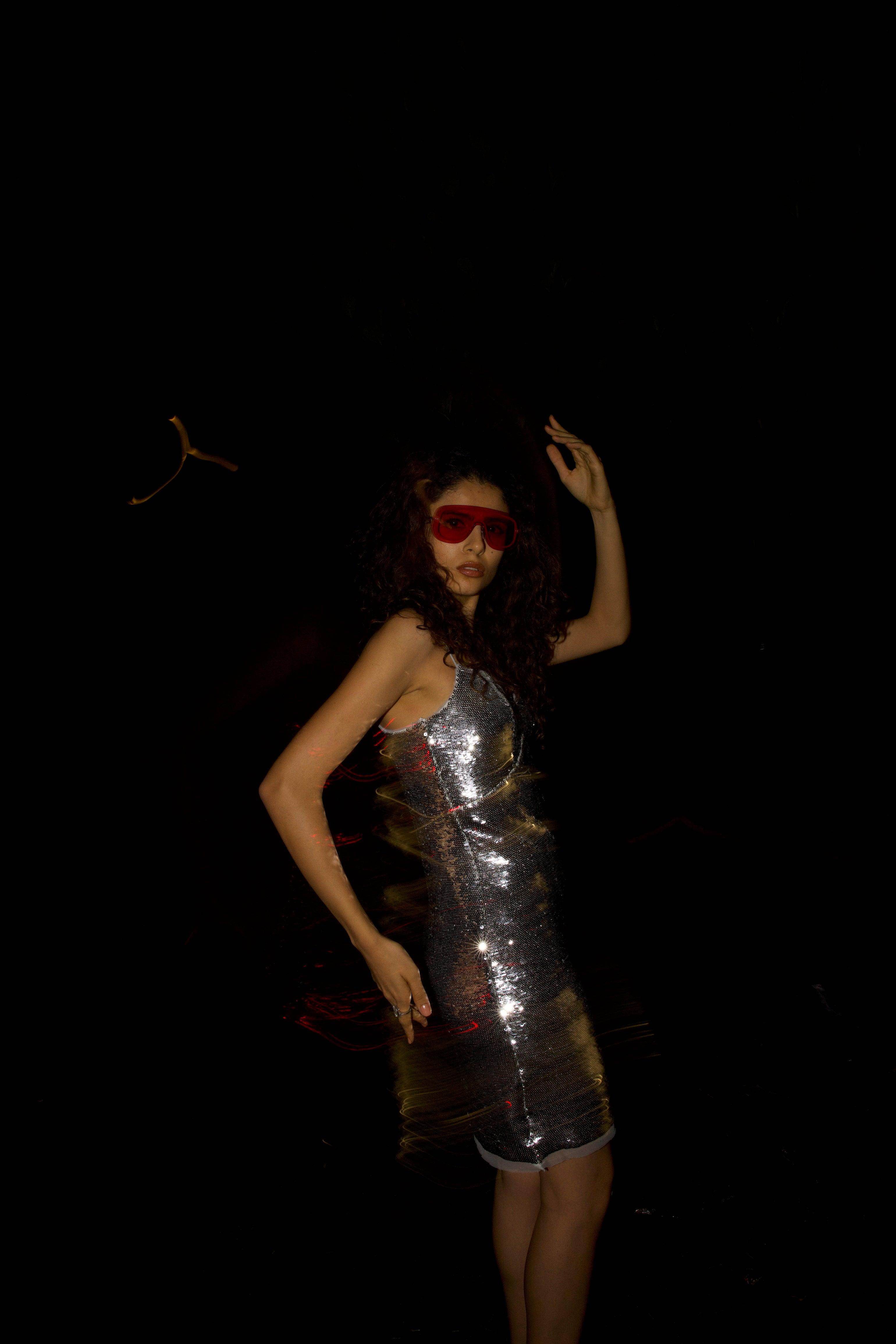 Platinum finish allover sequin mini slip dress. Scooped back. Flattering fit.