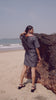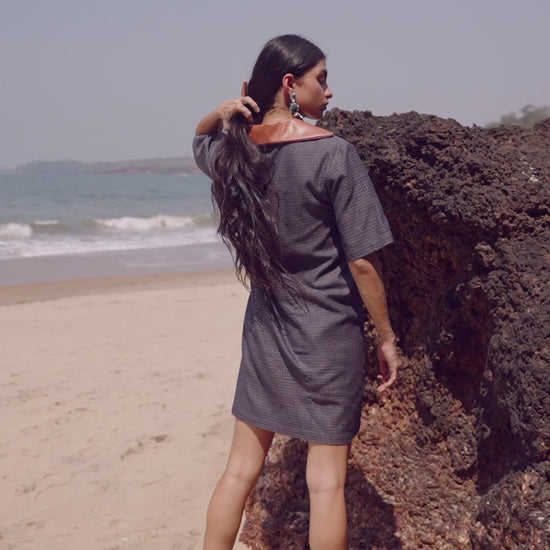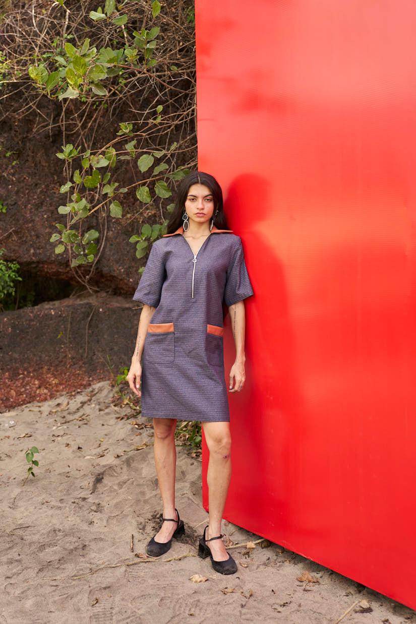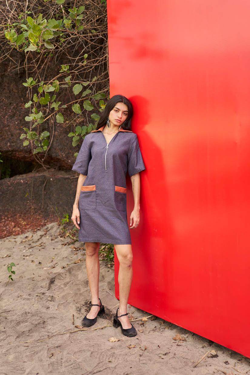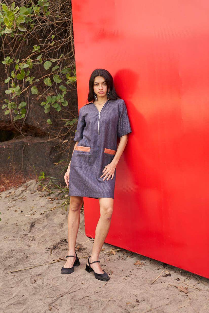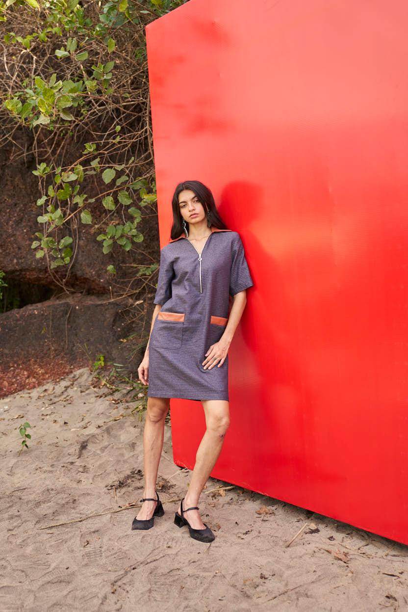 Indigo textured weave popover mini dress with brown leather collar and pocket detailing. Patch pockets and zip placket in the front.