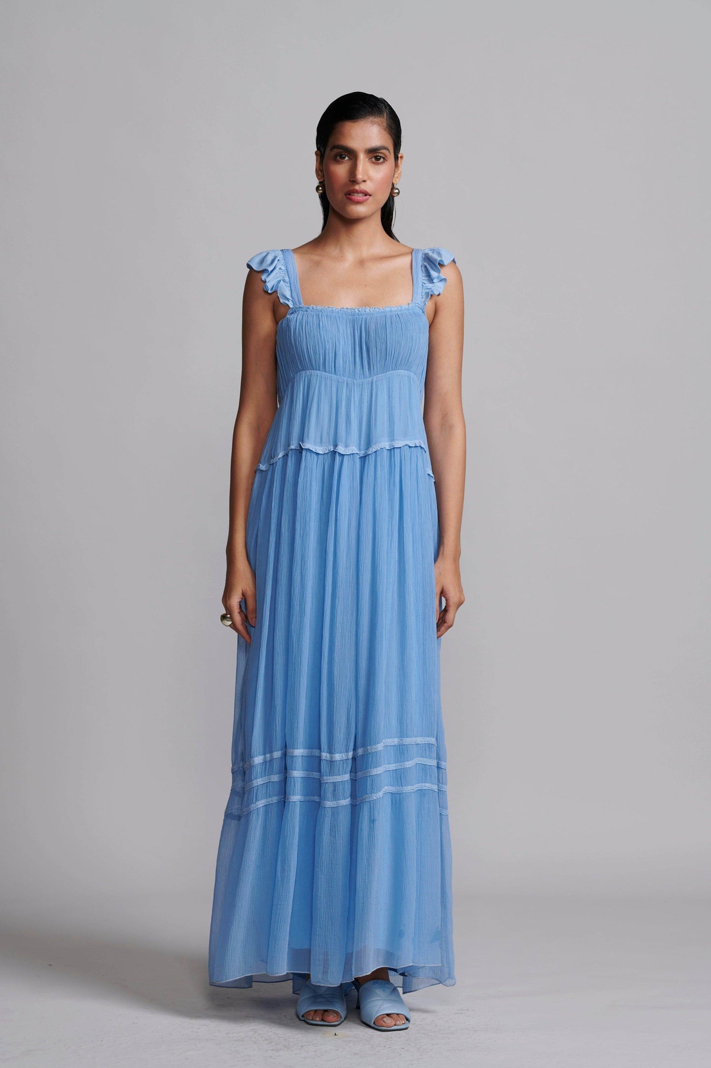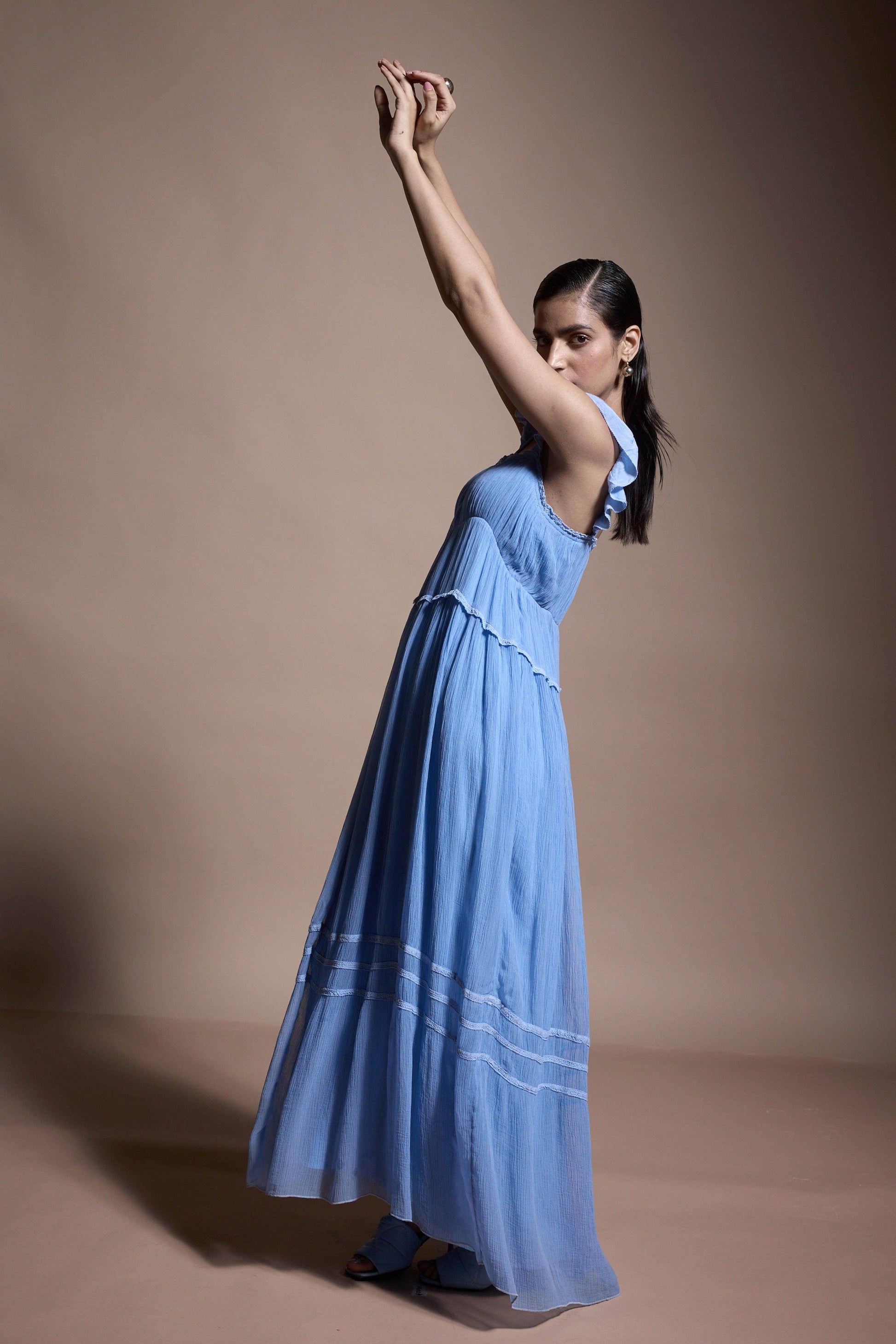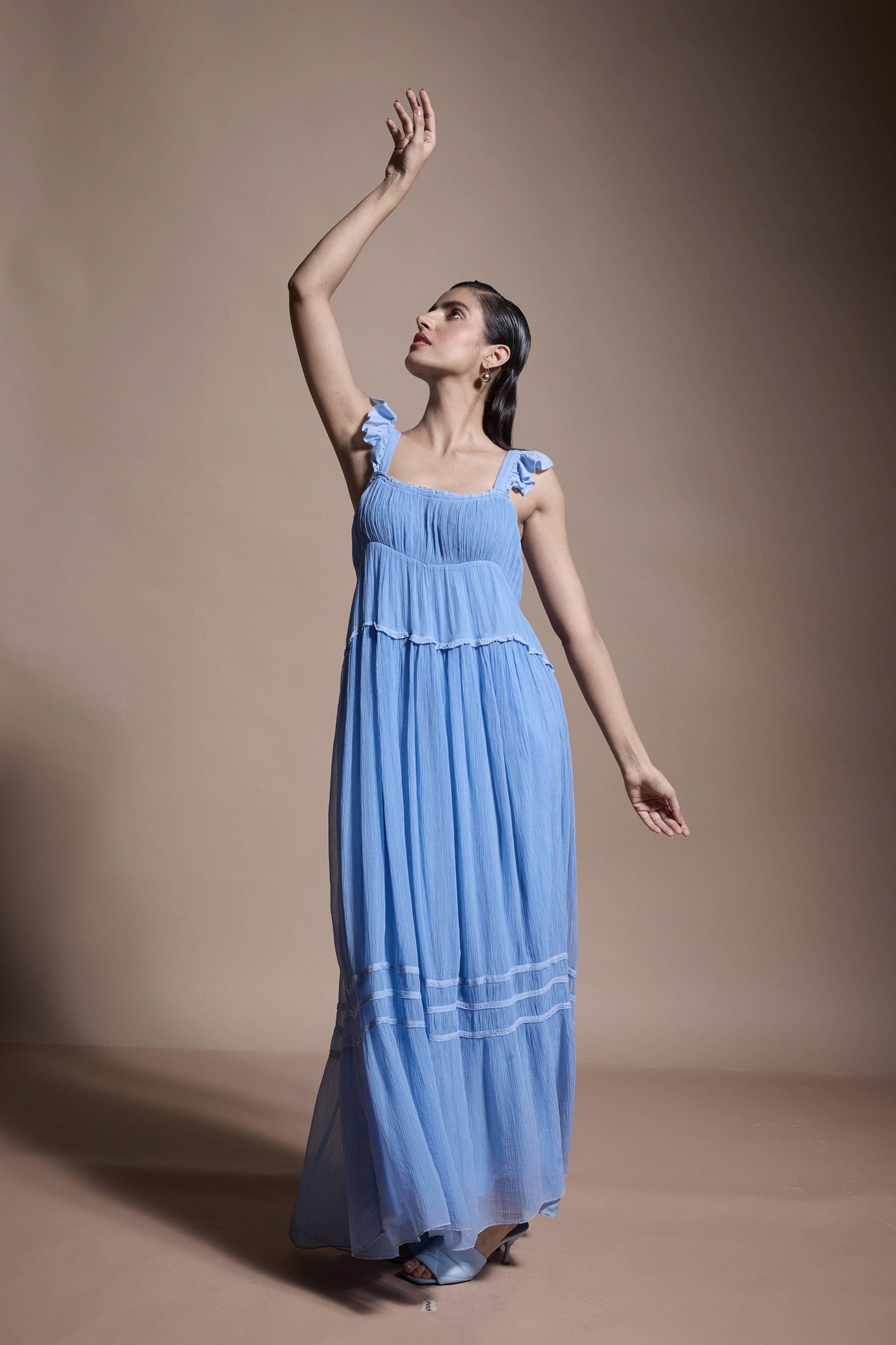 Azure blue tiered maxi dress in soft, breathable crinkled georgette. Features tonal lace appliqué and delicate ruching for added movement. Ruffled shoulder straps. Fully lined.