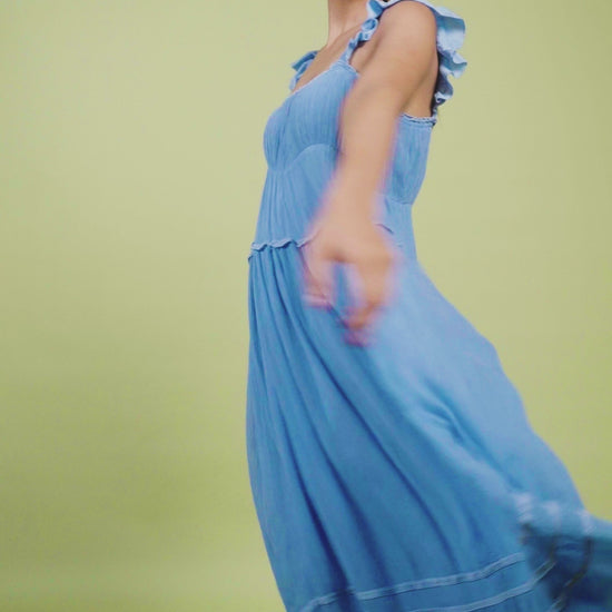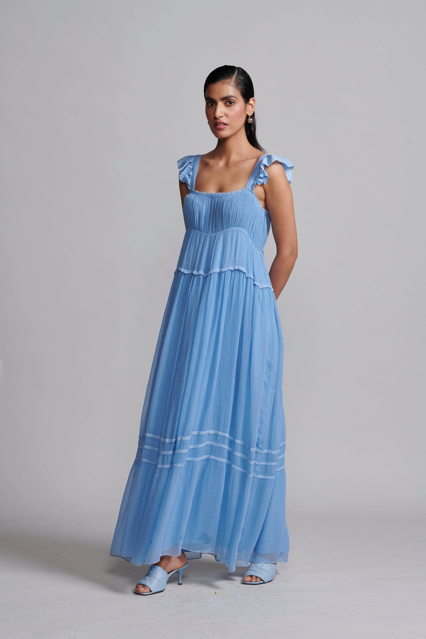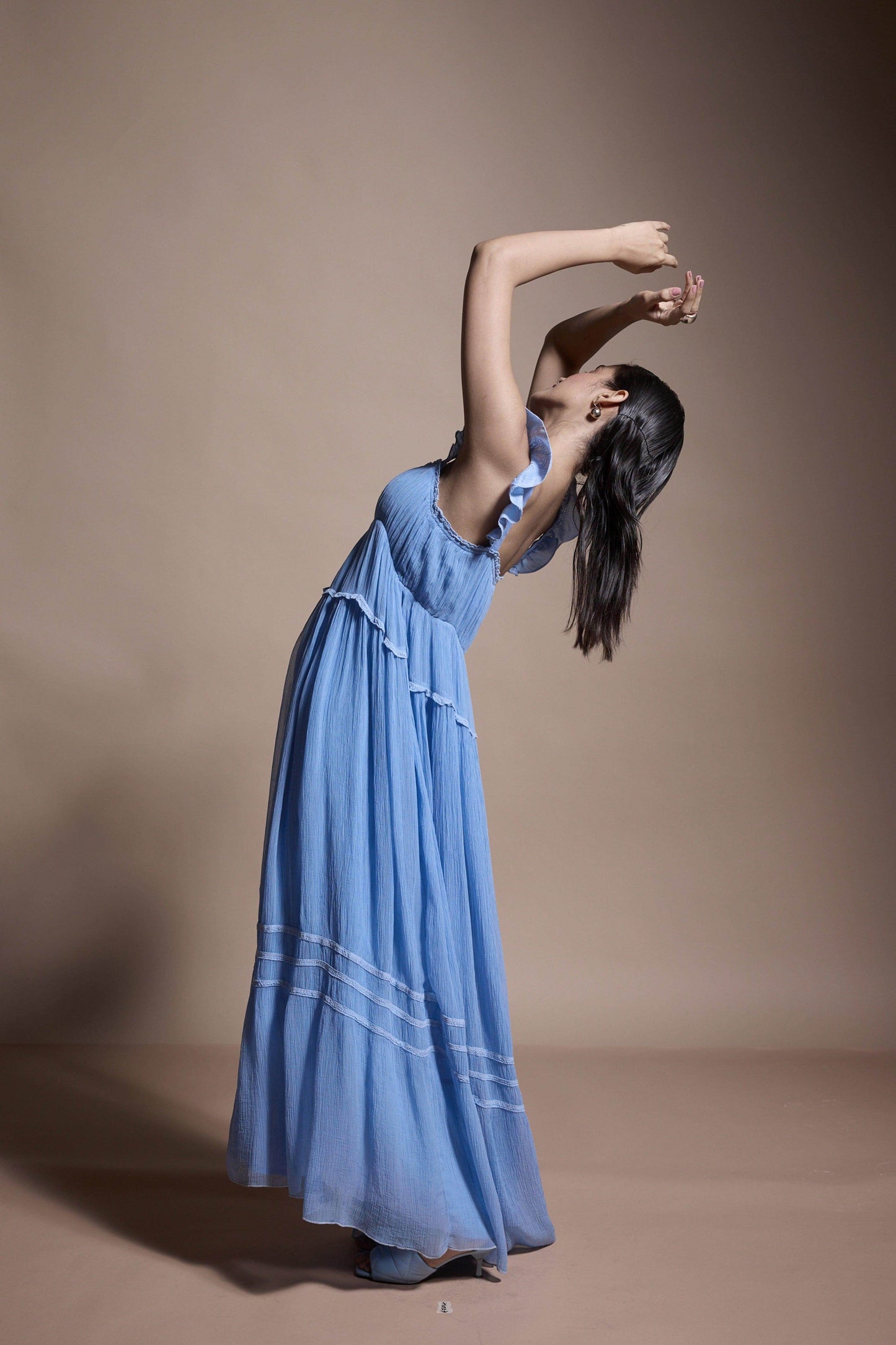 Azure blue tiered maxi dress in soft, breathable crinkled georgette. Features tonal lace appliqué and delicate ruching for added movement. Ruffled shoulder straps. Fully lined.
