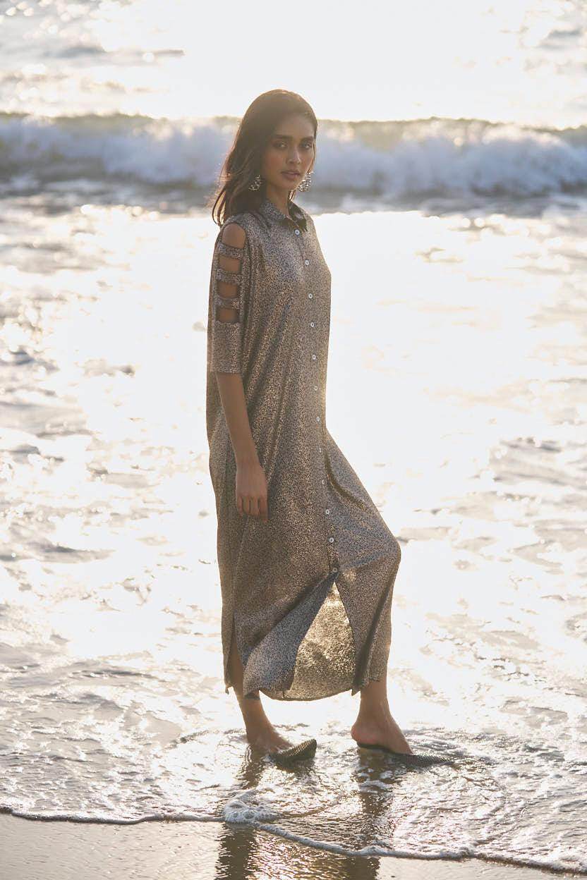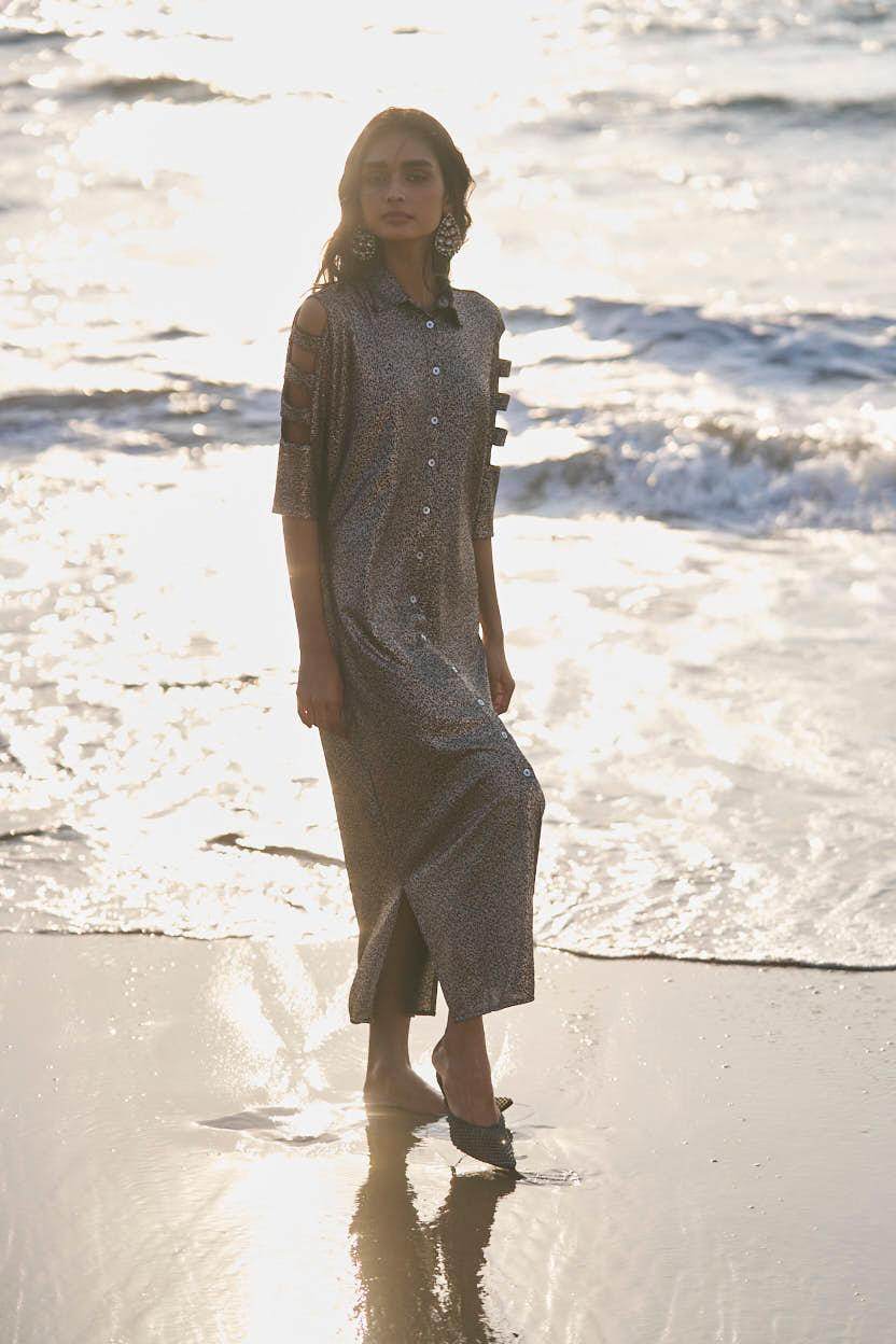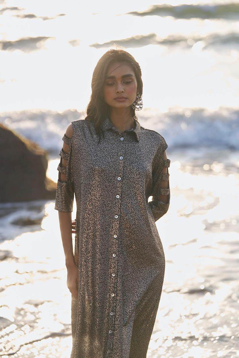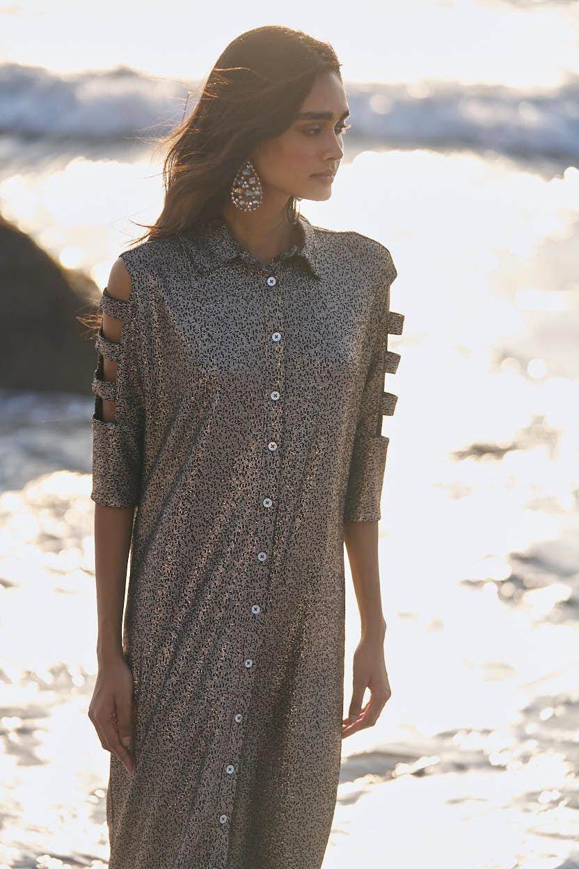 Foil print shirt dress with cutout detailing on the sleeves. Shirt collar with a button down front. Dolman style 3/4th sleeves.