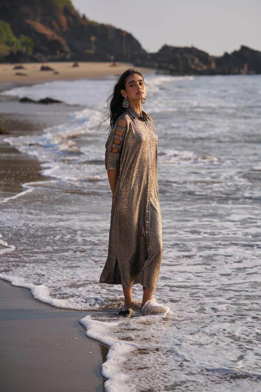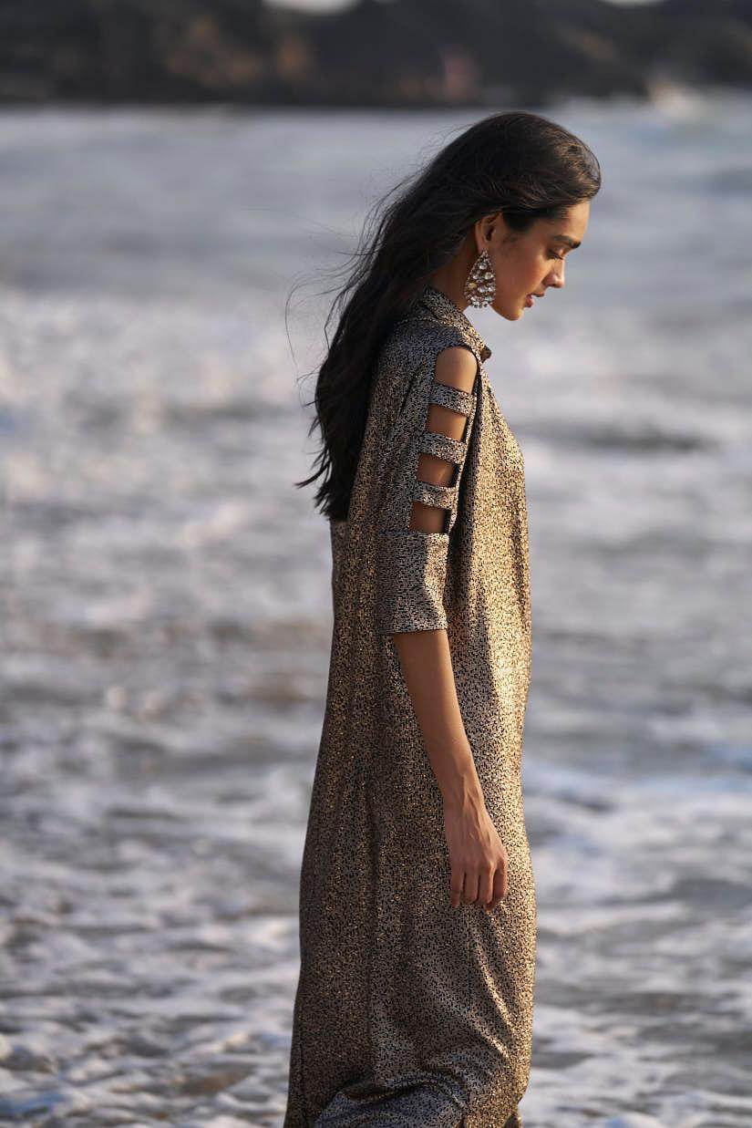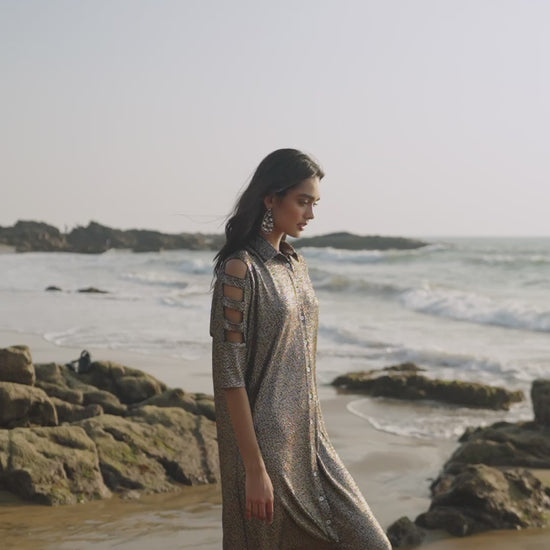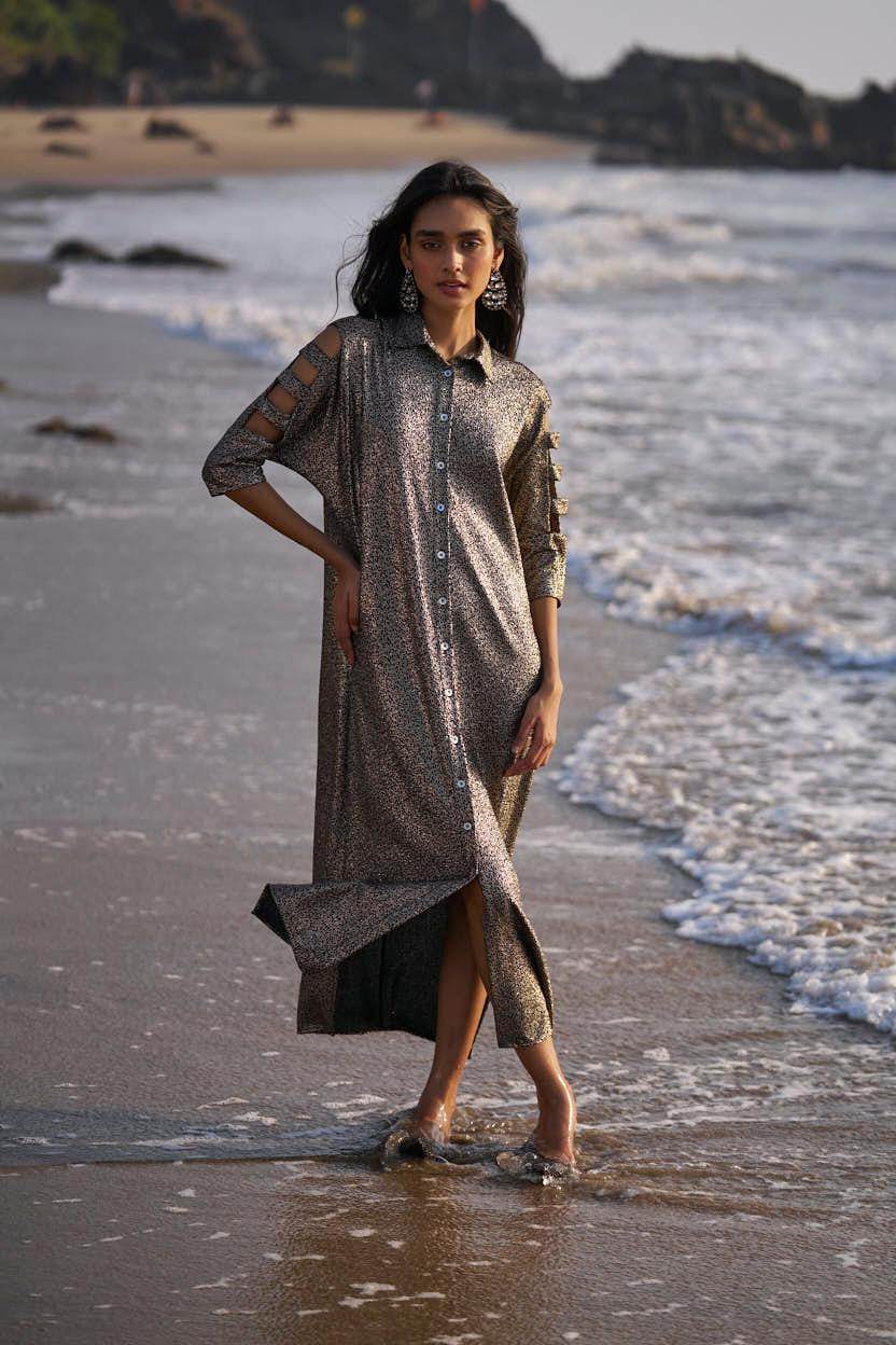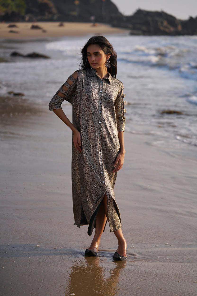 Foil print shirt dress with cutout detailing on the sleeves. Shirt collar with a button down front. Dolman style 3/4th sleeves.