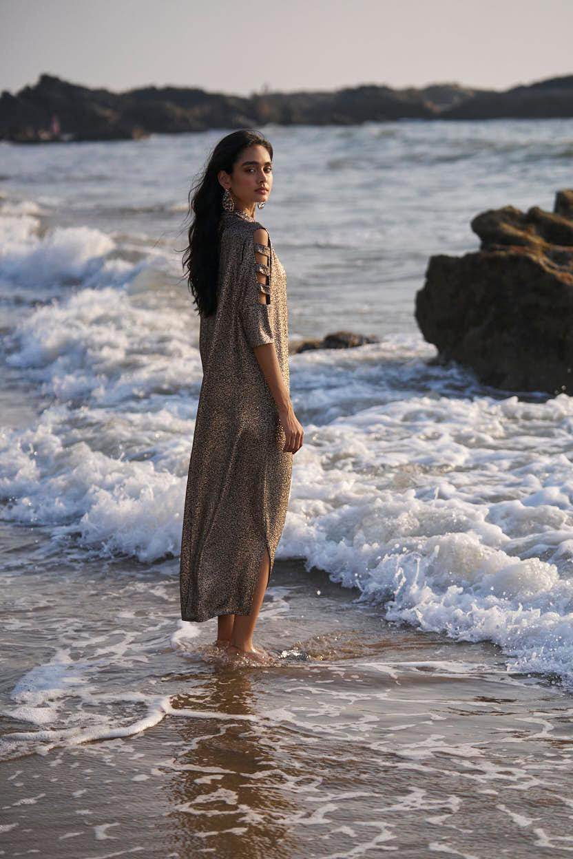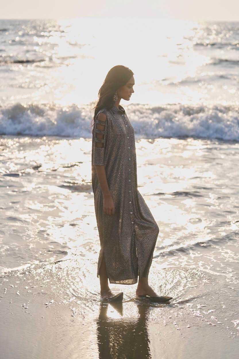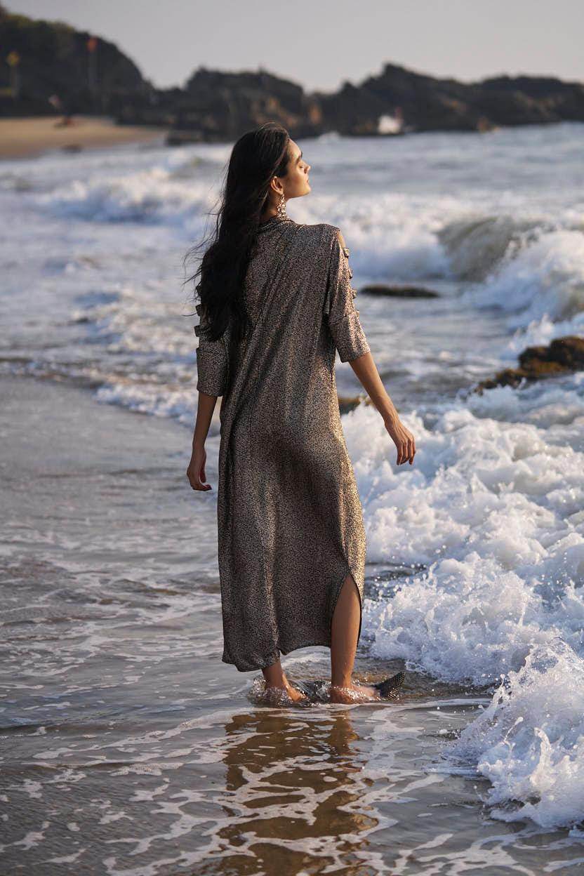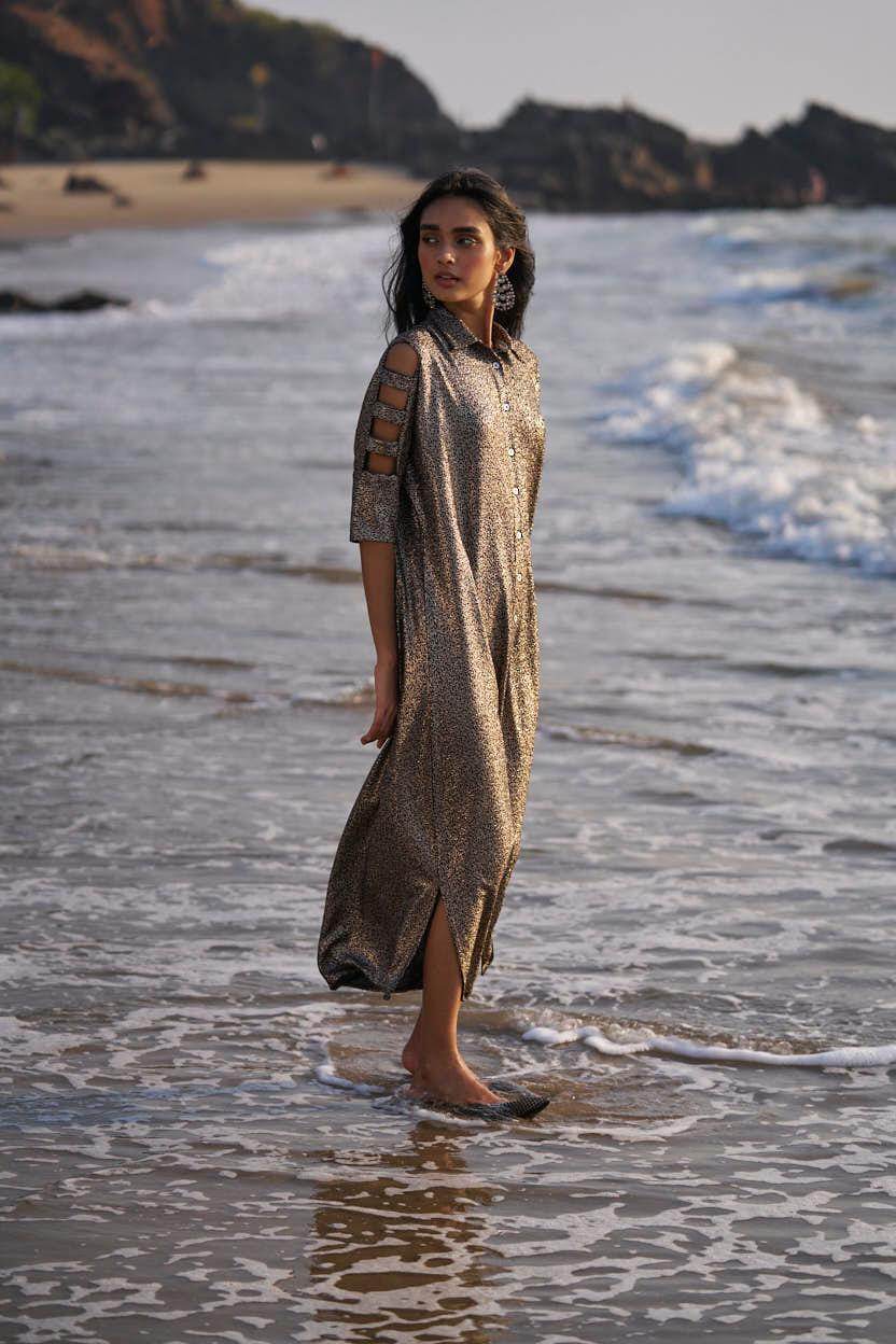 Foil print shirt dress with cutout detailing on the sleeves. Shirt collar with a button down front. Dolman style 3/4th sleeves.
