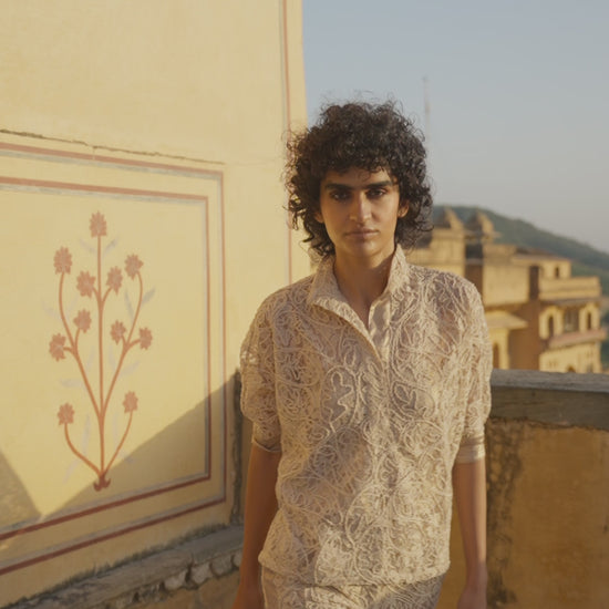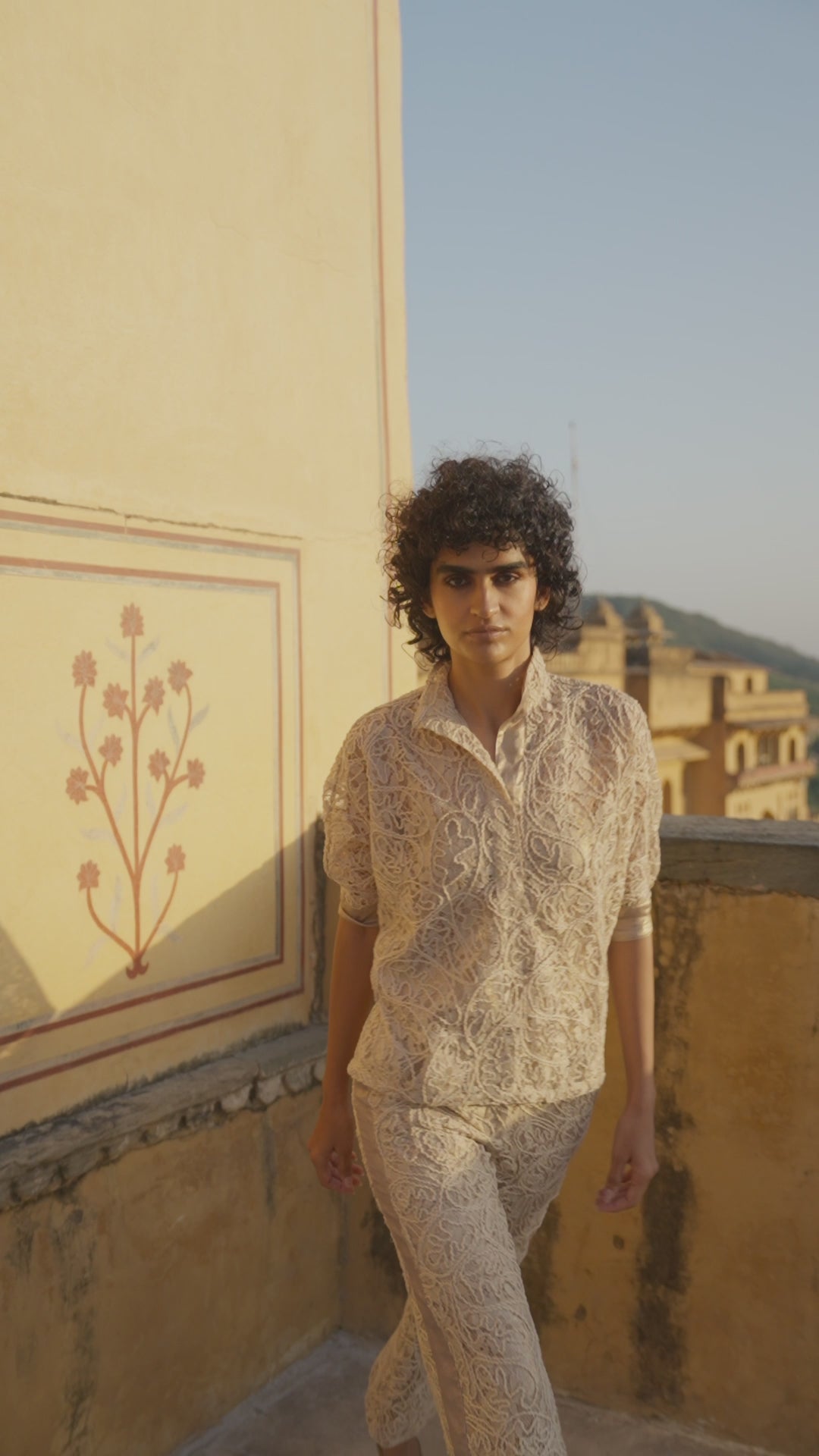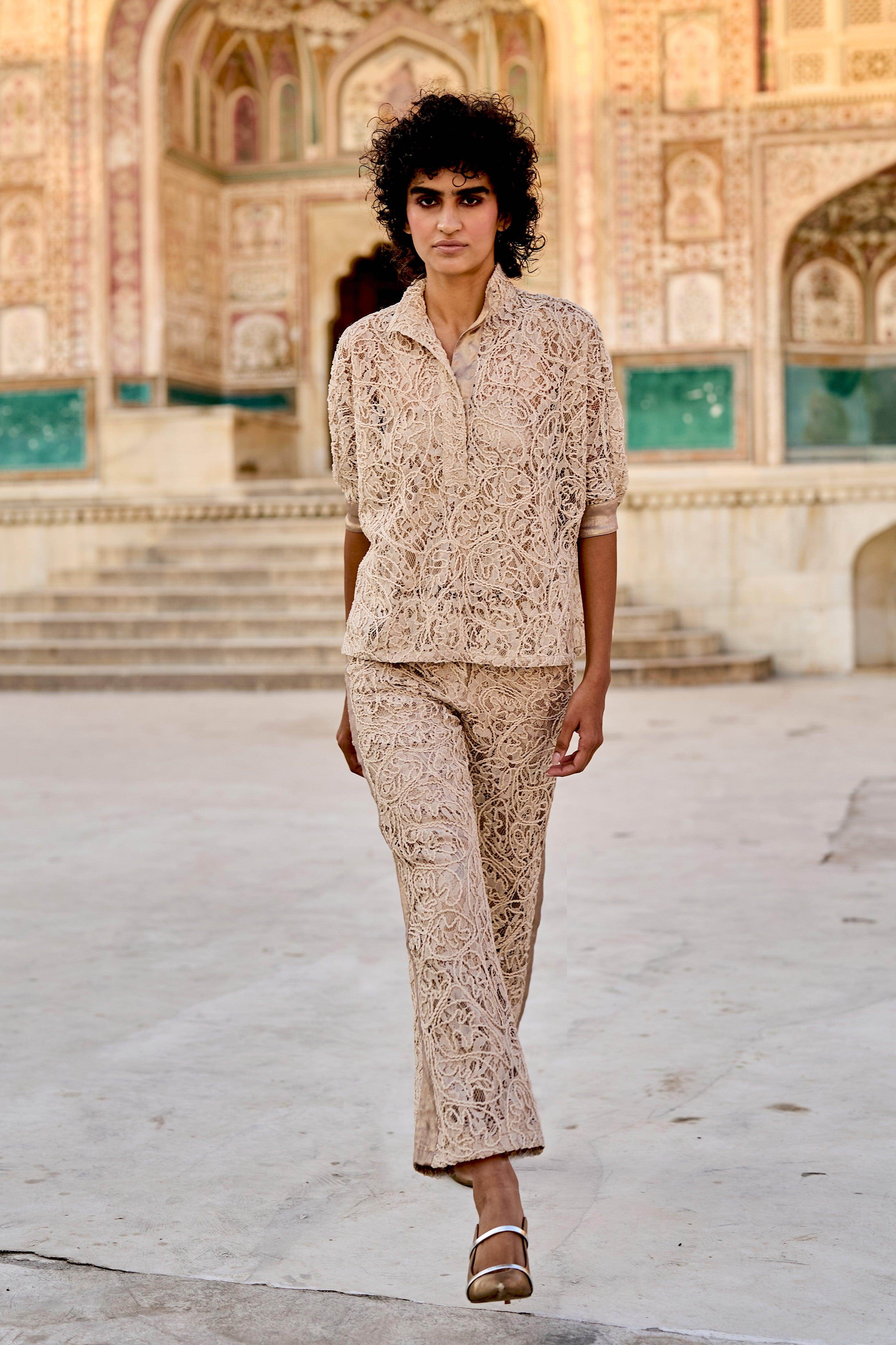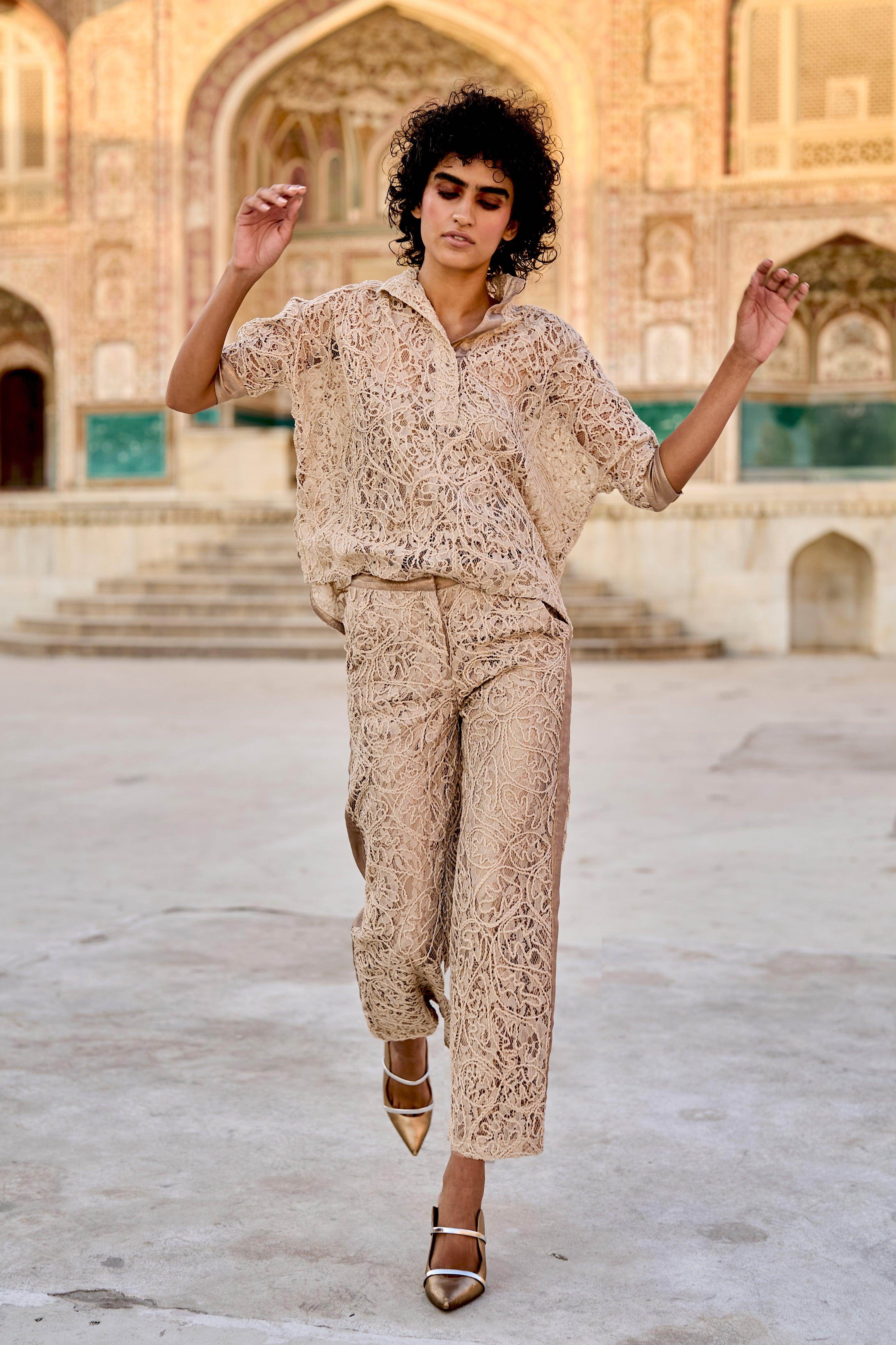 Delicate beige lace with allover tonal cord embroidery in abstract florals. Straight pant has dull gold fabric detailing on the waistband and side seams. Hook/eye and zip closure in the front, pockets in the sides. Garment is fully lined.