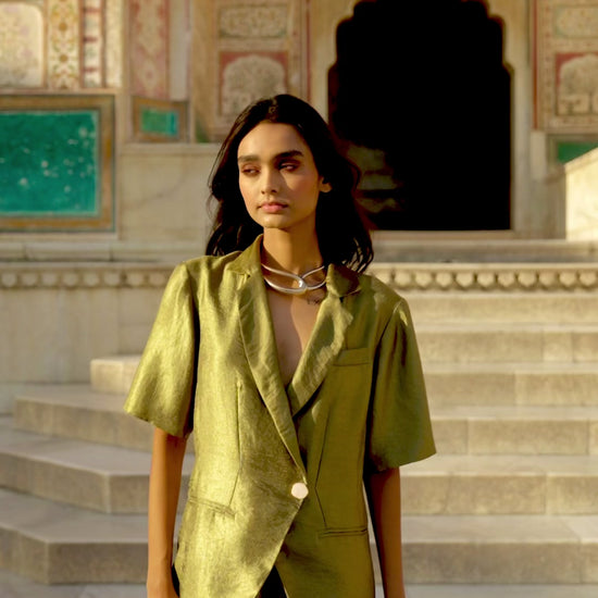 Straight cut pants in a green lamé twill weave fabric. Hand sewn pleats sewn down on the front waist to add a flattering shape. Pockets in the sides and false pocket in the back. Hook/eye and zip closure on the side.