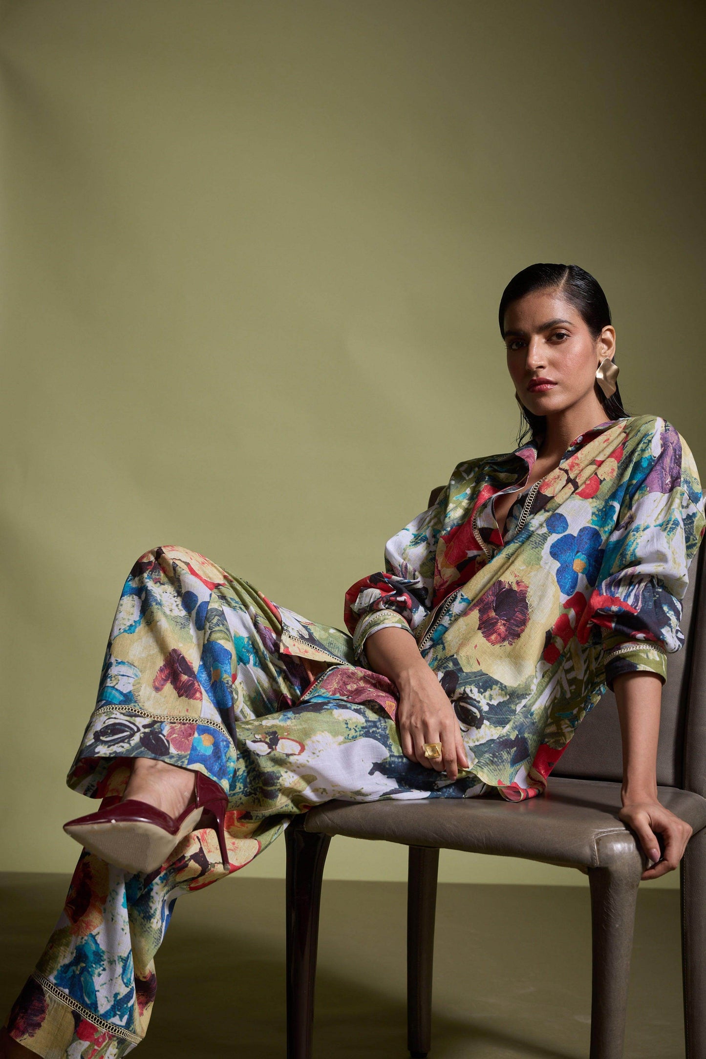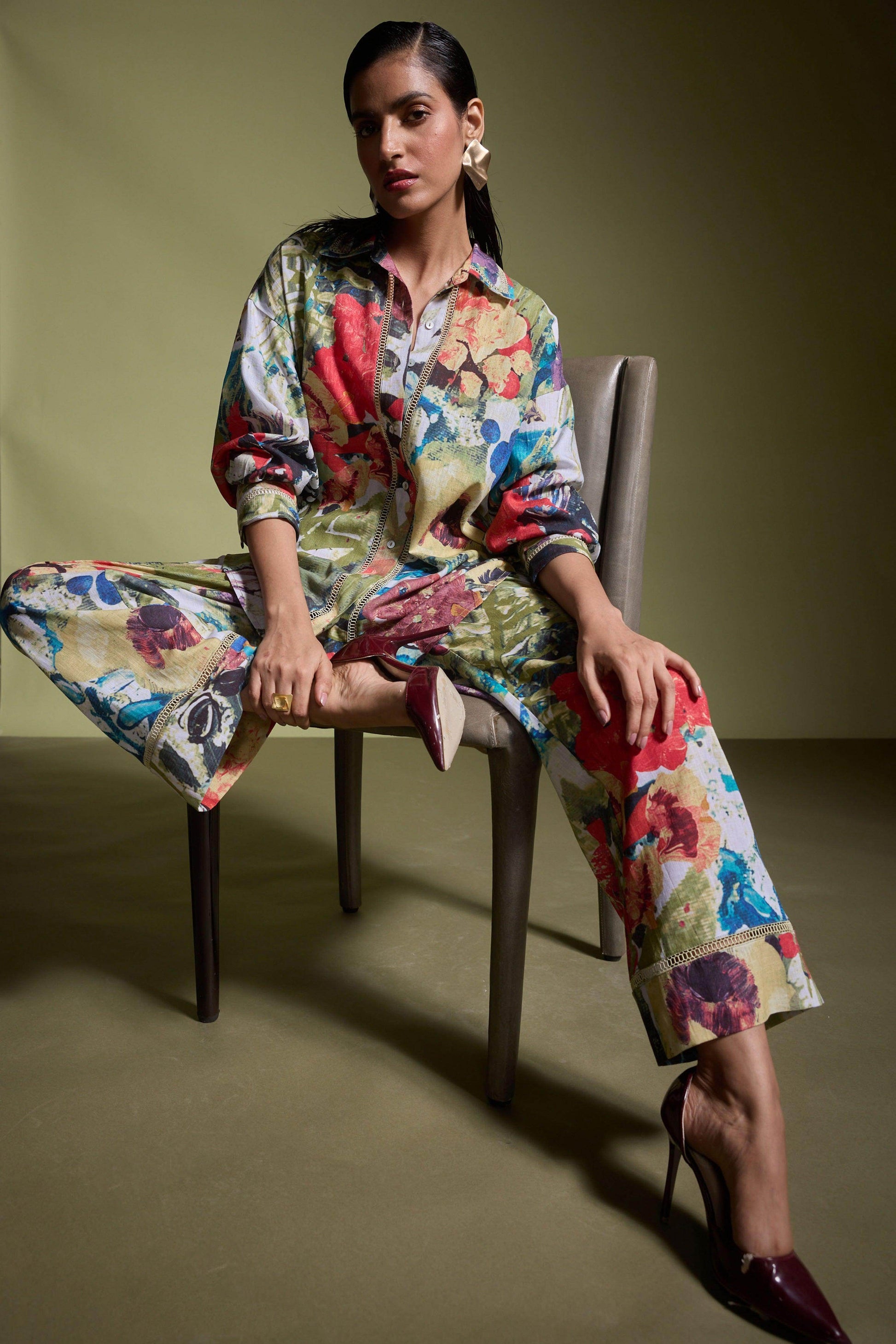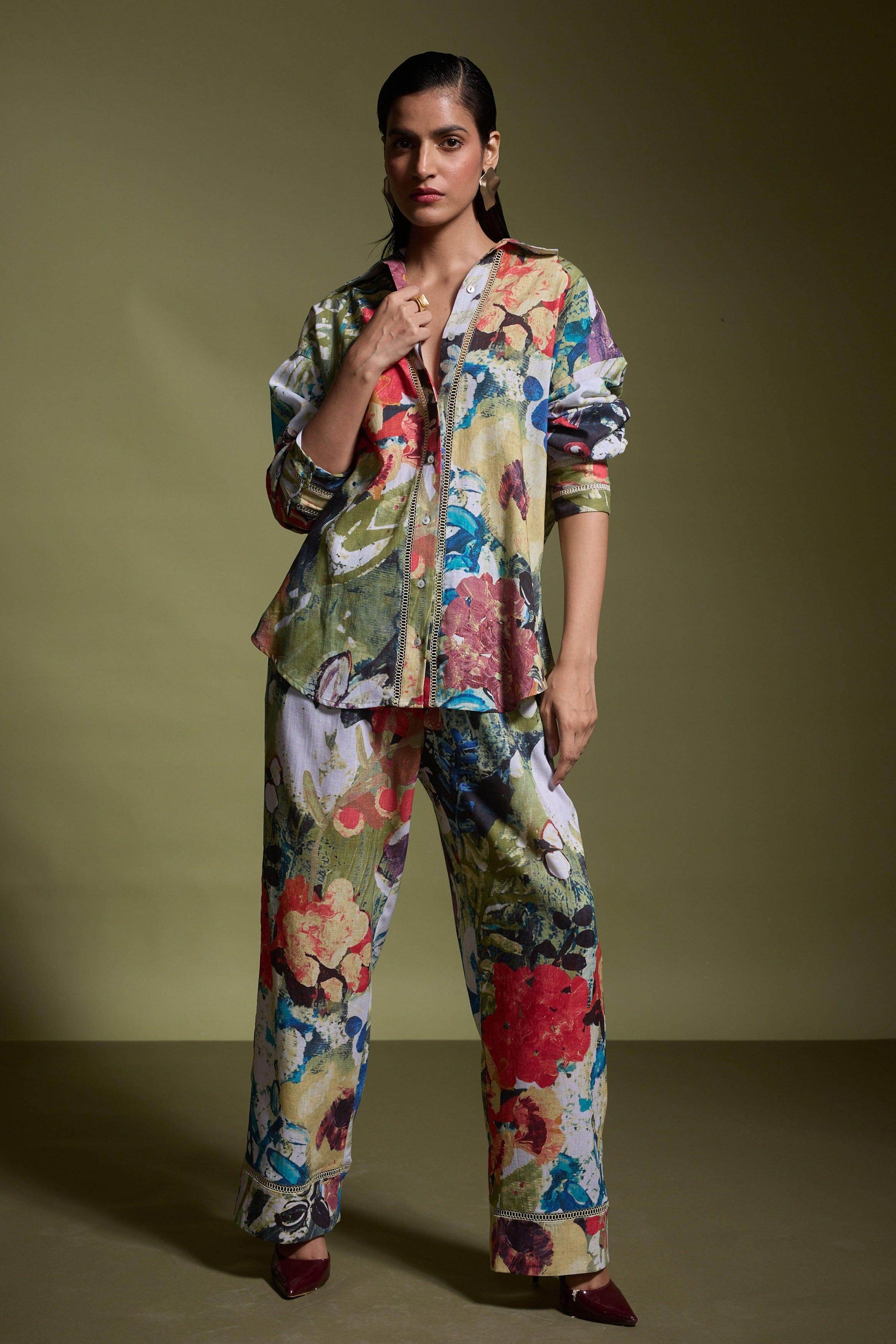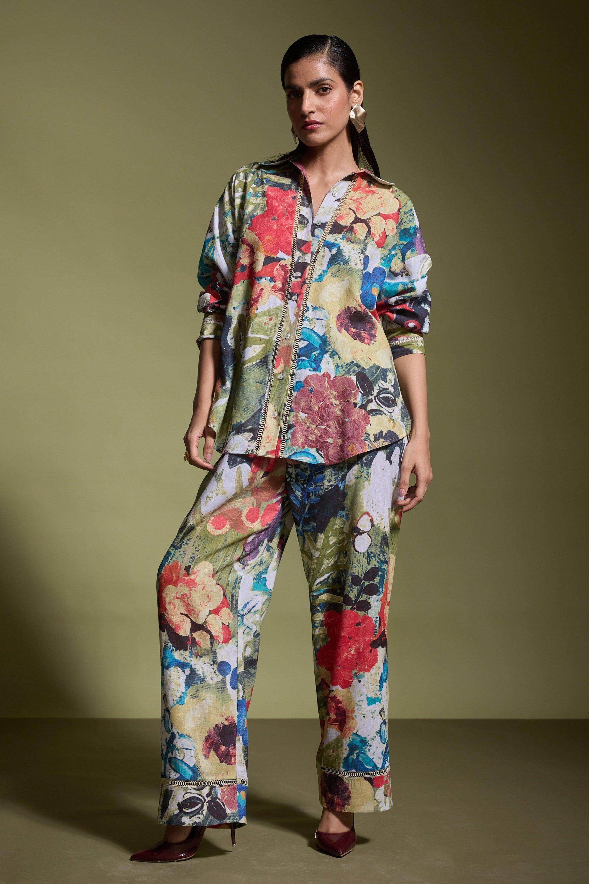 Relaxed fit pants in breathable natural linen blend with a large-scale hand-painted floral print. Elasticated waist with drawstrings. Ladder lace insert near the hem. Side pockets.