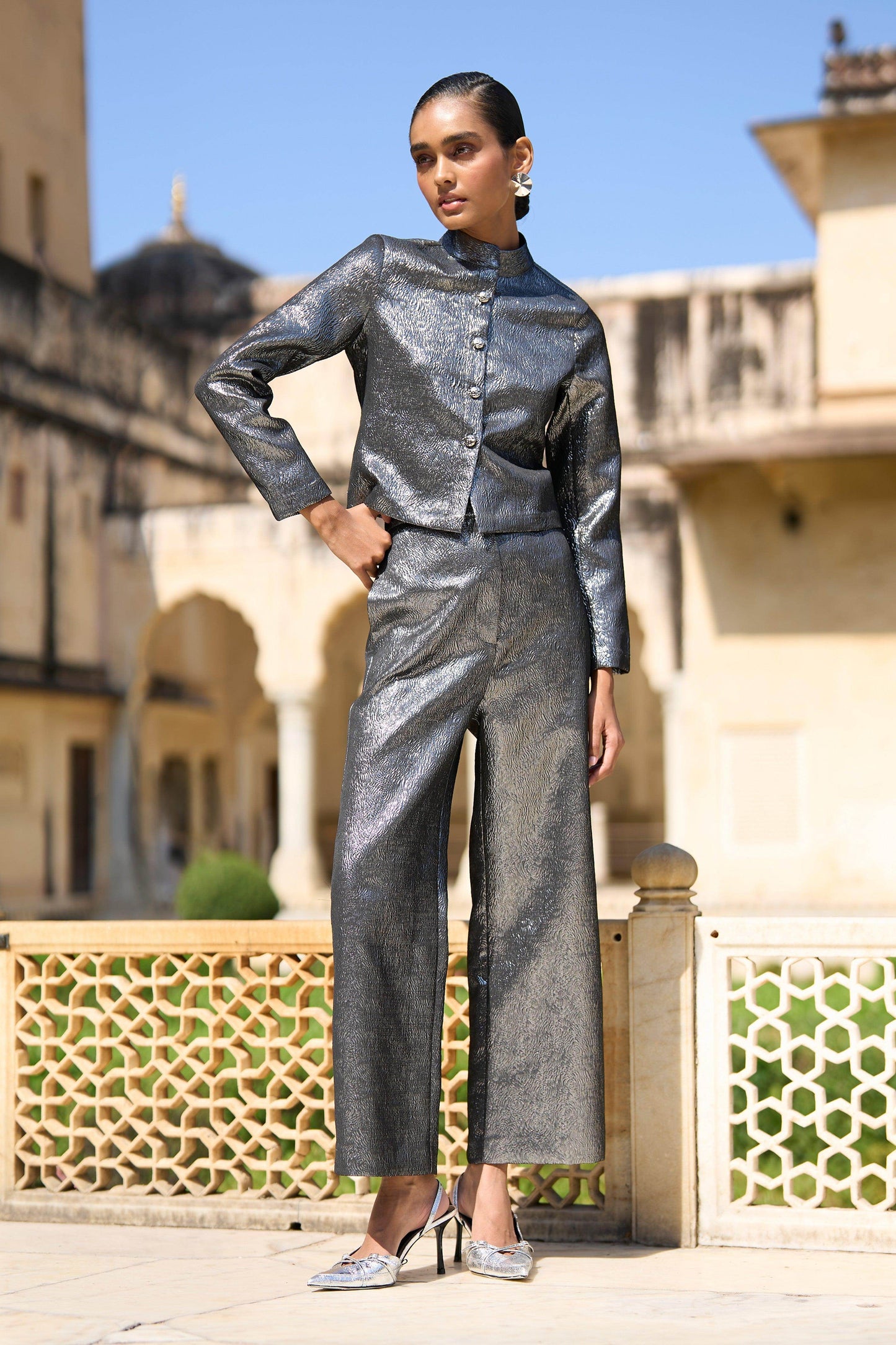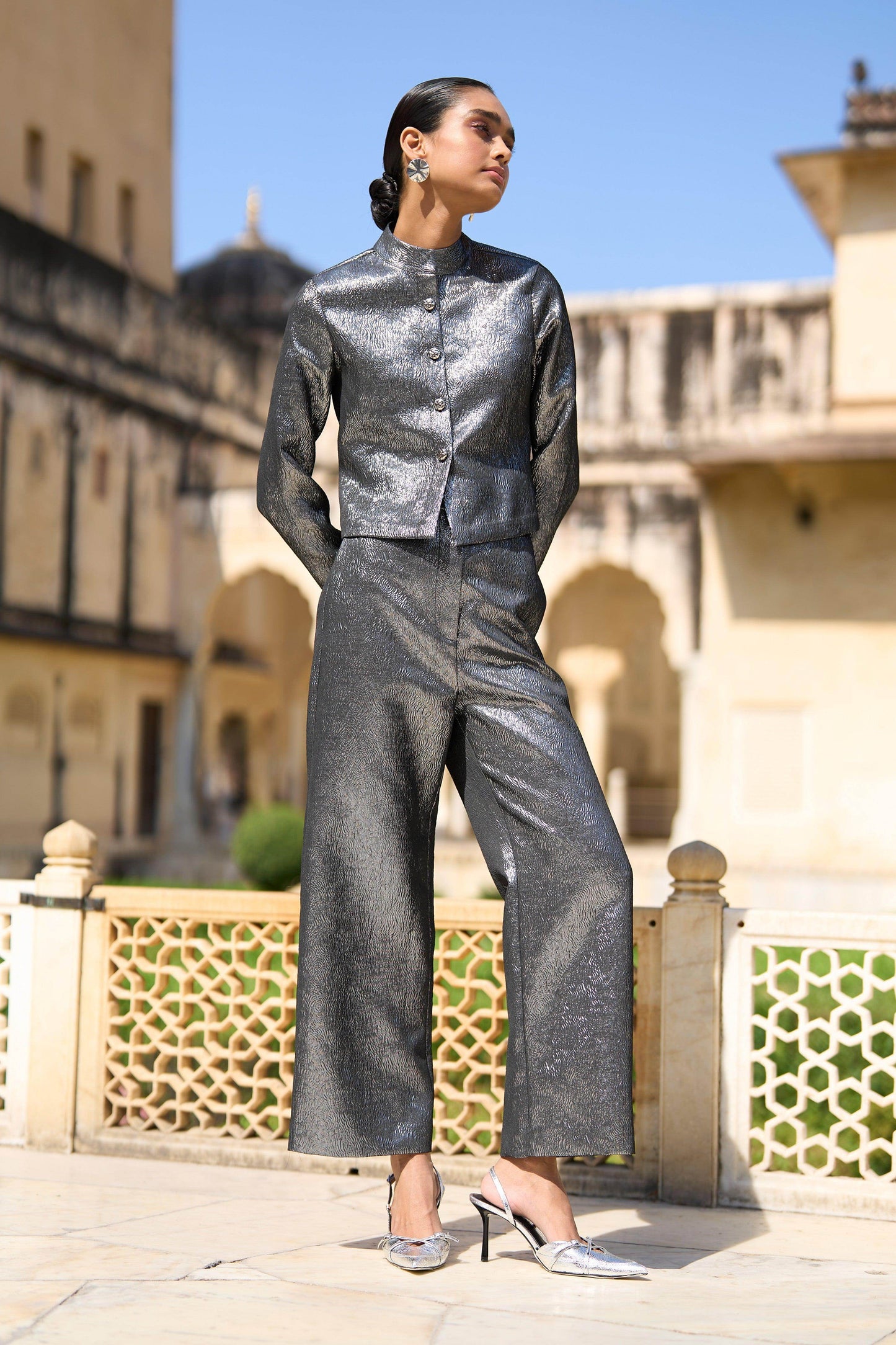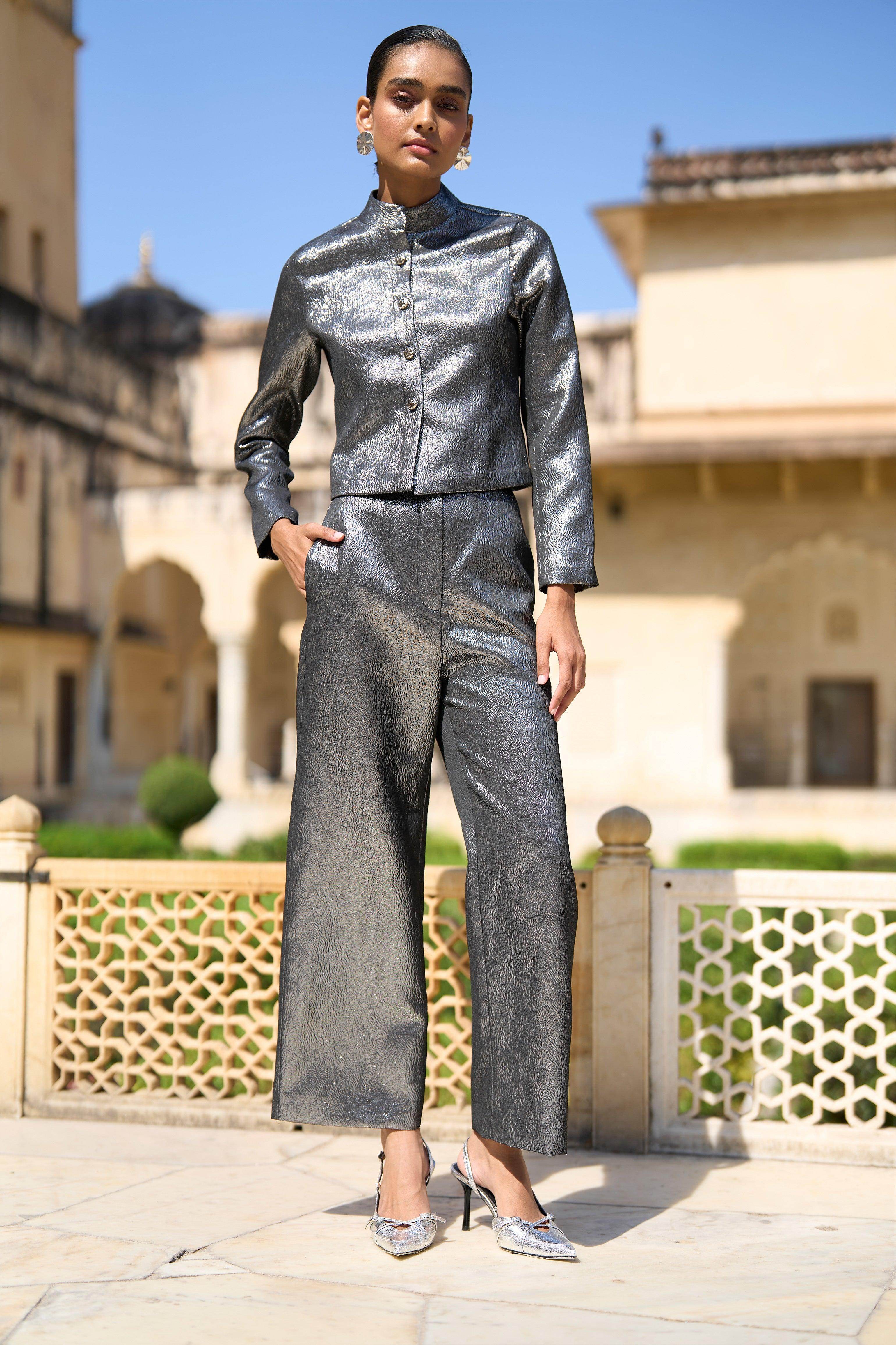 Straight pants in textured dark silver metallic fabric. Pockets in the sides, hook/eye and zip closure in the front.