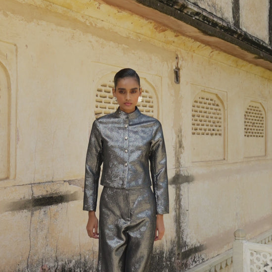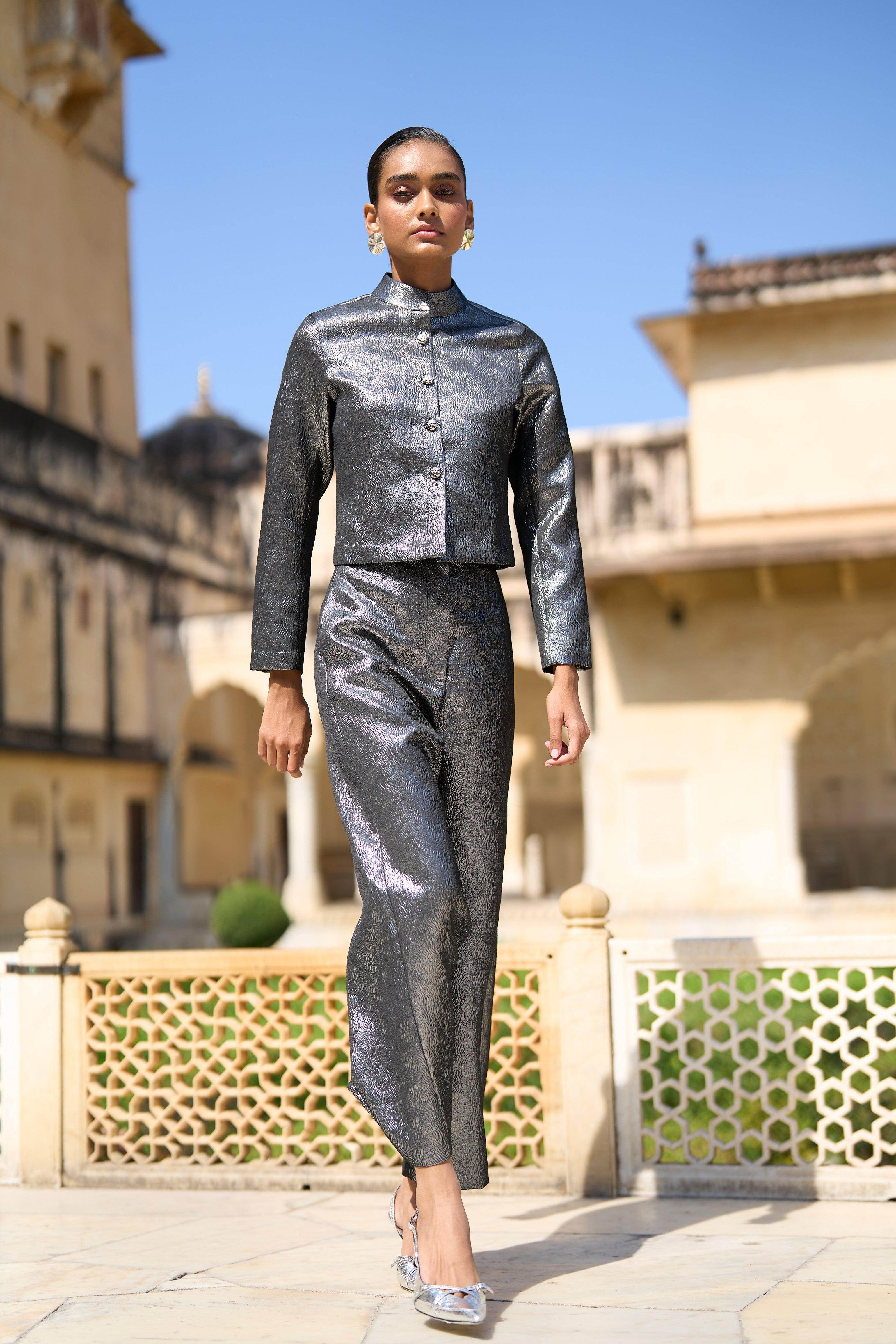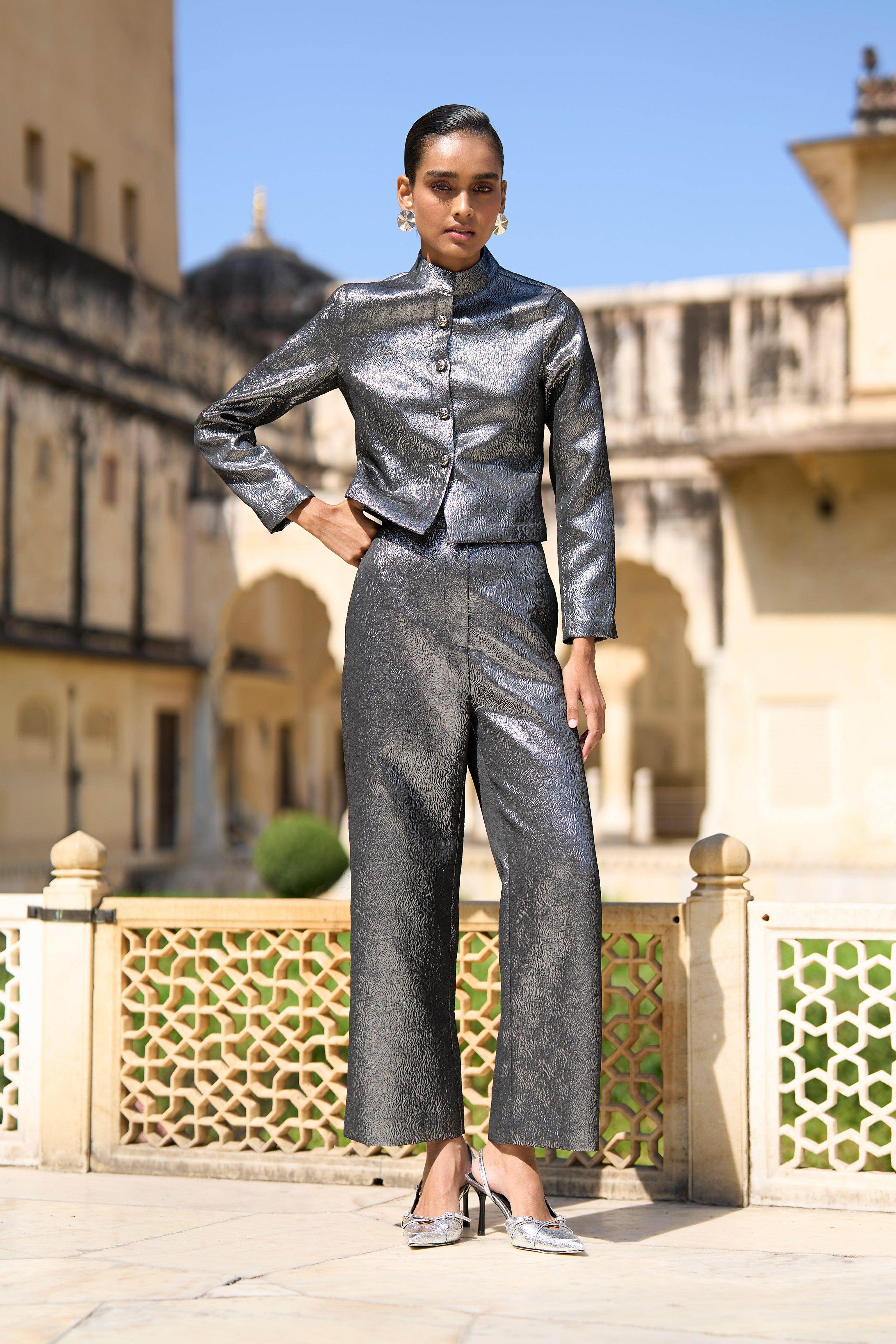 Straight pants in textured dark silver metallic fabric. Pockets in the sides, hook/eye and zip closure in the front.