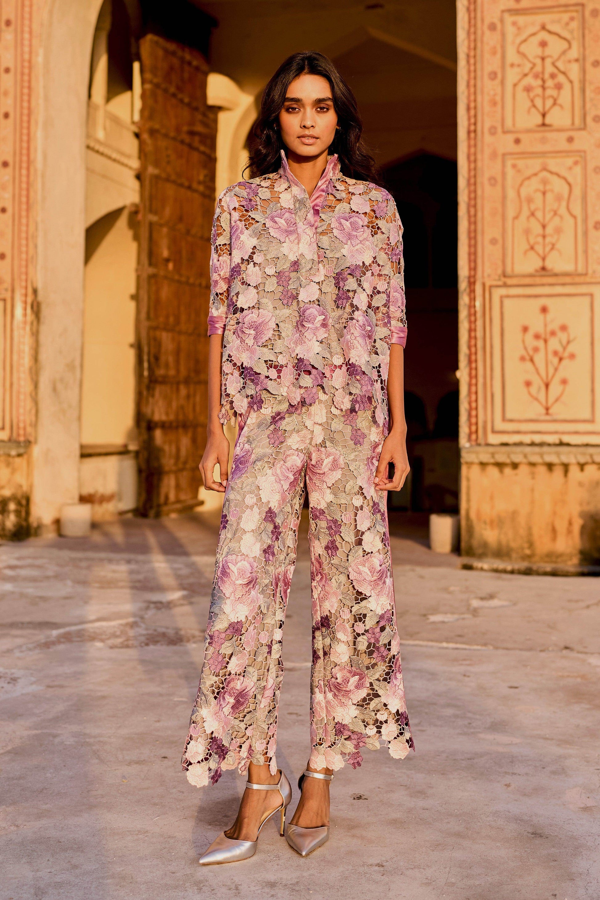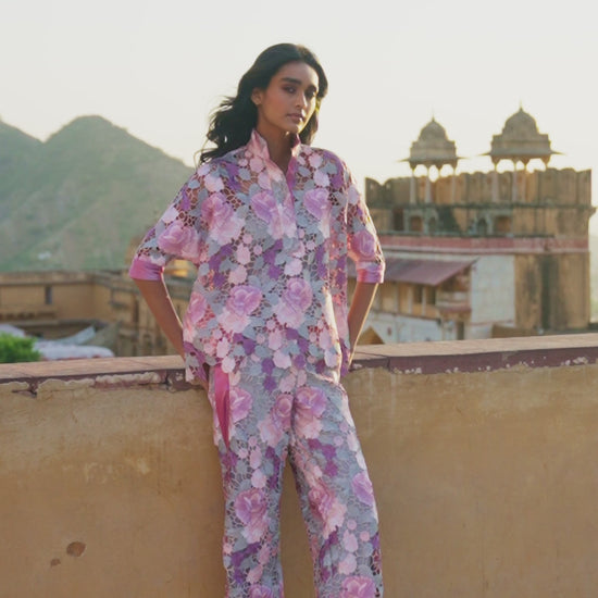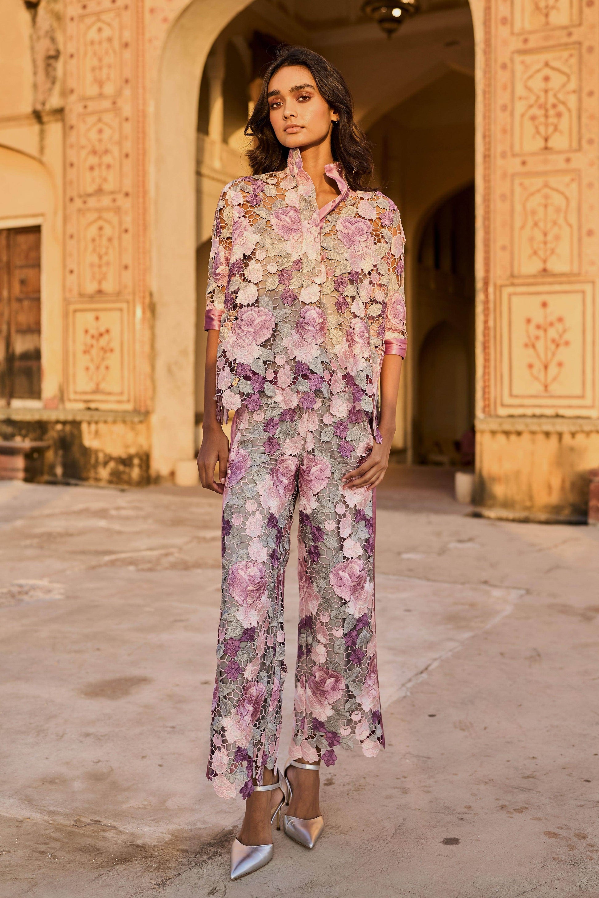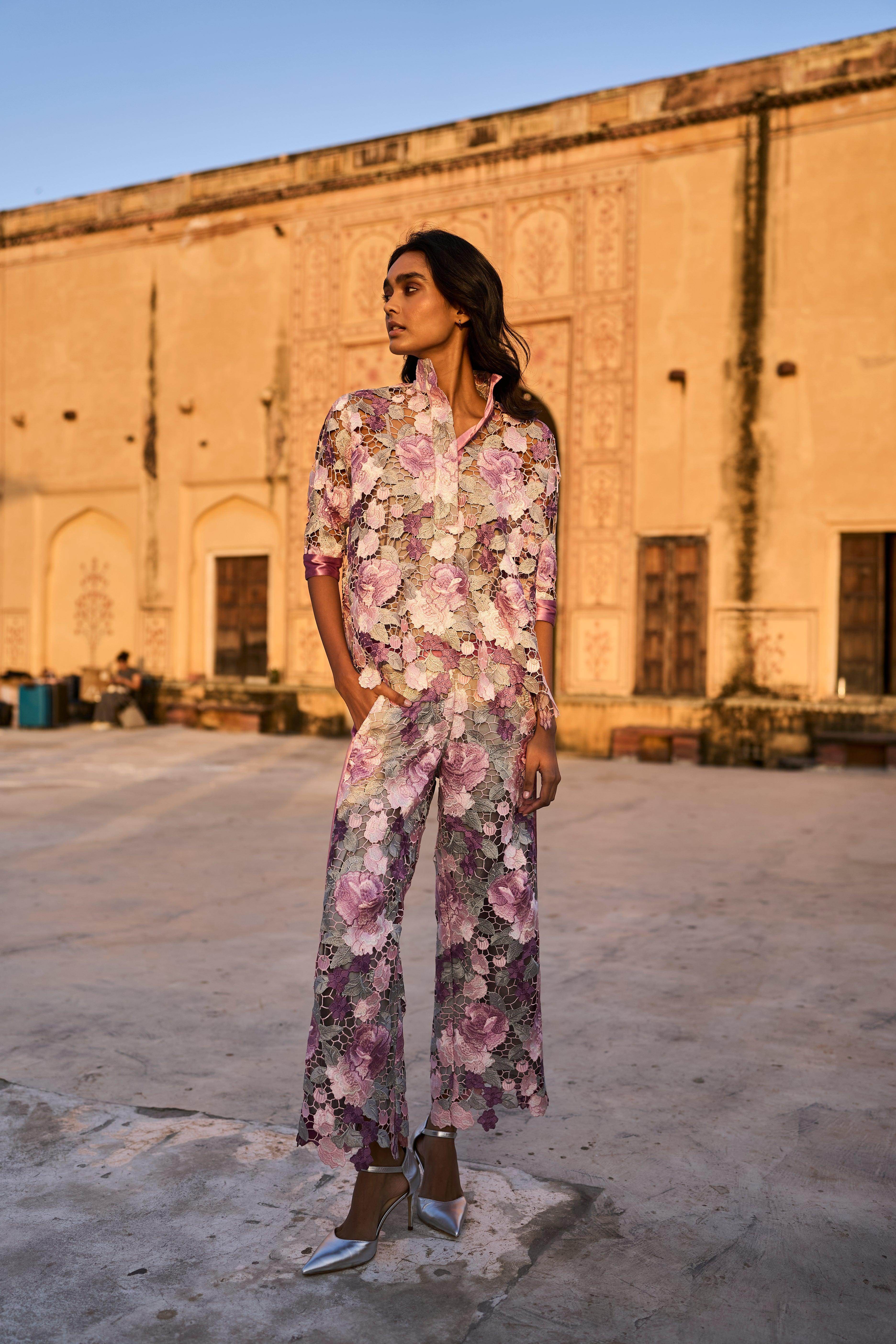 Delicate cutwork floral lace in tones of lavender and fuchsia with grey accents. Straight pant has scalloped hem, fuchsia fabric detailing on the waistband and side seams. Hook/eye and zip closure in the front, pockets in the sides. Garment is fully lined.
