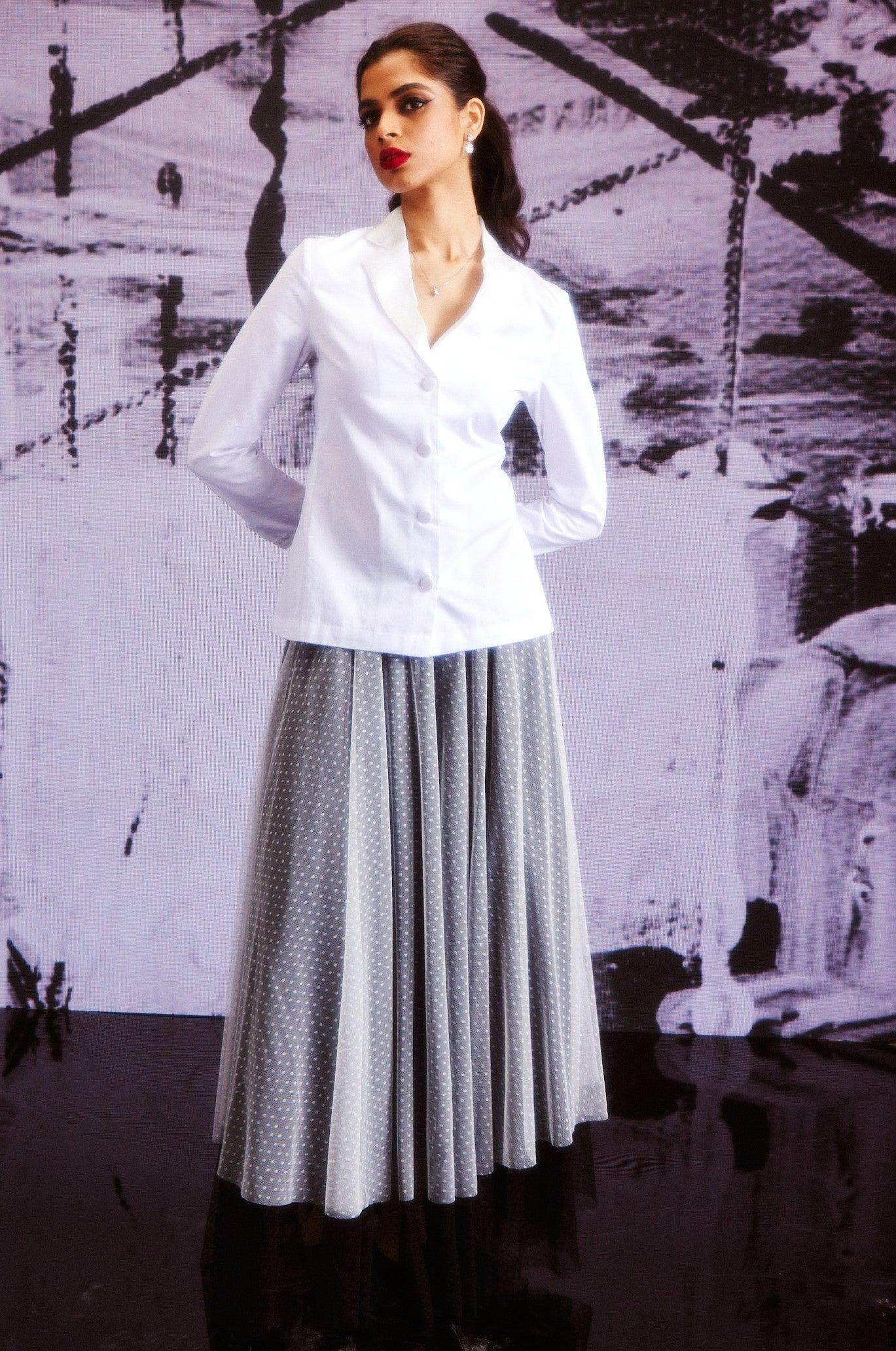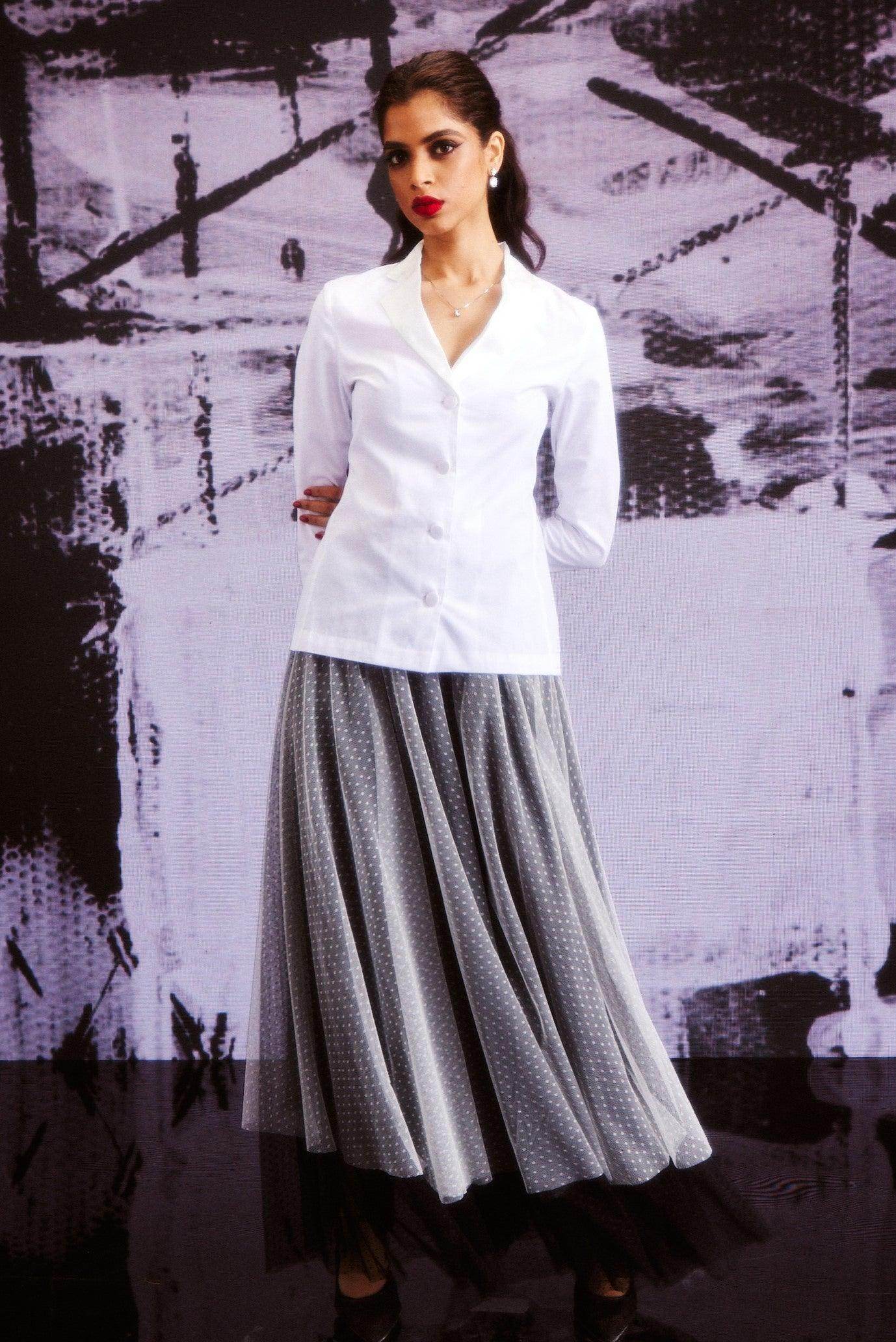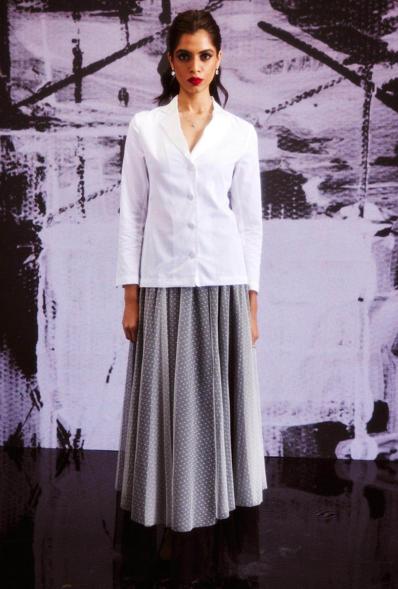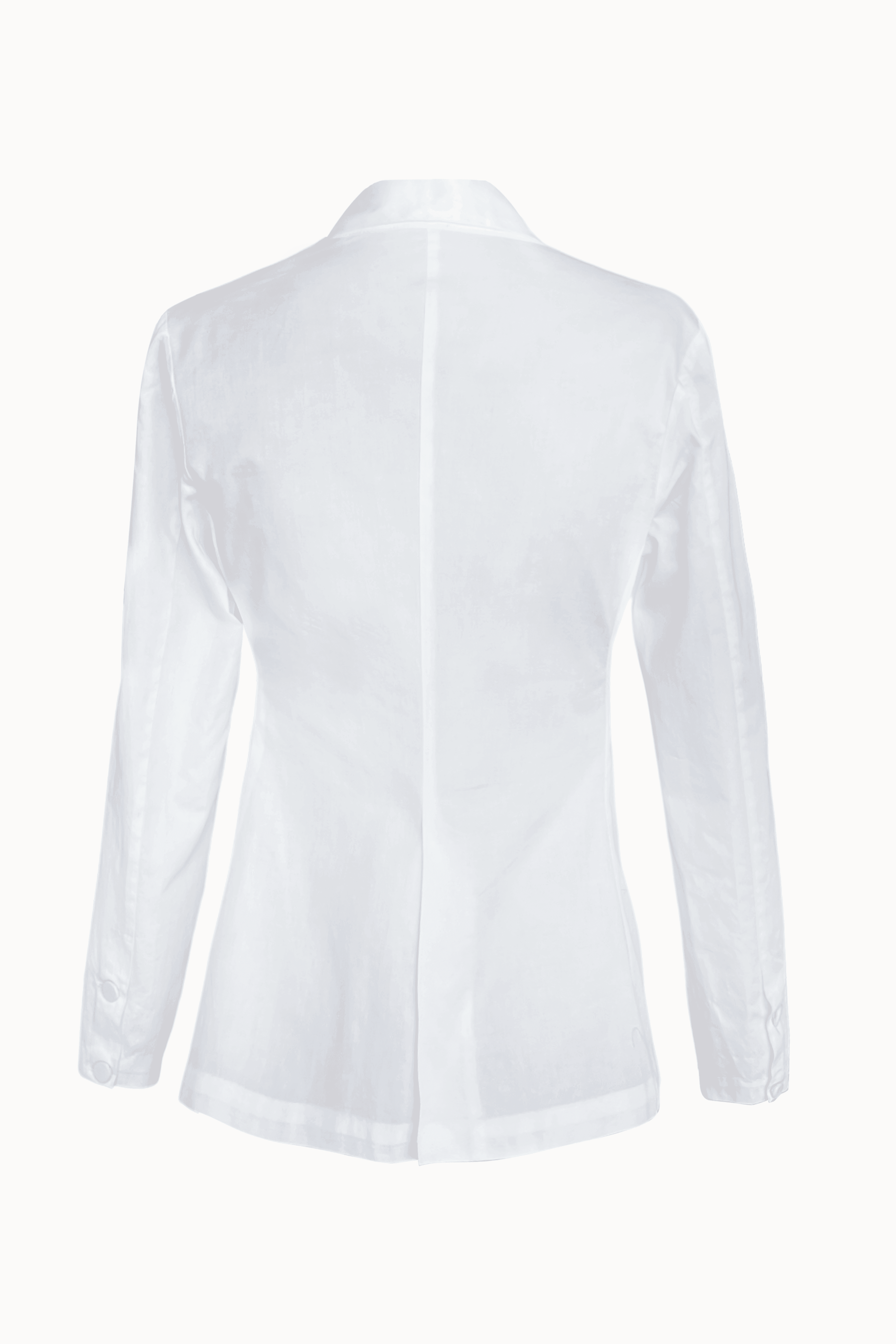 White cotton shirt in a blazer inspired pattern. Satin lapel detail, blazer-inspired fabric buttons at the center front and cuffs. Vents on the side to provide ease of movement..