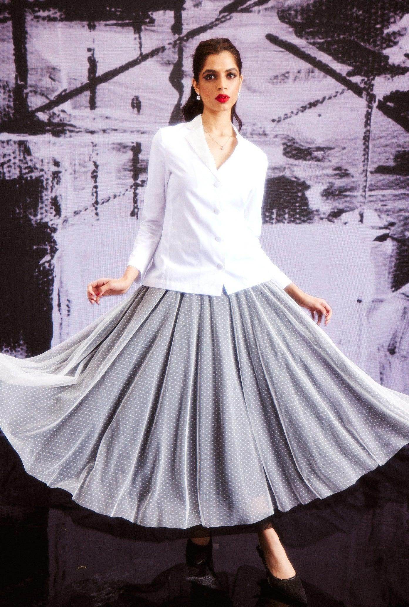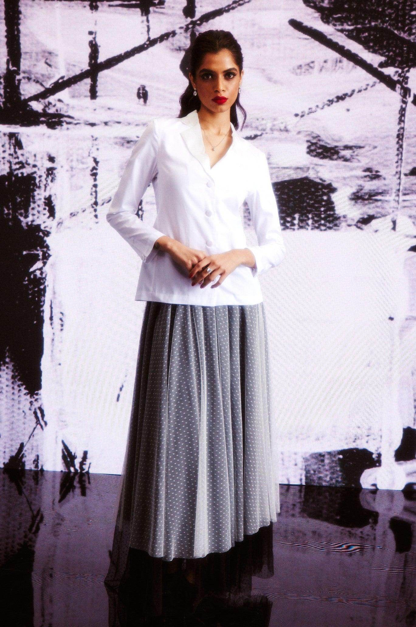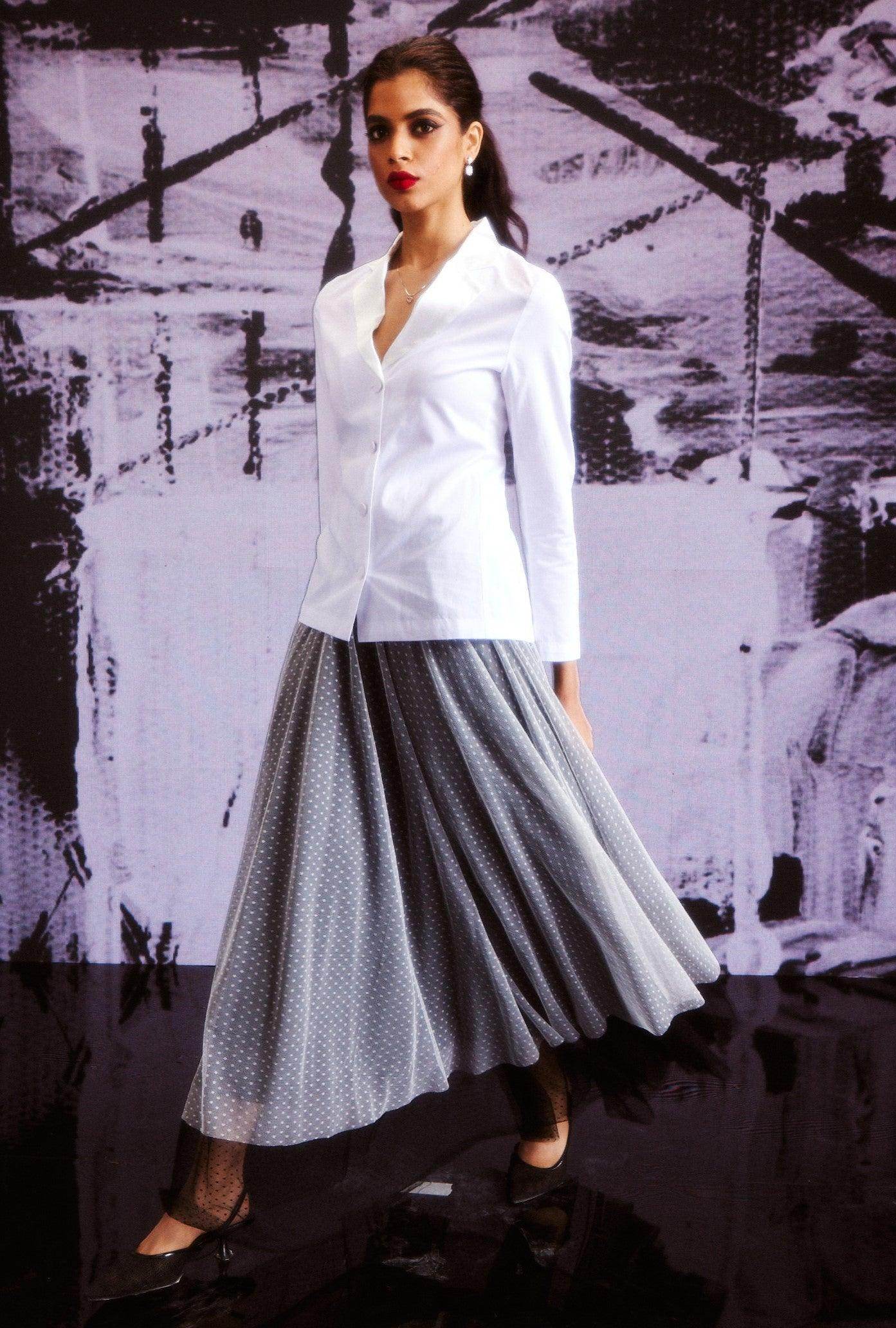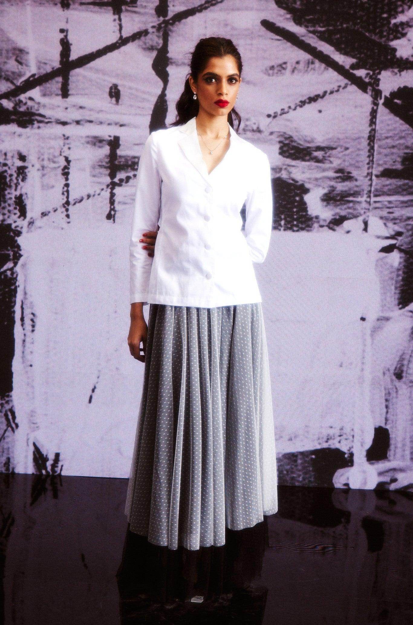 White cotton shirt in a blazer inspired pattern. Satin lapel detail, blazer-inspired fabric buttons at the center front and cuffs. Vents on the side to provide ease of movement..