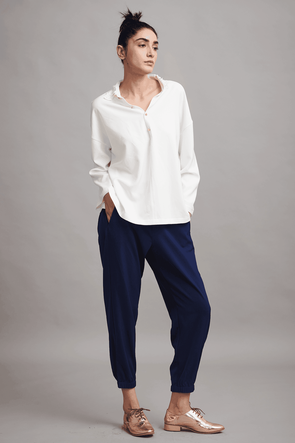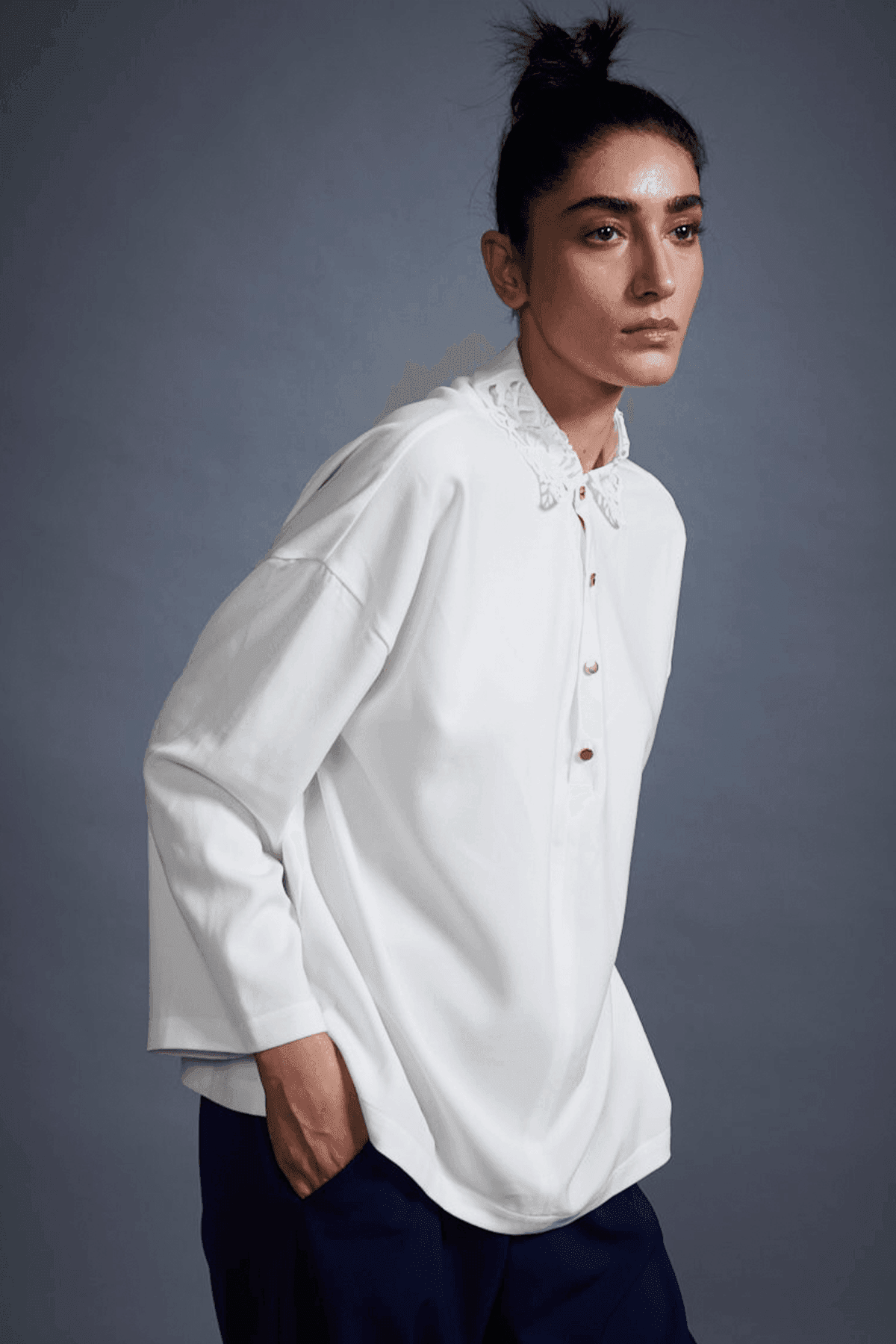 Popover shirt with floral cutwork collar. Classic gold button detail. Boxy fit.