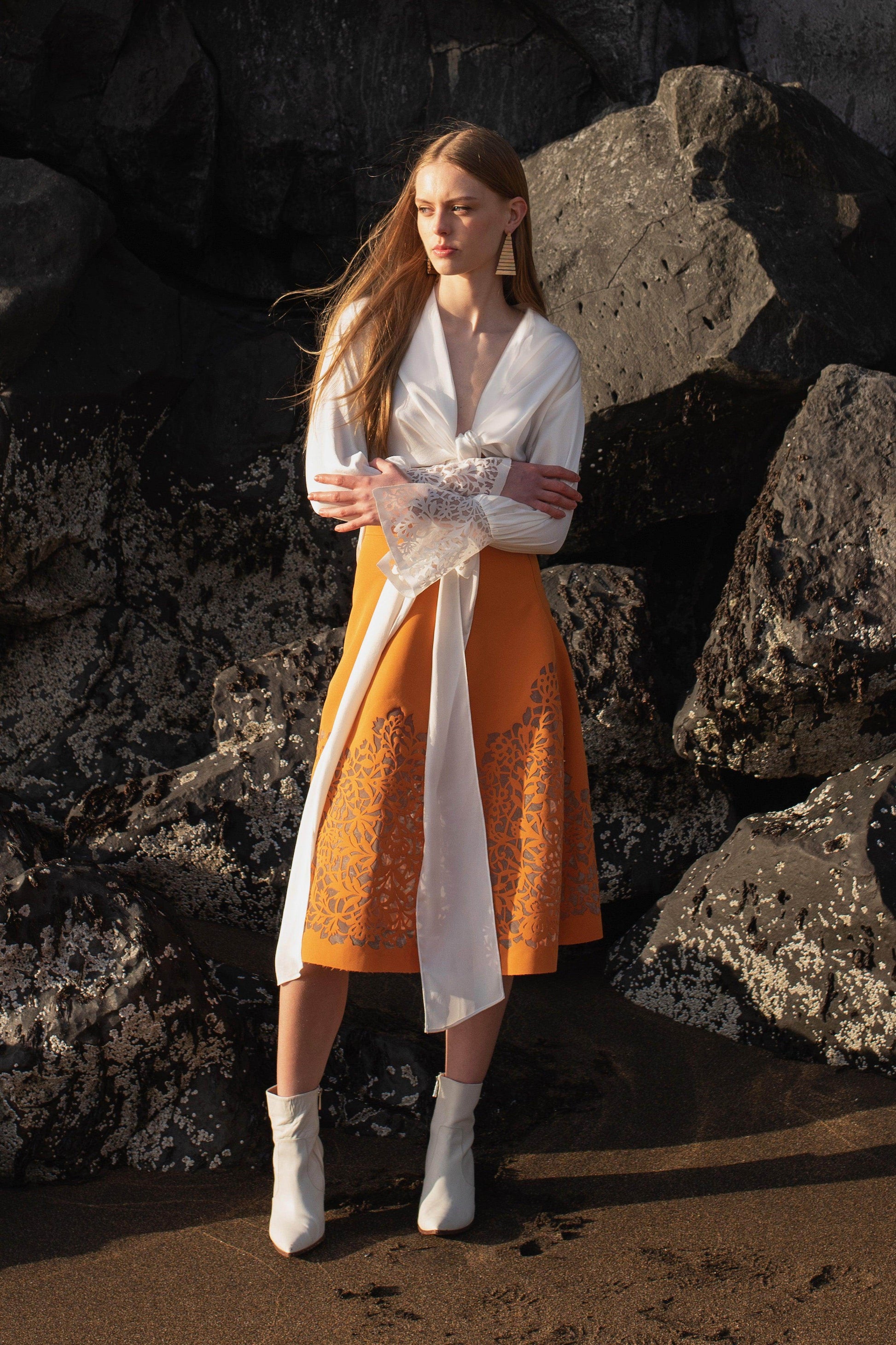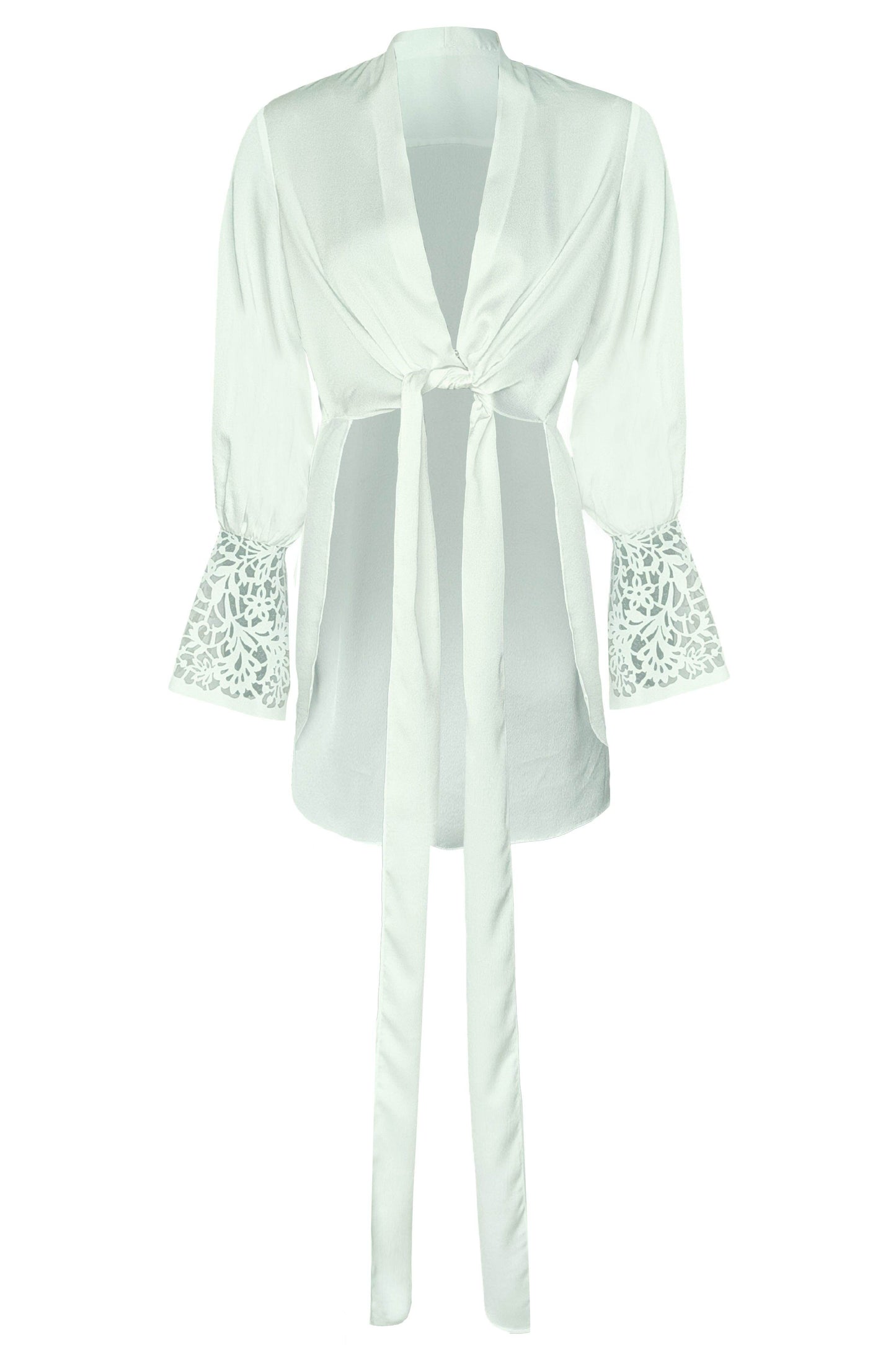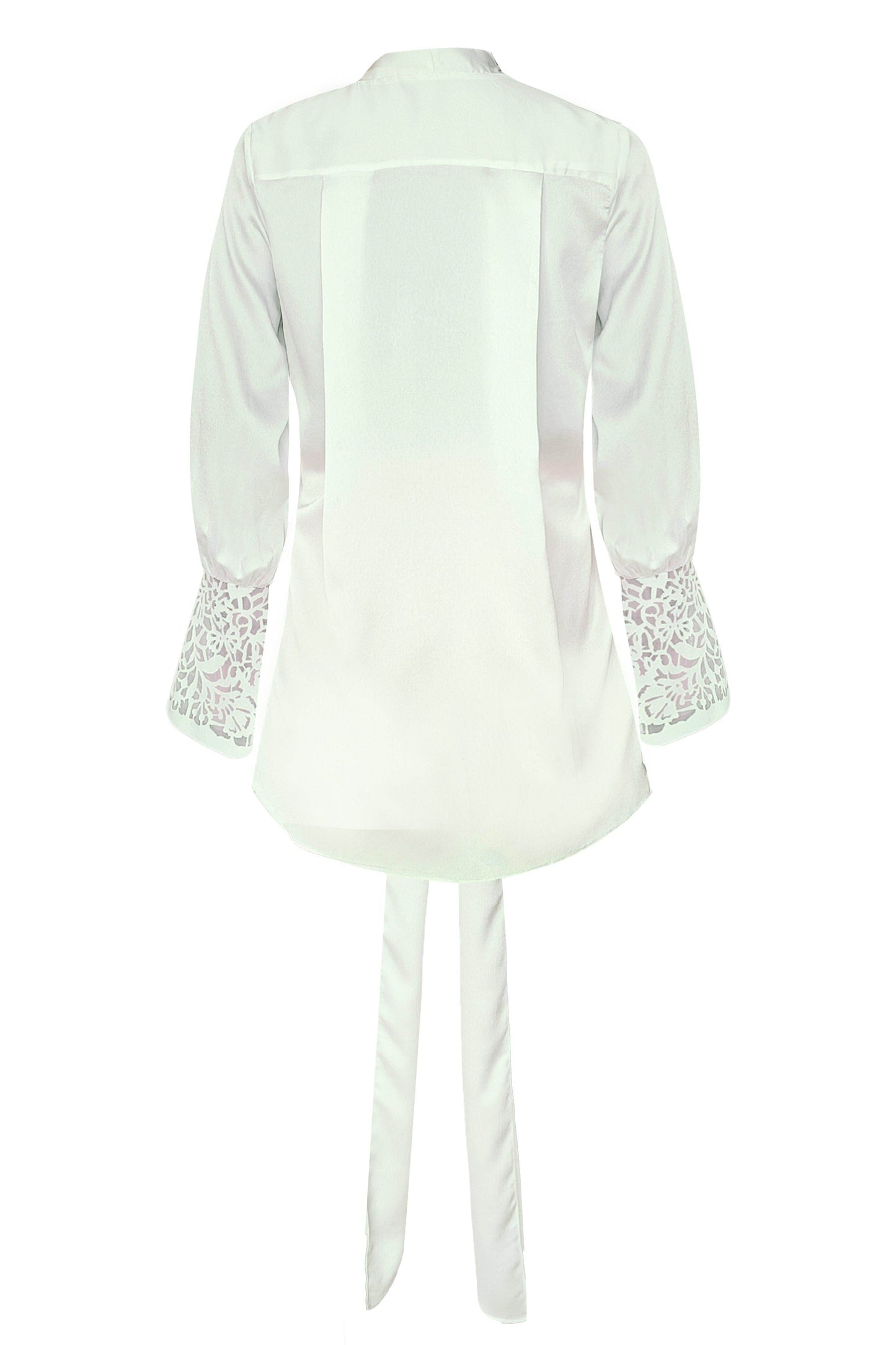 Ivory textured crape top with dramatic cutwork details placed on exaggerated sleeve cuffs. Front knot detail, with a low shirt hem in the back. Bishop sleeves with soft gathering at the cuff. V-neck and snap buttons in the front which are concealed by the knotted bow. The back has a box pleat to add volume and ease.