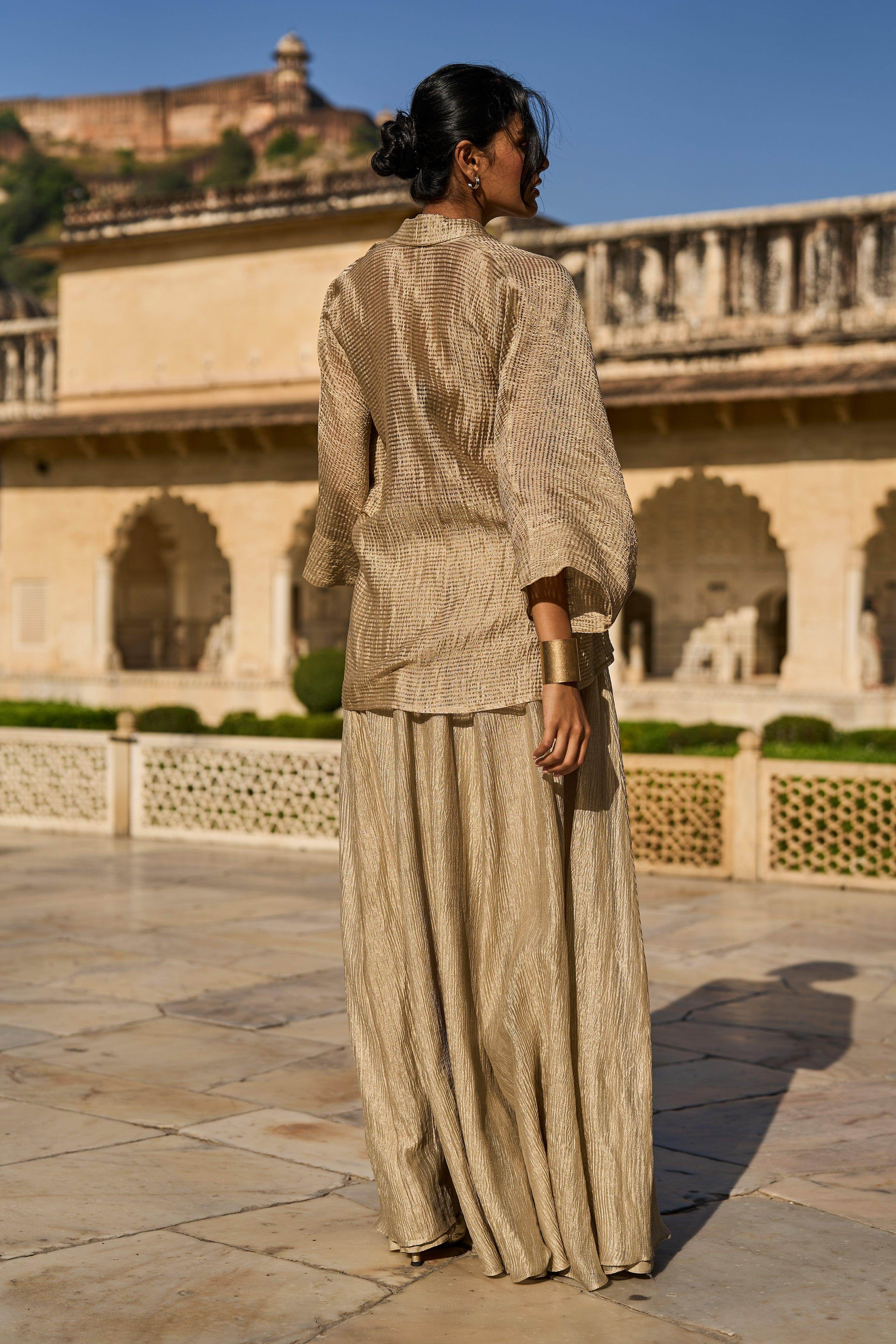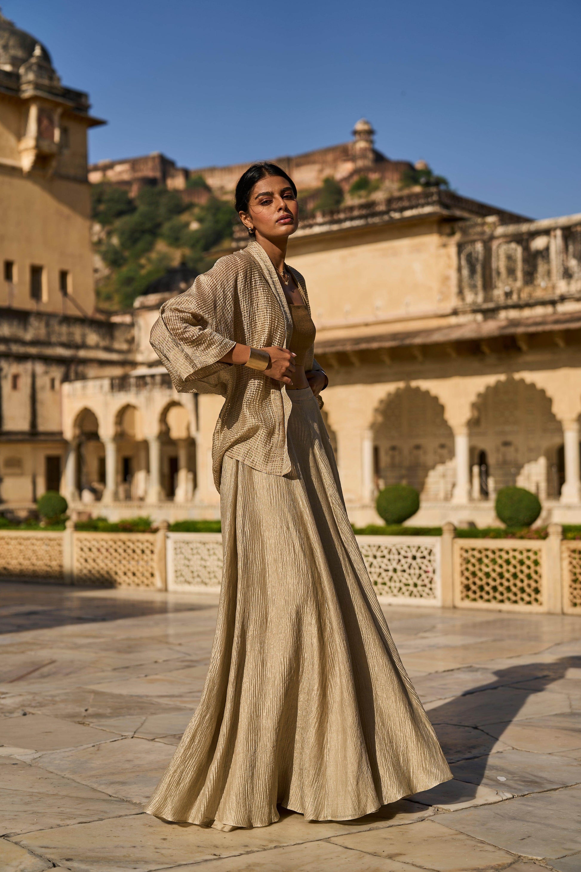 Flared maxi skirt in a gold tonal stripe crinkled tissue fabric. Dramatic movement due to the flattering A-line shape. Hook/eye and zip closure on the side. Garment is fully lined.