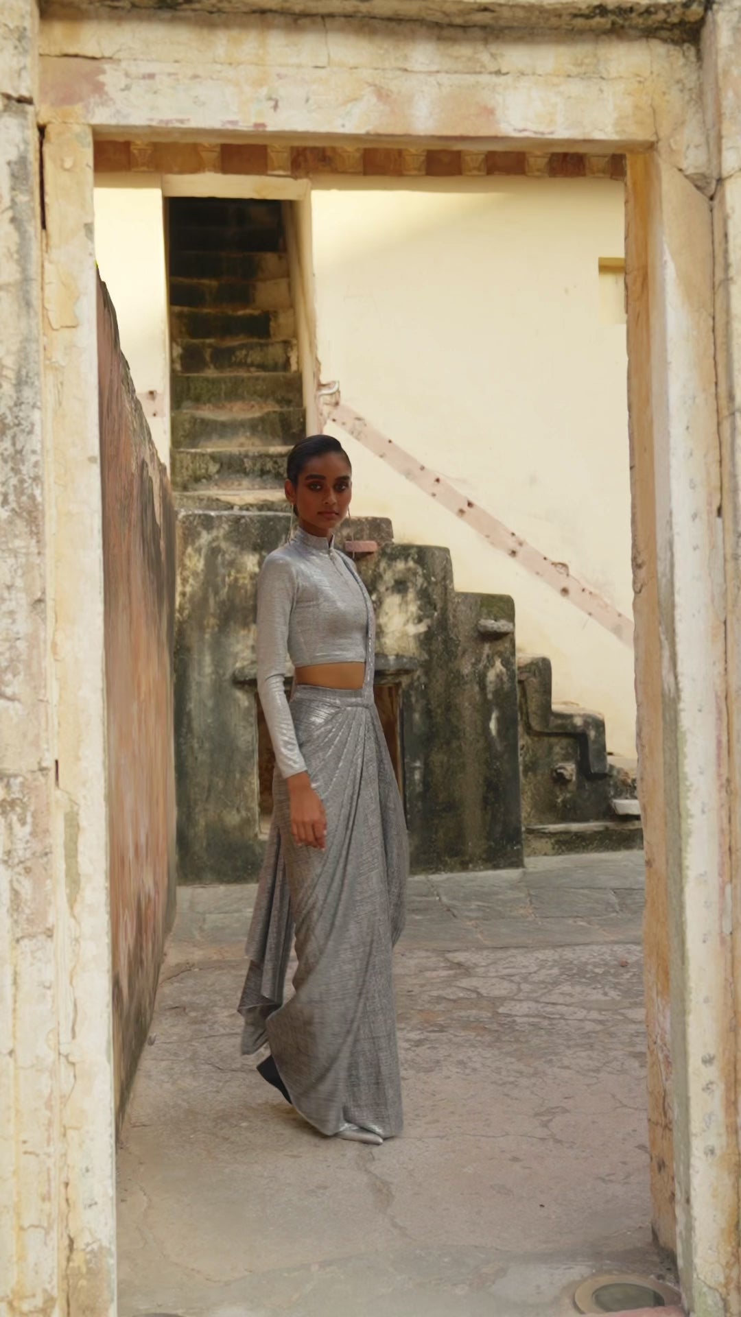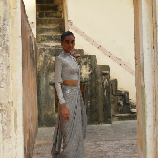 Draped skirt with hand applied pleats in a shimmering drapey pewter silver knit fabric. Free flowing pleated panel attached at the waist in a sari-inspired drape detail. Elasticated at the waist. Garment is fully lined.