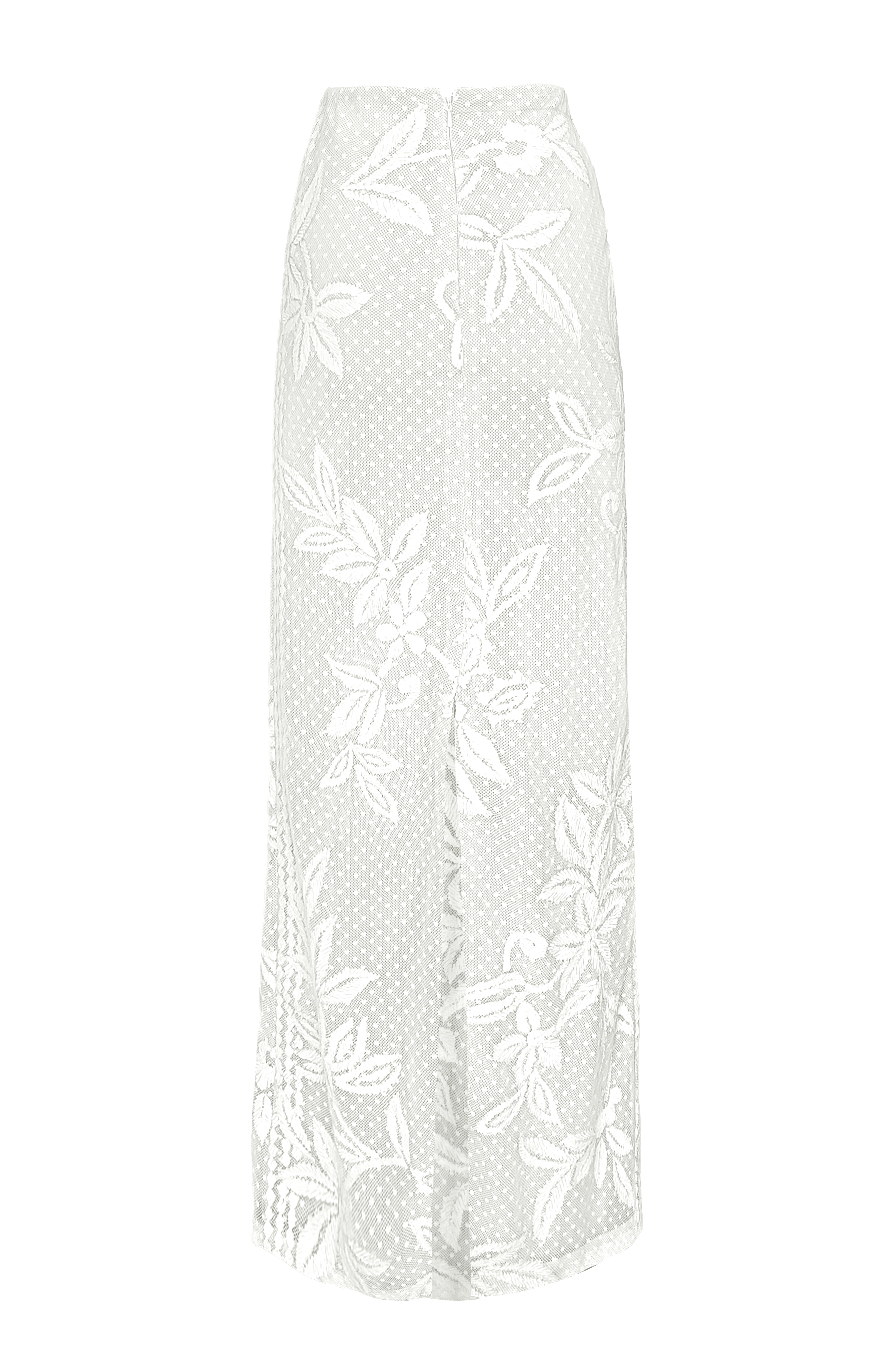 White skirt set in soft dotted cotton mesh. Gracefully placed floral ribbon embroidery on the front and back with a geometric border strategically framing the sides. Knee-high slit and zip and button closure at the back.