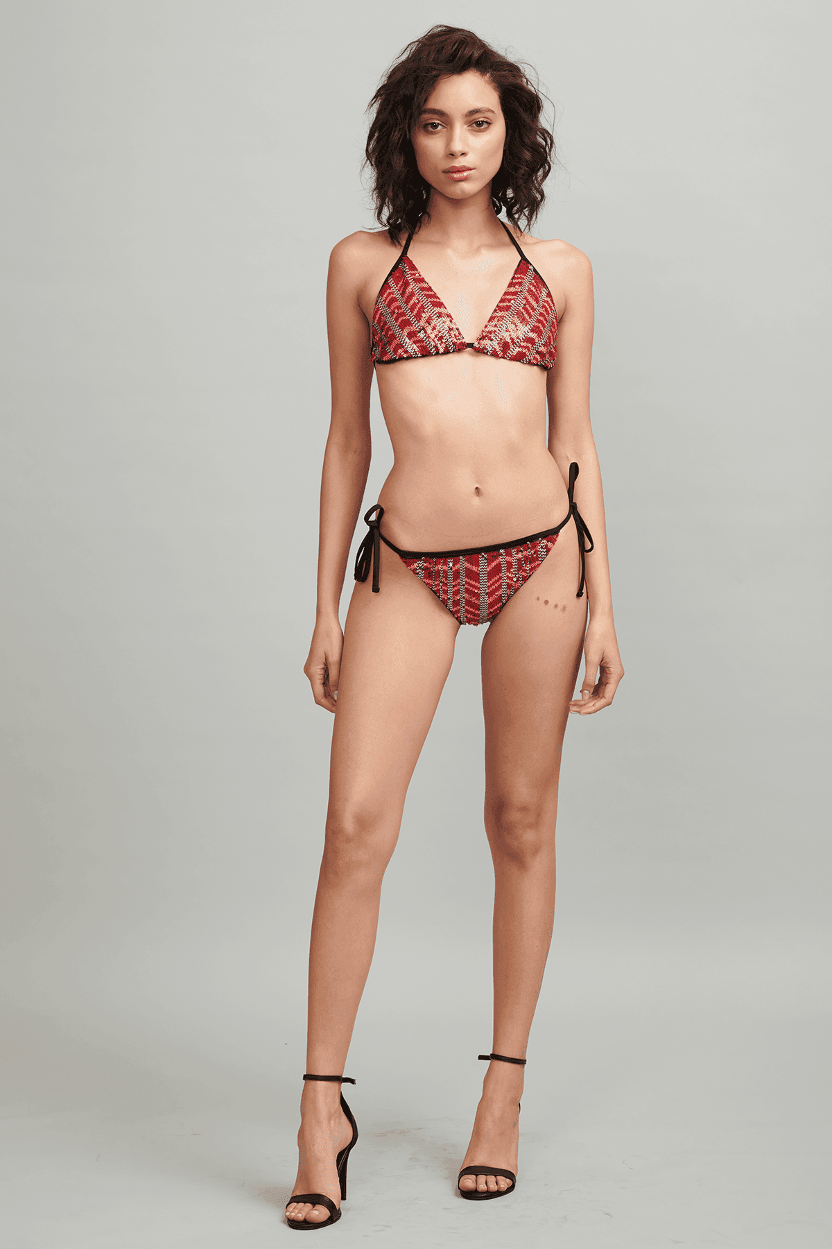 Red tonal geometric pattern created with recycled sequin. Made of high-performance, sustainable techno-fabric; 100% recycled polyester from pre and post-consumer materials. Resistant to chlorine, suntan creams, and oils.