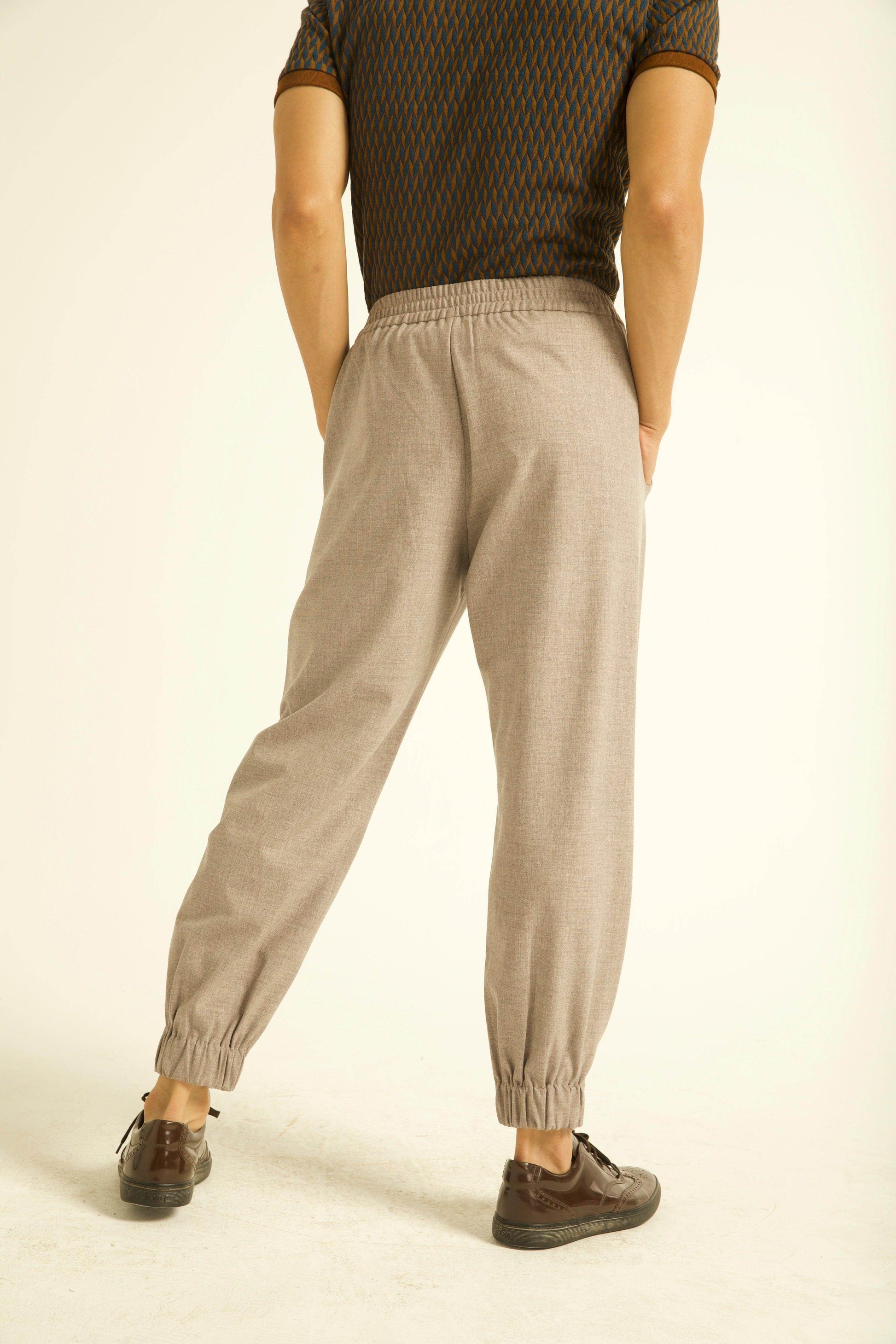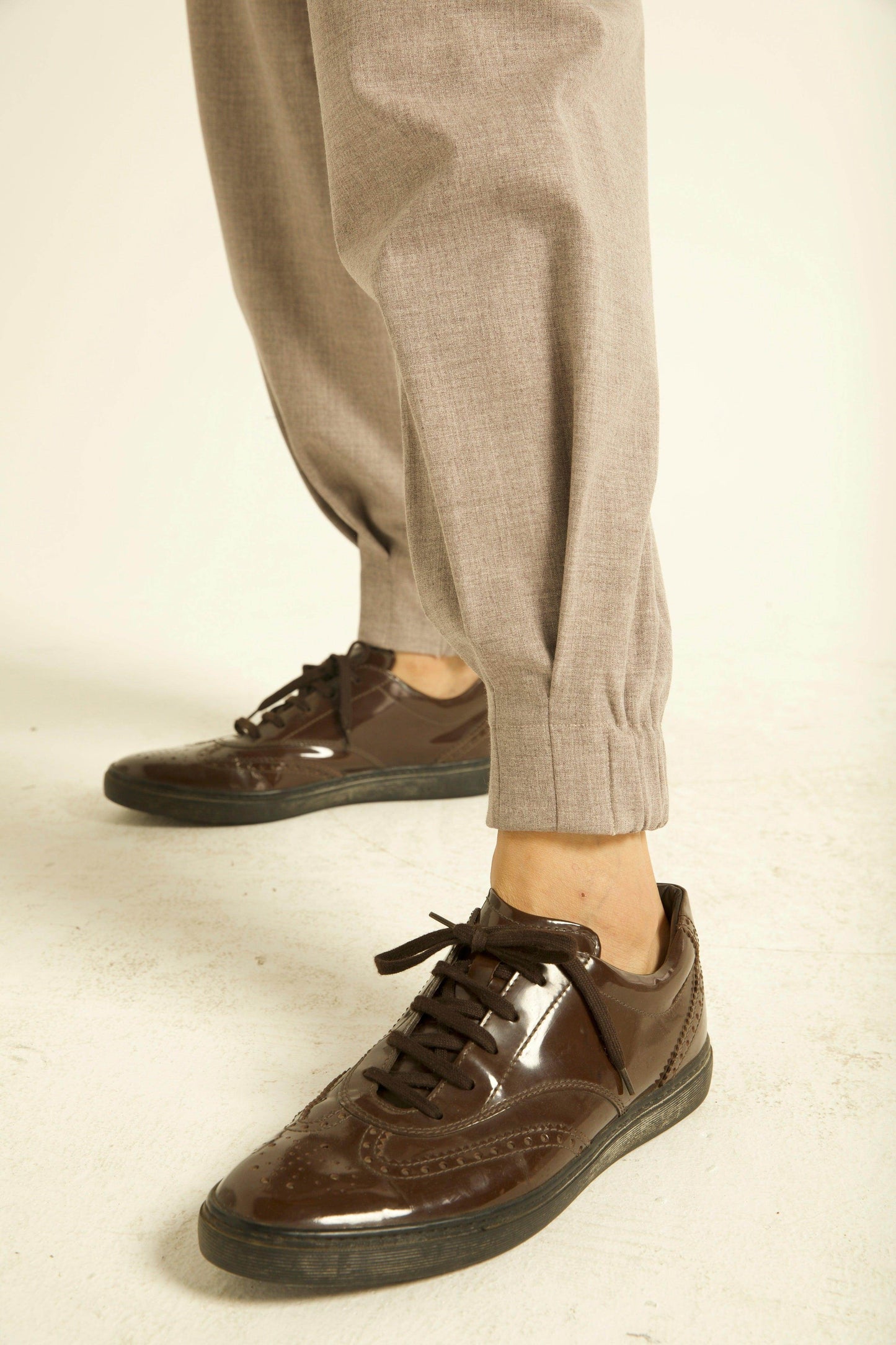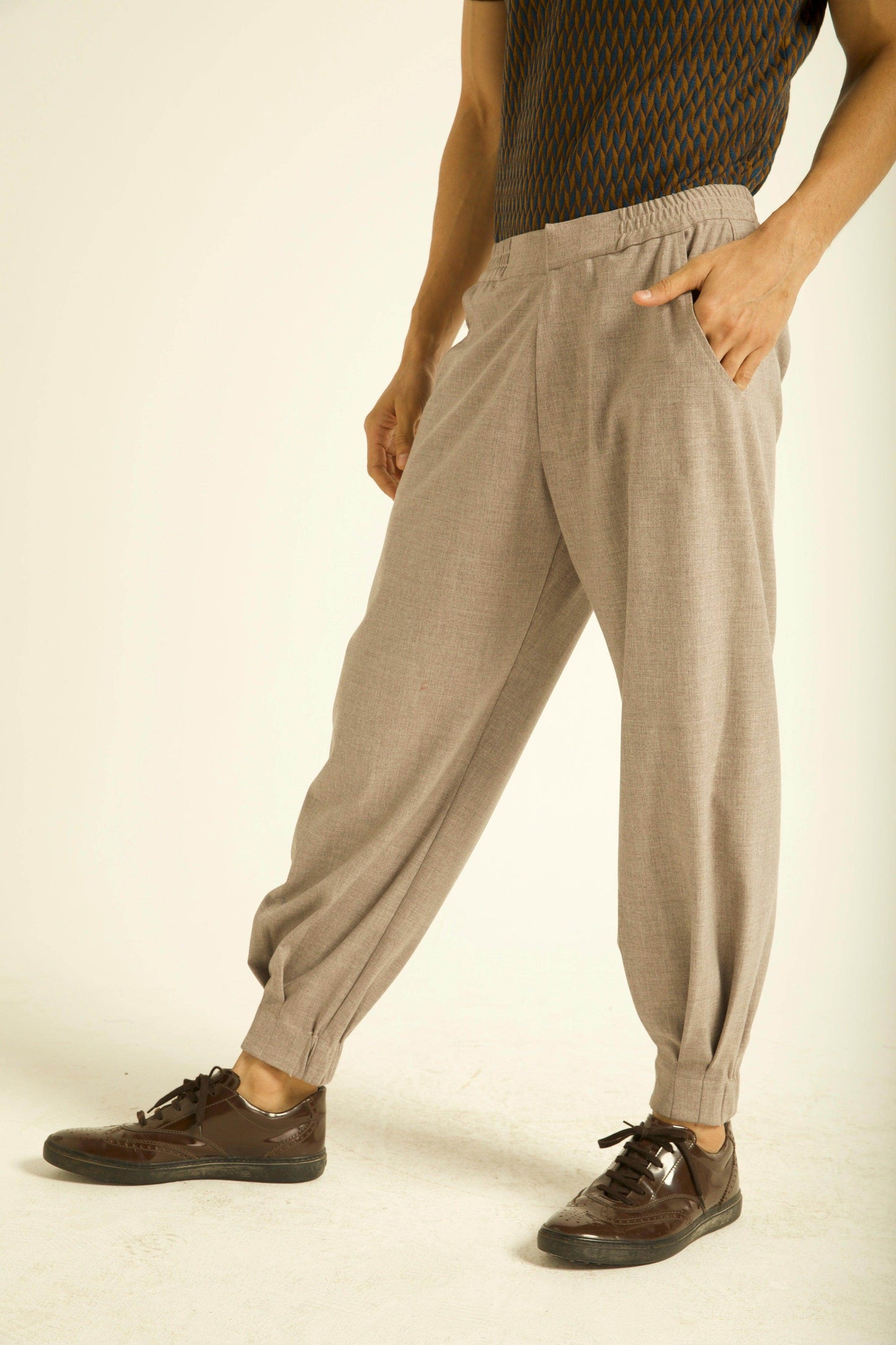 Harem style pants with box-pleat cuff. Elasticated waist and cuff.