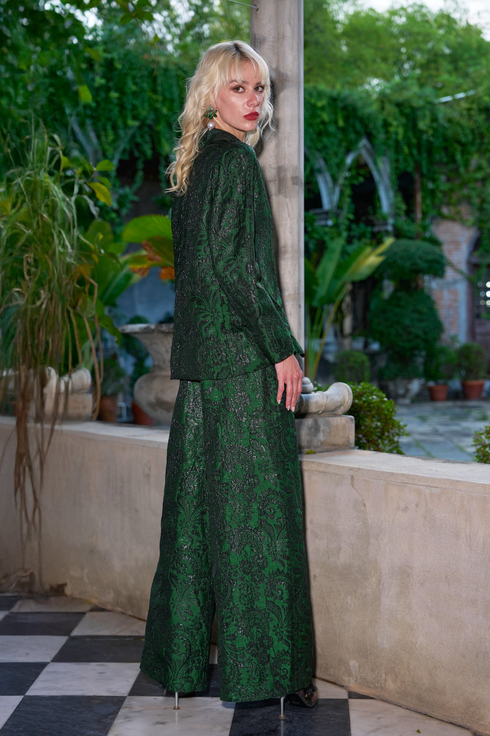 Shawl collar blazer jacket in emerald with allover paisley and floral motifs in tones of black. Full sleeves and a straight hem. Subtle metallic sheen across the brocade surface. Garment is fully lined.