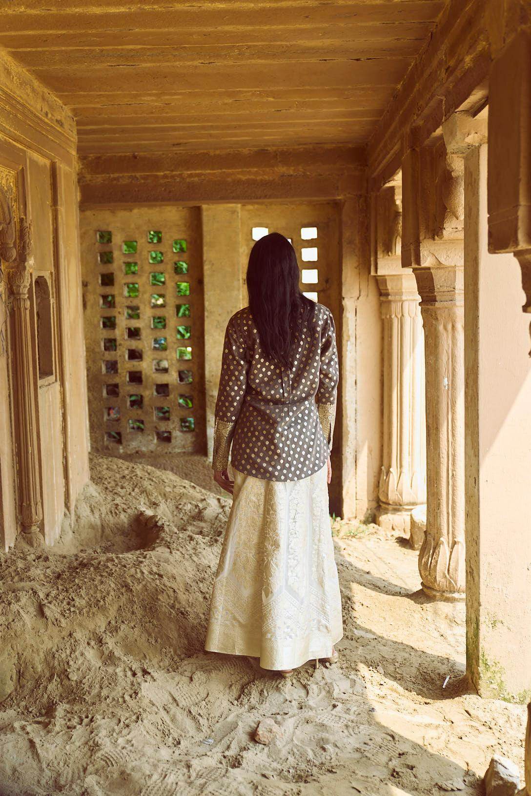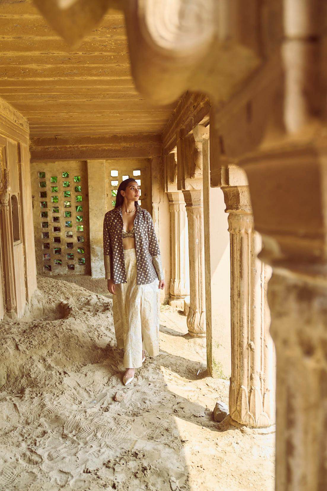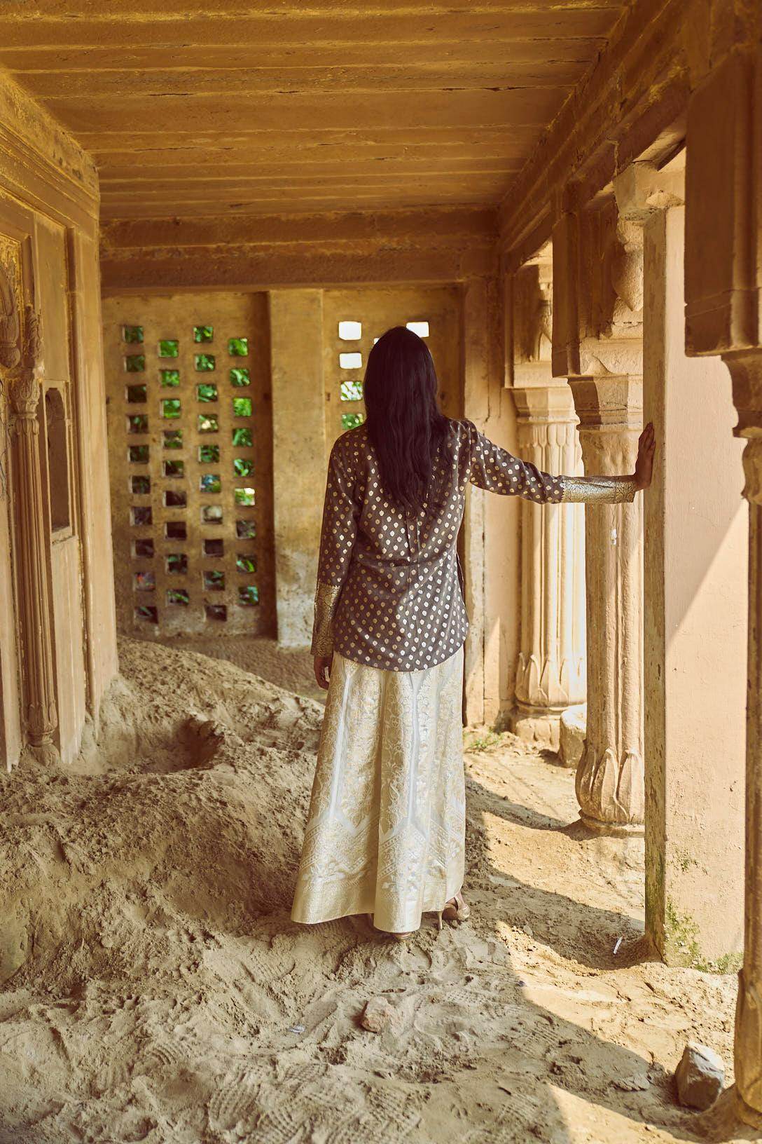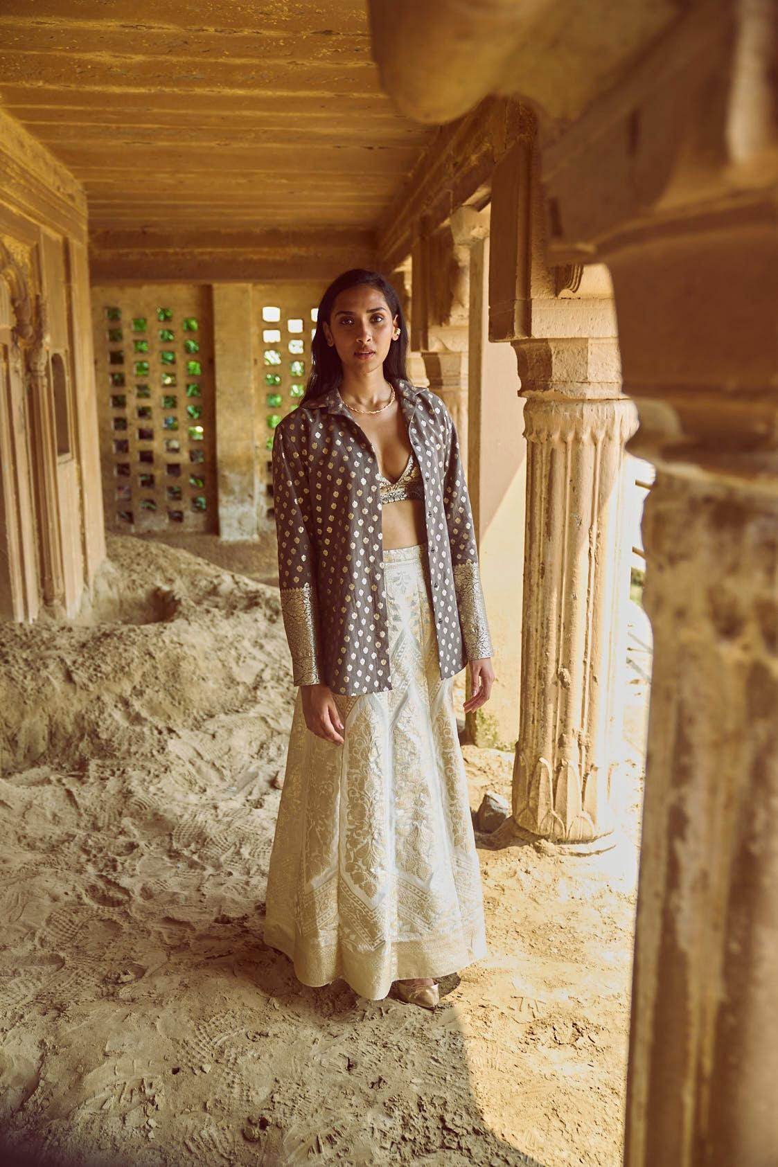 Stone grey shirt in lurex champagne chanderi brocade motifs. Placed borders on the sleeves cuffs of the shirt. Slit on the sides. Snap button closure at the front. Box pleat at the back.
