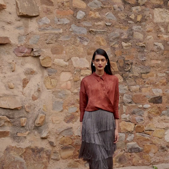 Layered fringe maxi skirt with tiered layers of cascading fringe. Concealed side zipper. Lace at the waist. Garment is fully lined.
