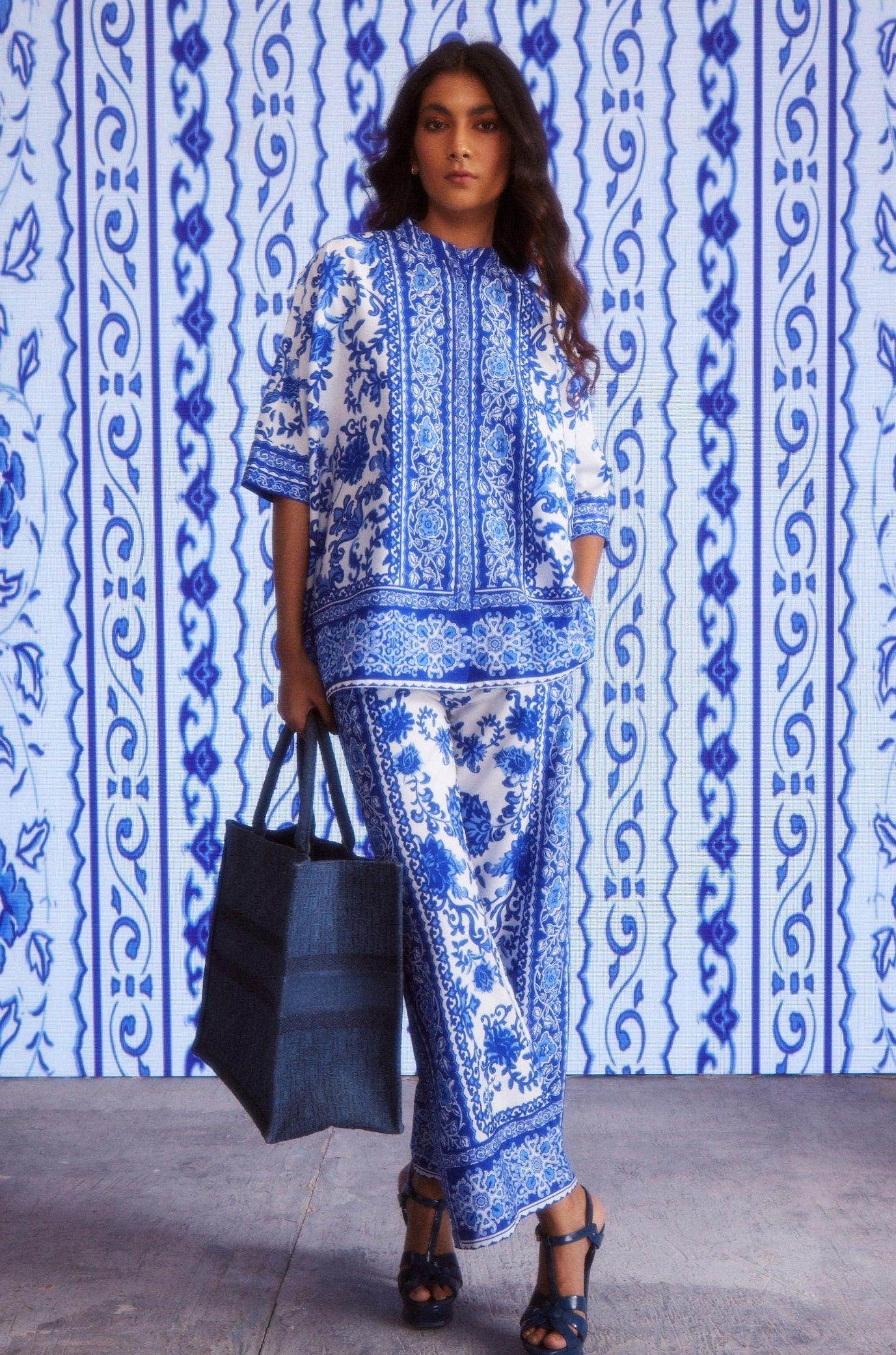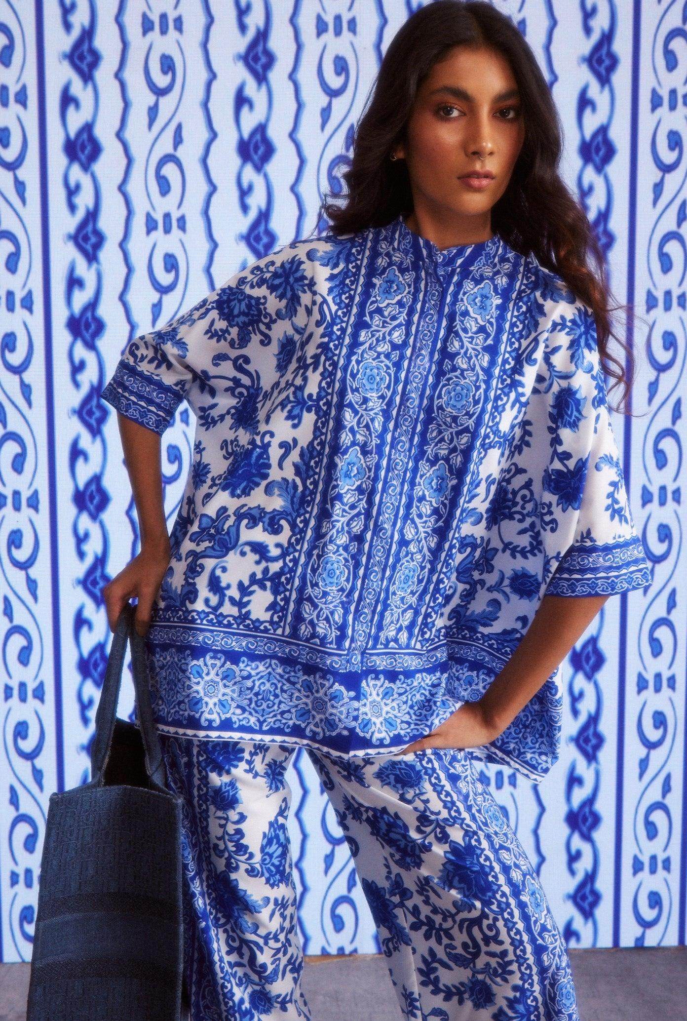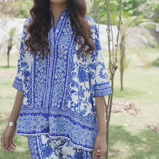 Blue on white floral ceramic-inspired printed coord set. Placed borders around the center placket, sleeve cuffs, and the bottom hem of the top. Button-down half sleeve boxy shirt with snap button closure.