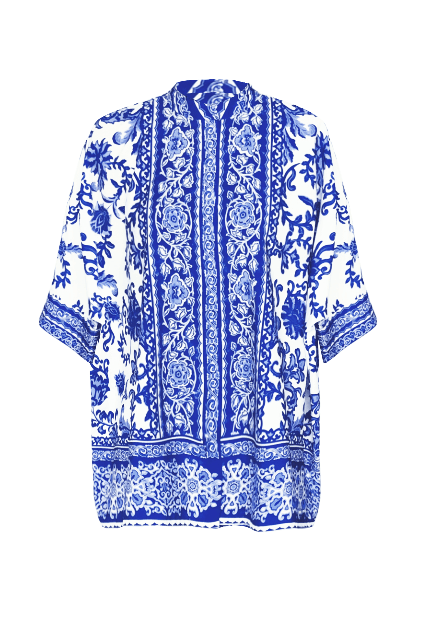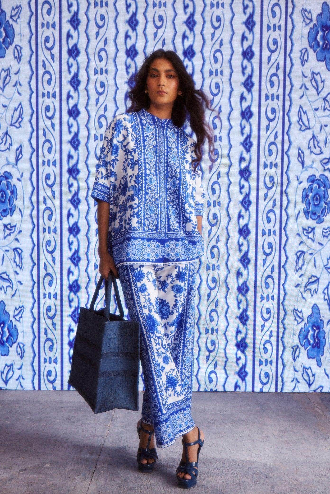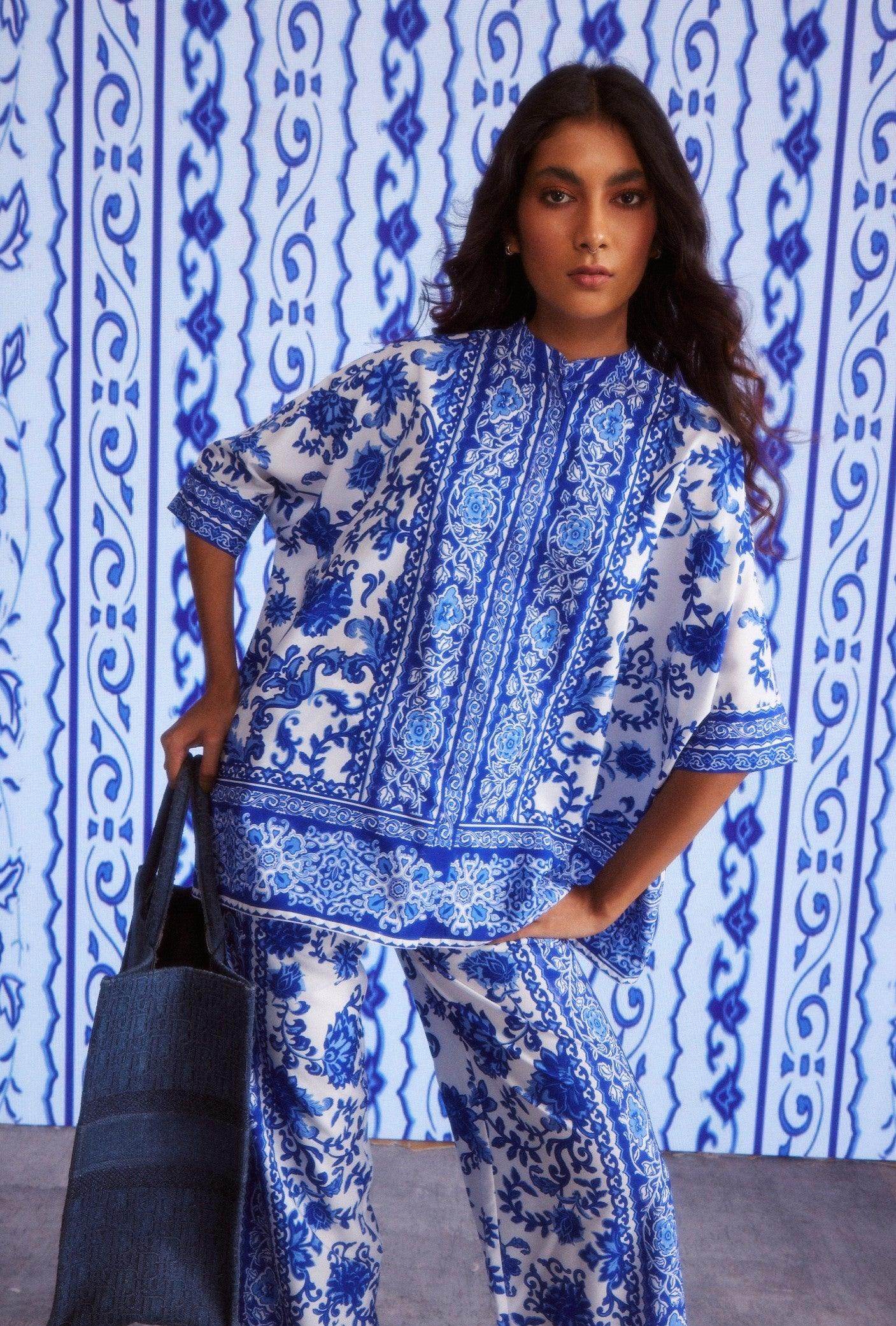 Blue on white floral ceramic-inspired printed coord set. Placed borders around the center placket, sleeve cuffs, and the bottom hem of the top. Button-down half sleeve boxy shirt with snap button closure.