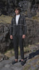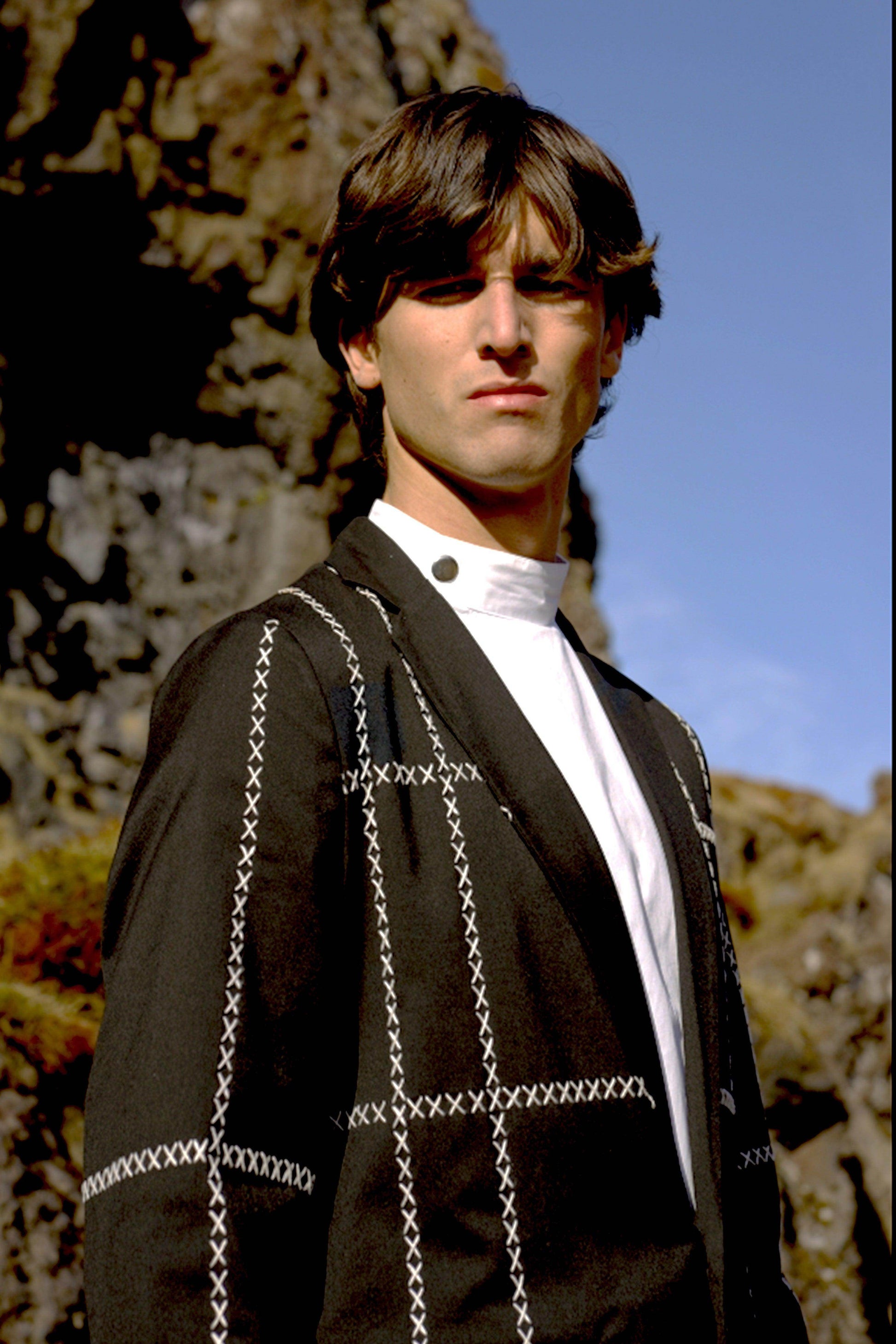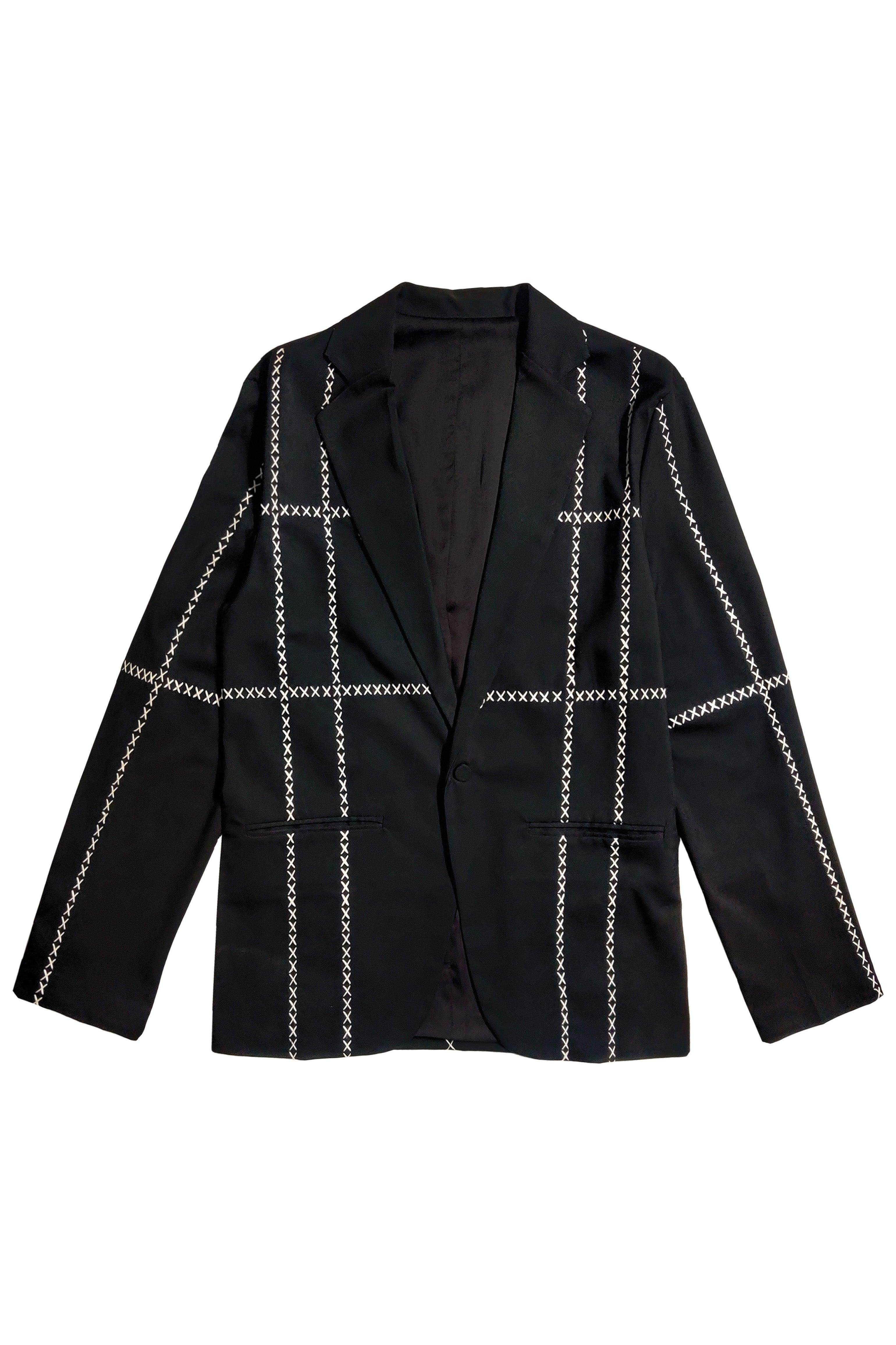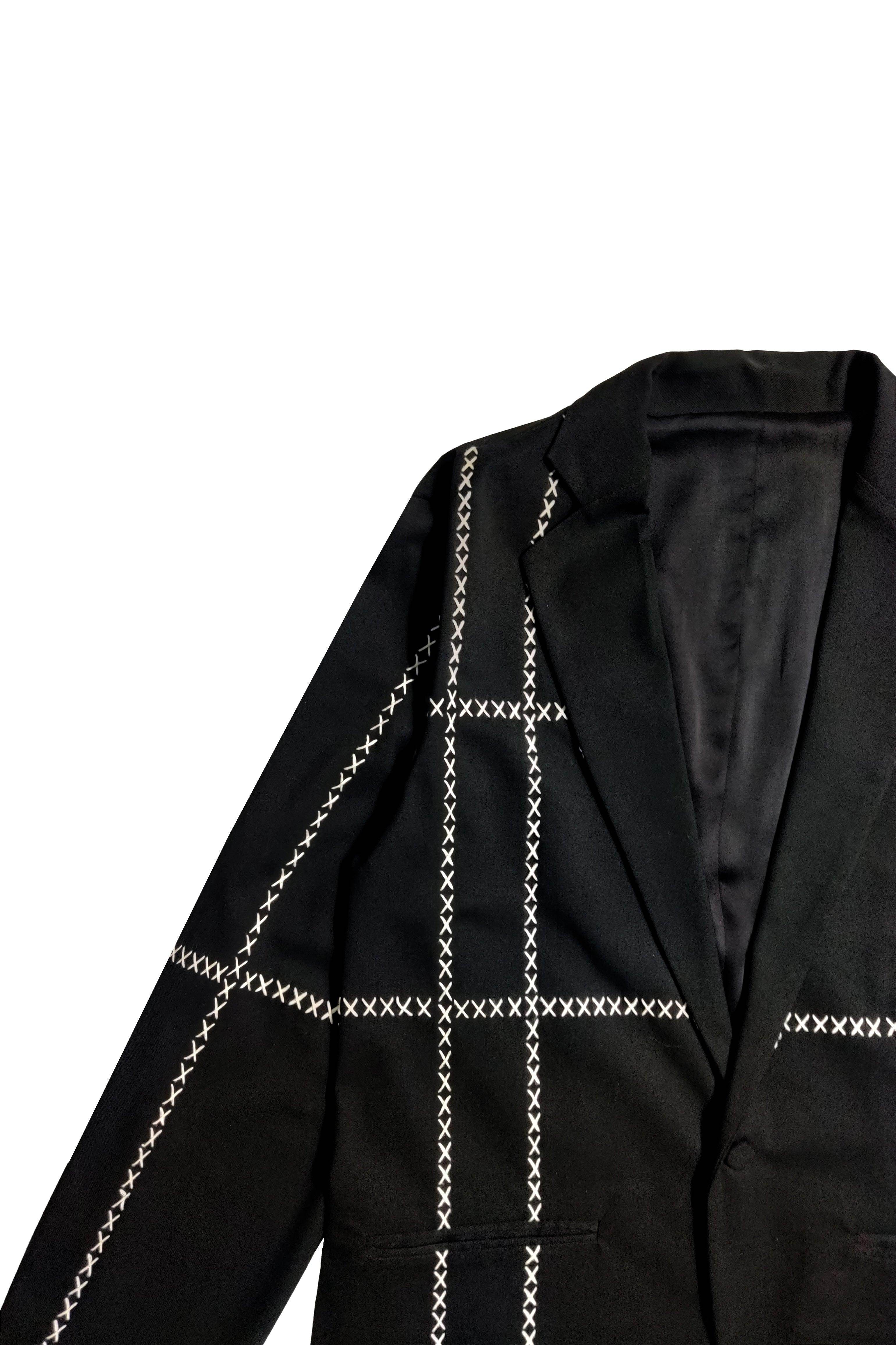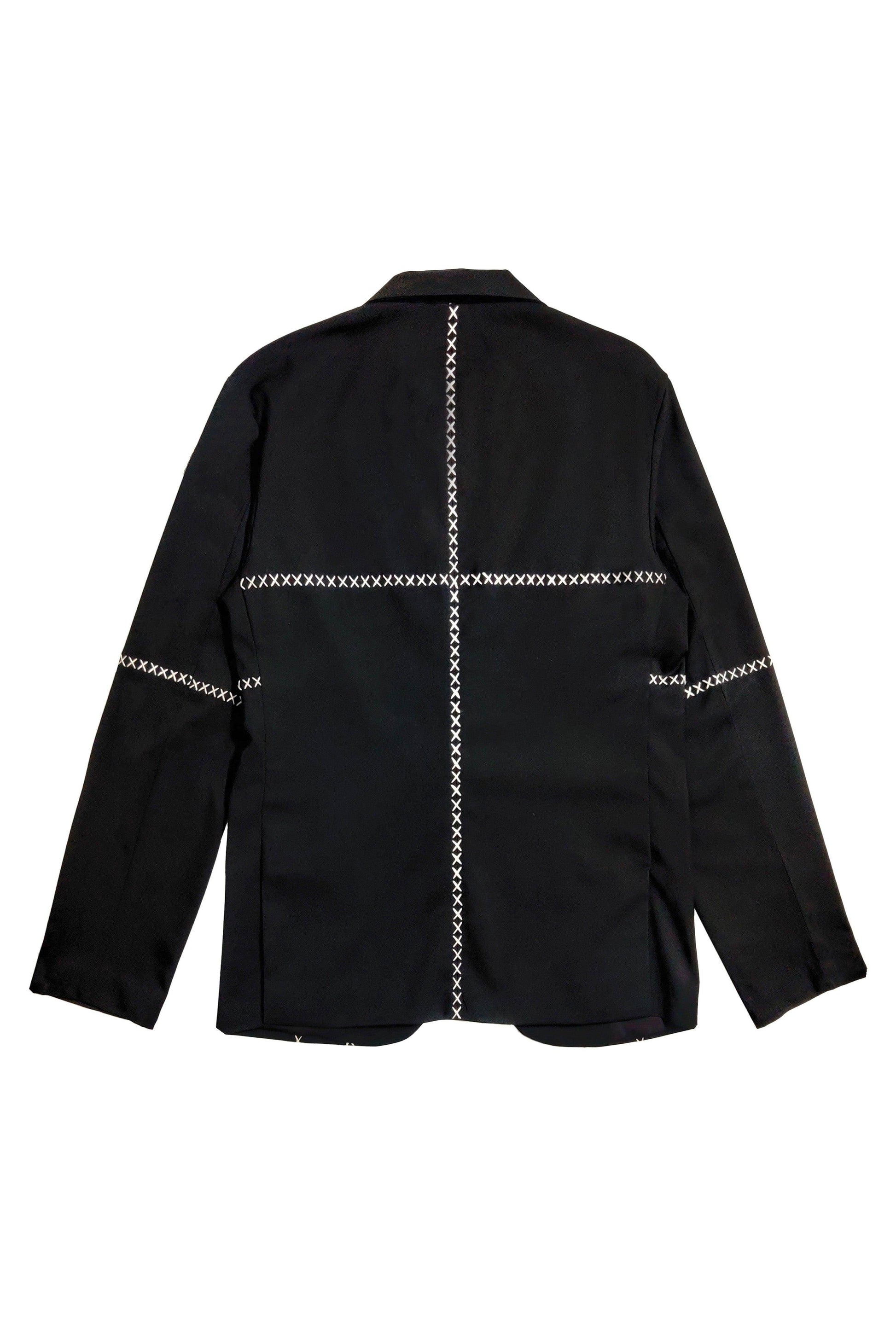 Black blazer jacket with geometric, hand-applied contrast cross-stitch detailing on the front, back, and sleeves. Pockets and single self-fabric button closure at the front. Vents on the sides. The back and front of the jacket are lined.