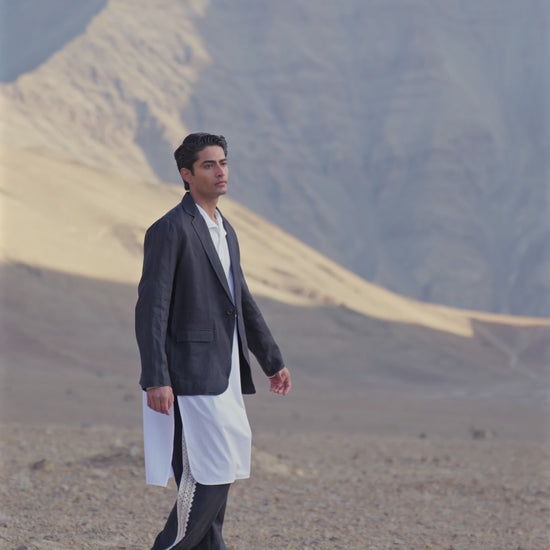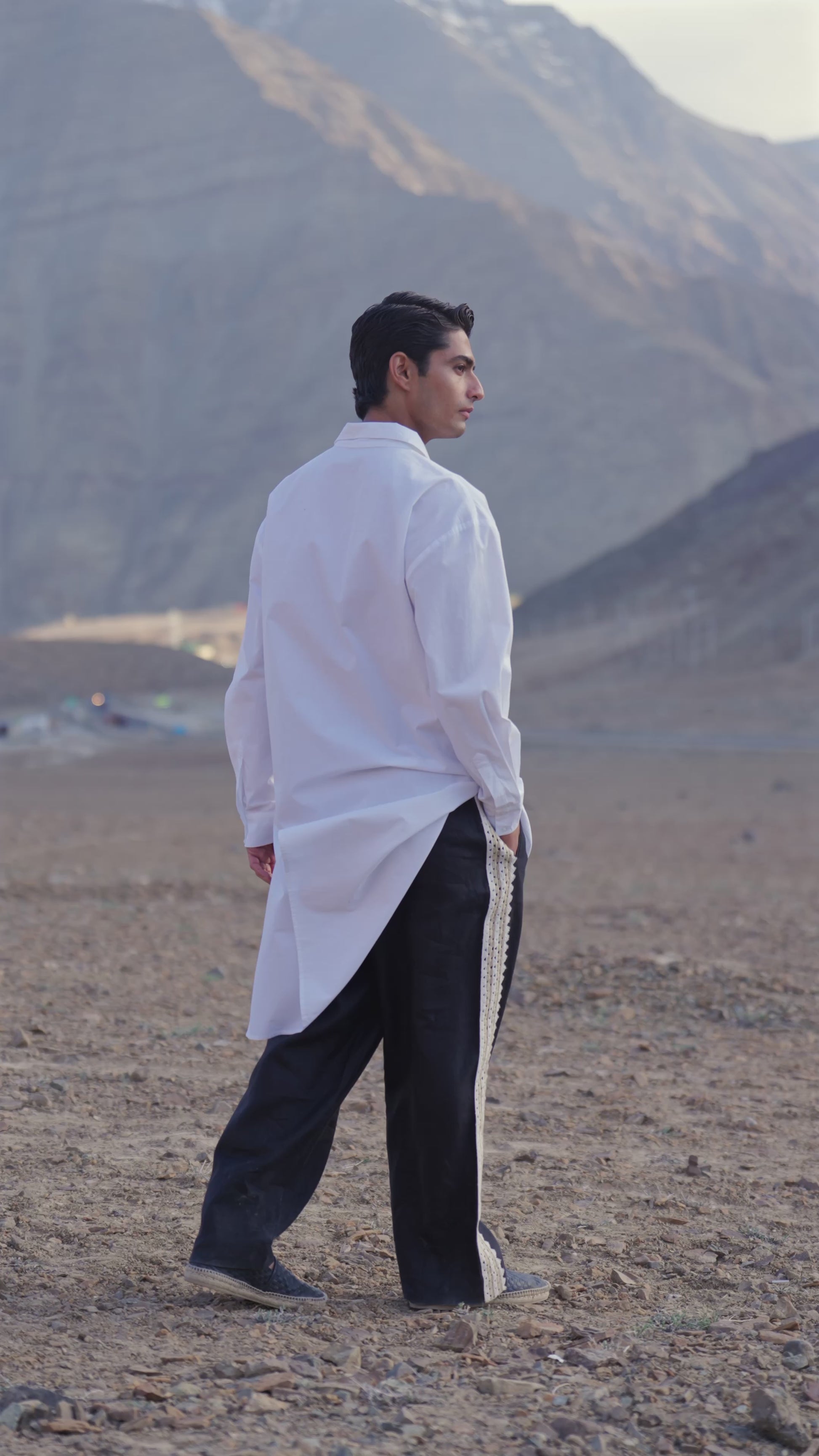 Black linen straight-cut pants with contrast khaki, beige and white crochet panels on the side seams. Fully elasticated waist. Pockets in the sides and back.