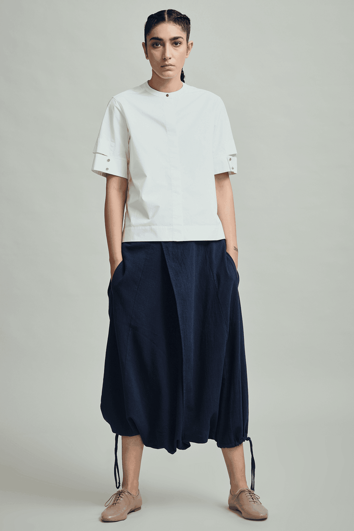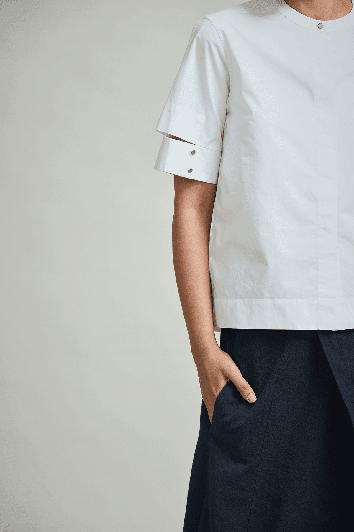 Boxy poplin short sleeve shirt with detached cuff detail. Band collar. Metal buttons on cuff and collar.