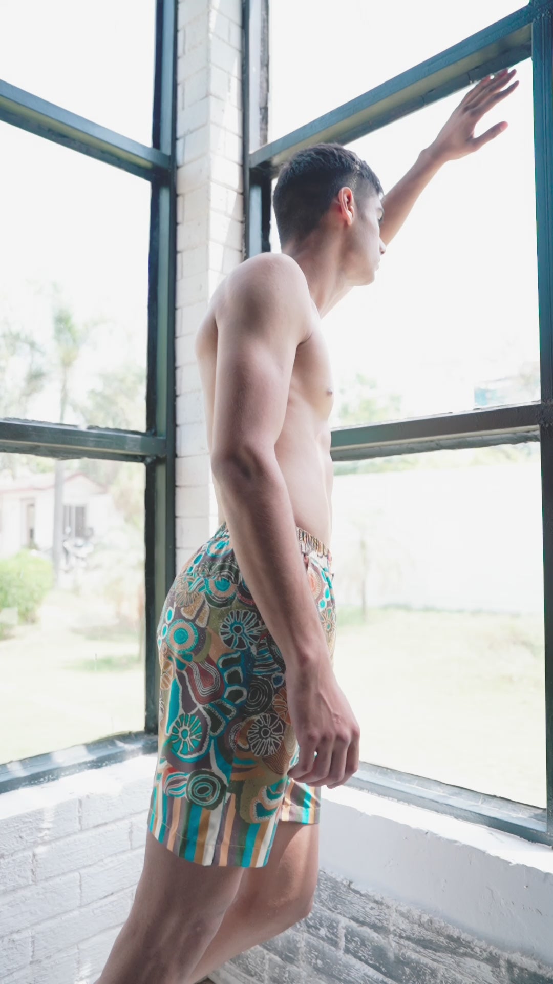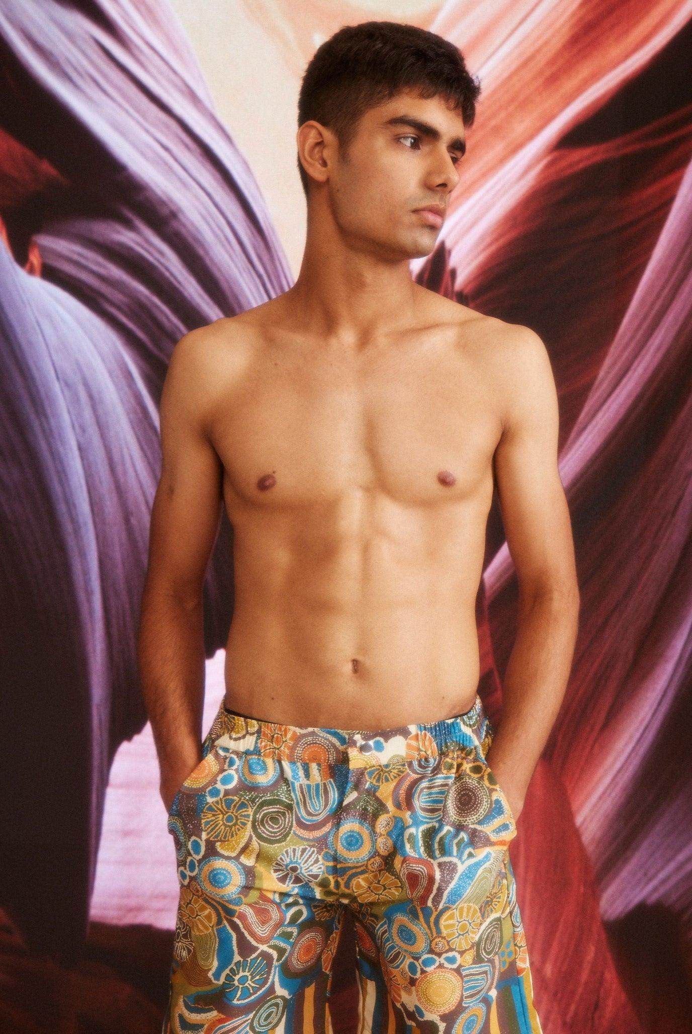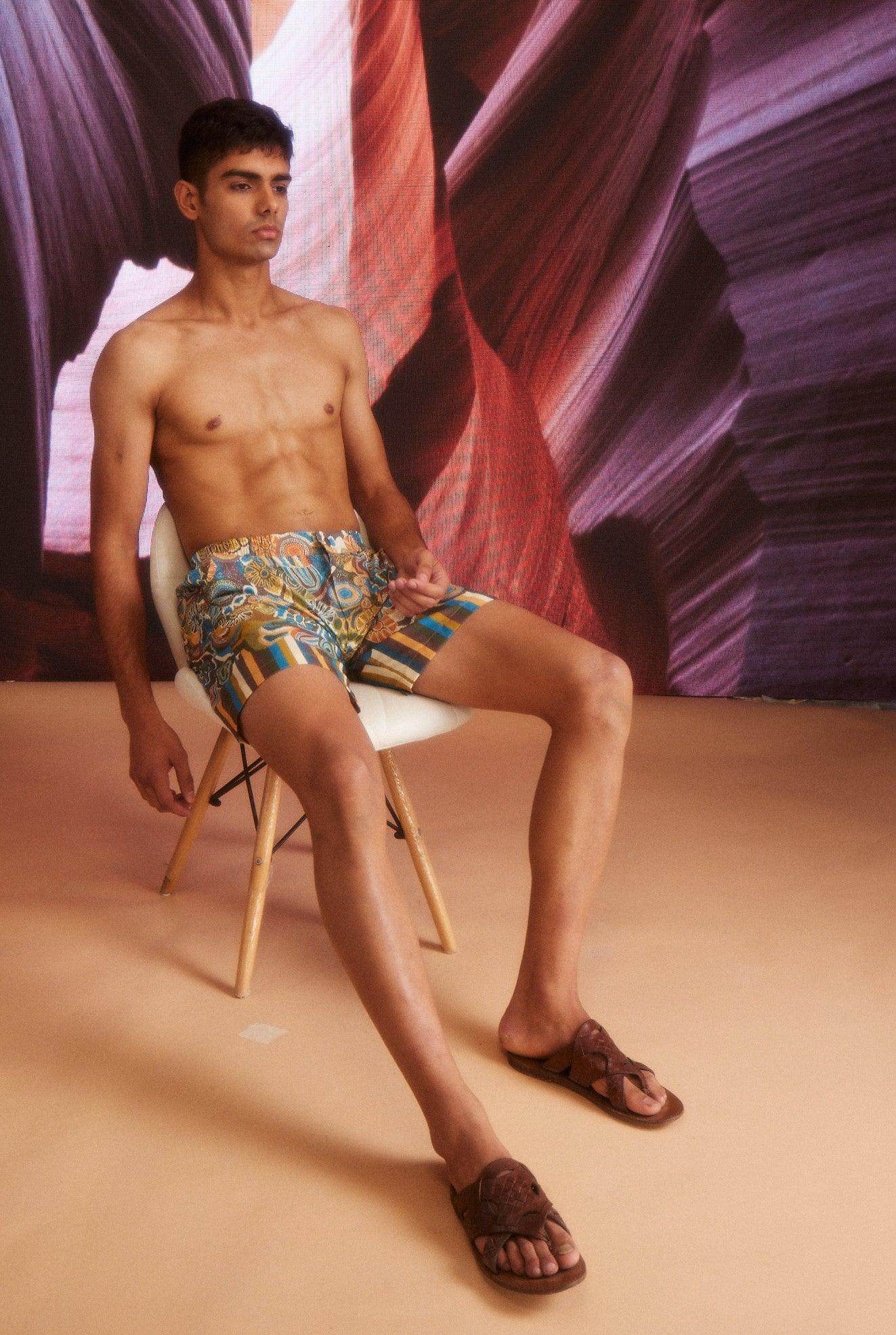 Abstract printed half sleeve swim shorts in earth tones. Elasticated at the back. Pockets on the side and back. Button closure and zip at the front. Placed stripe border on the hem of the shorts.